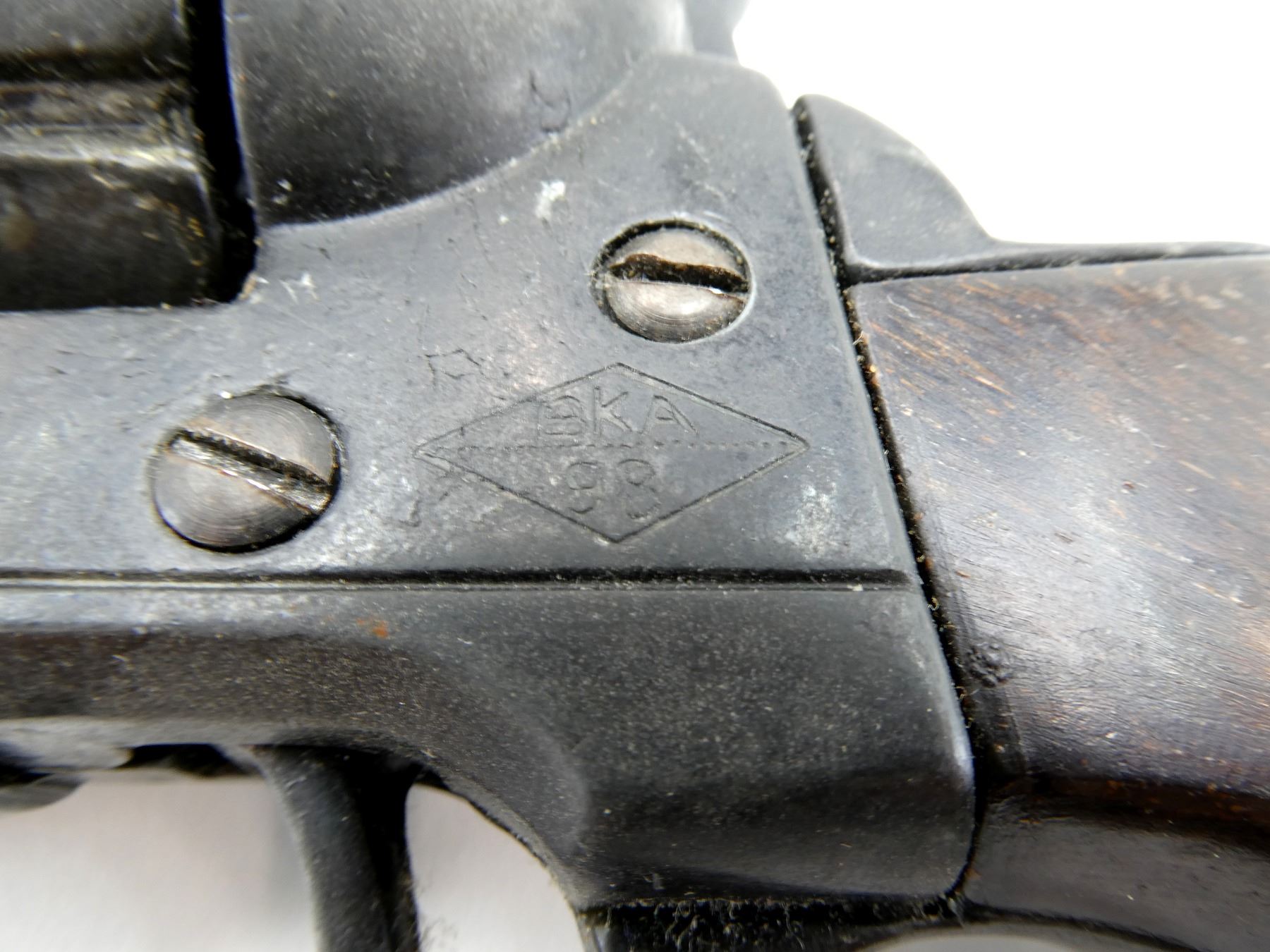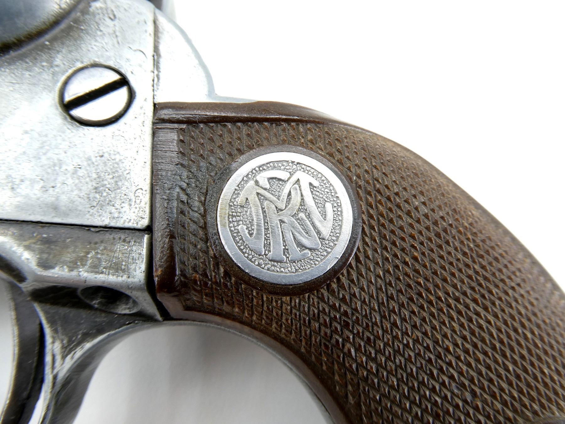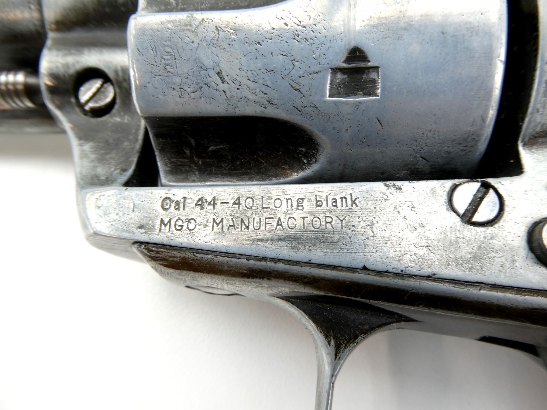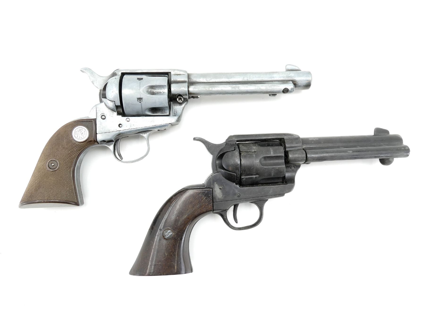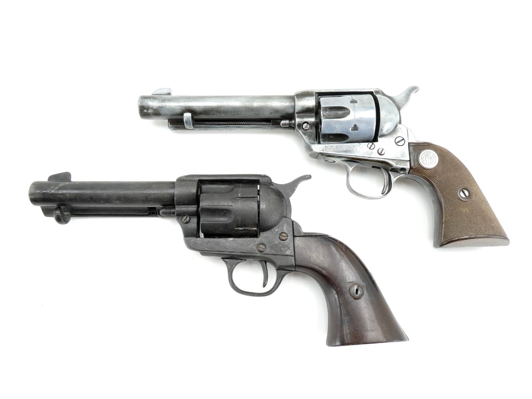 LOT INCLUDES; (1) REPRODUCTION REVOLVER, MARKED: "CAL 44-40 LONG BLANK, MGO MANUFACTORY" WITH EMBLEMS ON GRIPS, BROWN POLYMER CHECKERED GRIPS, ACTION DOES NOT WORK & (1) REPRODUCTION REVOLVER, MARKED: "BKA" OVER "98" IN DIAMOND SHAPE, BROWN POLYMER GRIPS, NO COCKING ISSUES, CYLINDER ROTATES, NOT FULLY TESTED. SEE PHOTOS.