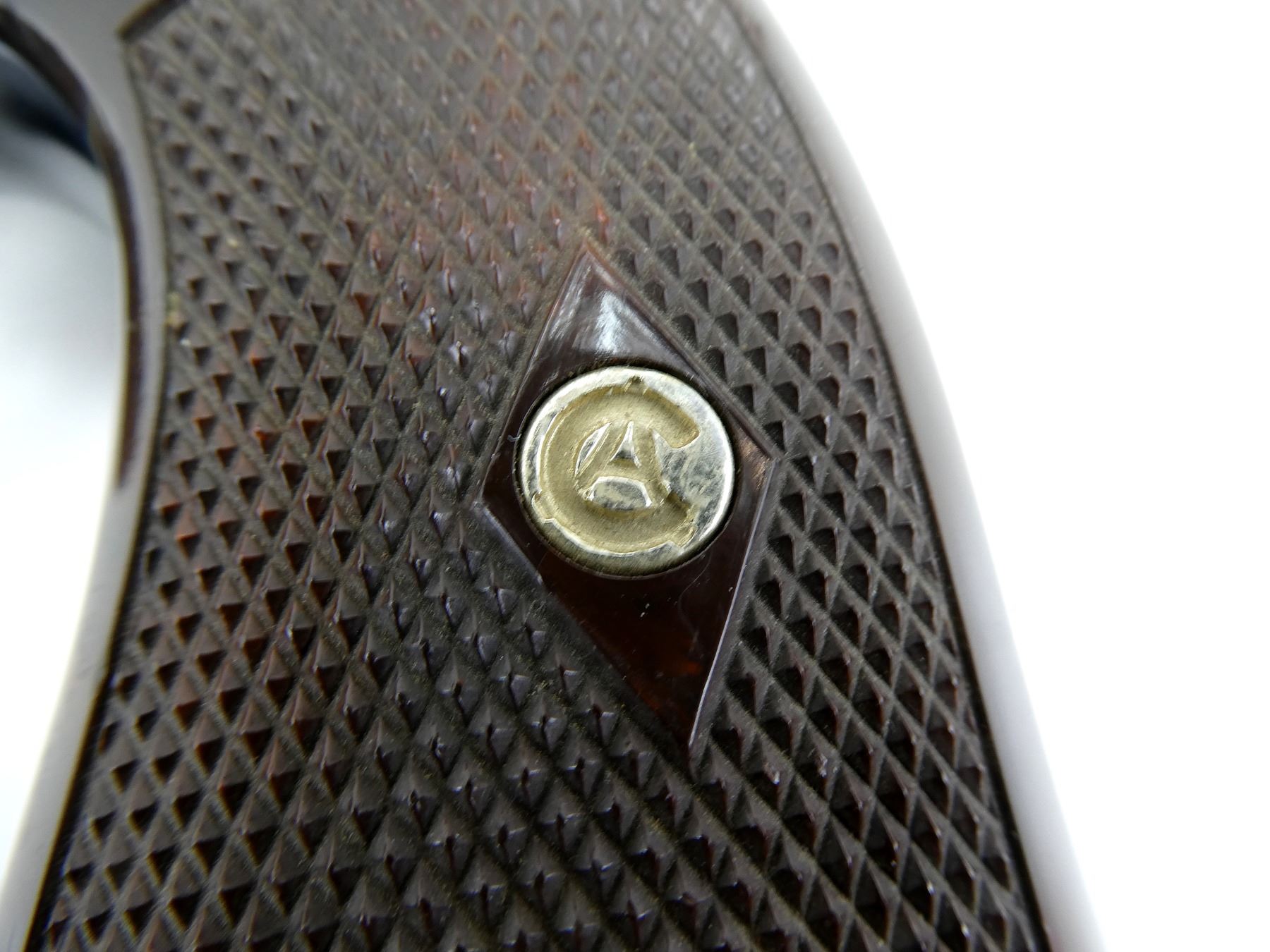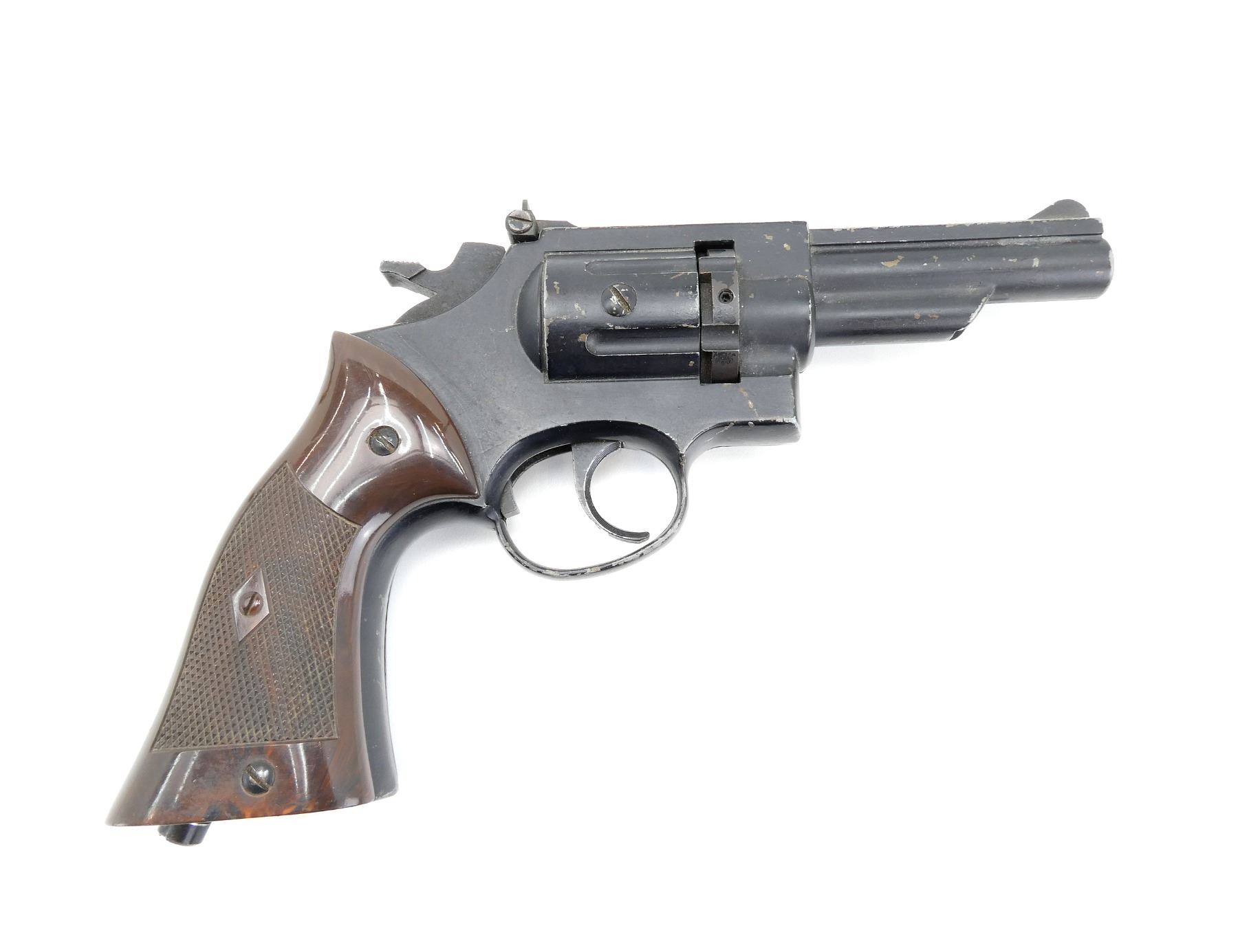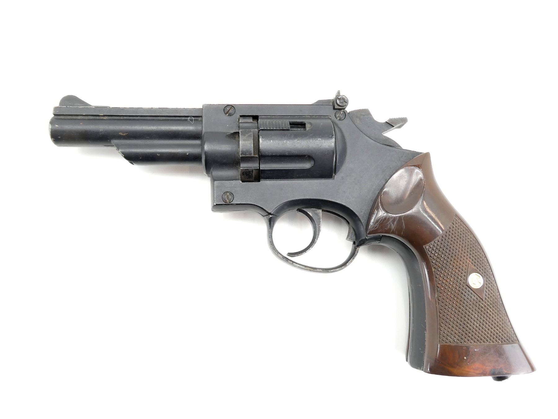 (1) .22 CAL. AIR PISTOL, CO2 POWERED, SIX SHOT, CYLINDER ROTATES, STEEL / BROWN POLYMER CONSTRUCTION, NO VISIBLE MARKINGS, NO COCKING ISSUES, NOT FULLY TESTED. SEE PHOTOS.