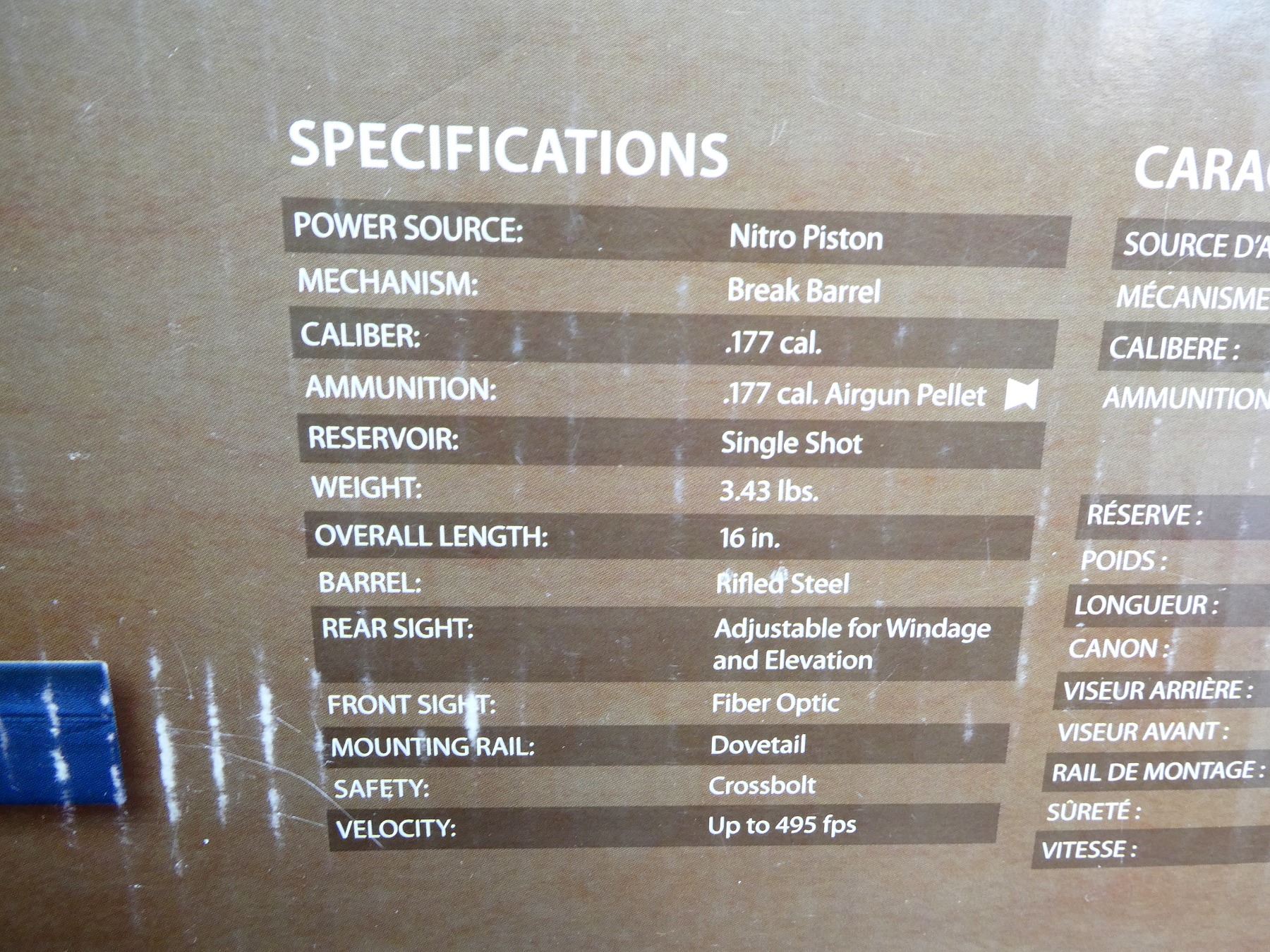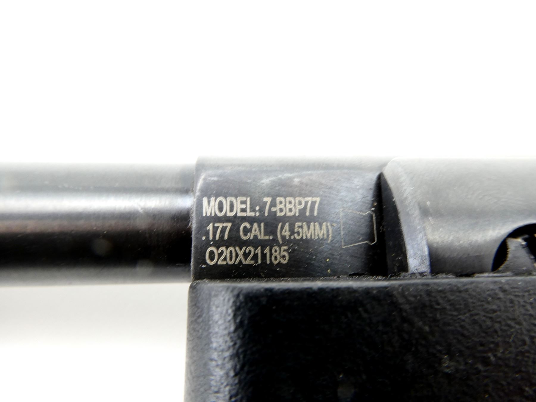 (1) .177 CAL PELLET, SPRING / AIR POWERED, SINGLE SHOT, STEEL AND BLACK POLYMER CONSTRUCTION, MARKED "MODEL: 7-BBP77", ".177 CAL", "O20X21185", "NITRO PISTON", ETC., UP TO 495FT PER SECOND, NO ISSUES COCKING, UNTESTED, WITH INSTRUCTIONS AND ORIGINAL PACKAGING, MAY NOT BE COMPLETE. SEE PHOTOS.