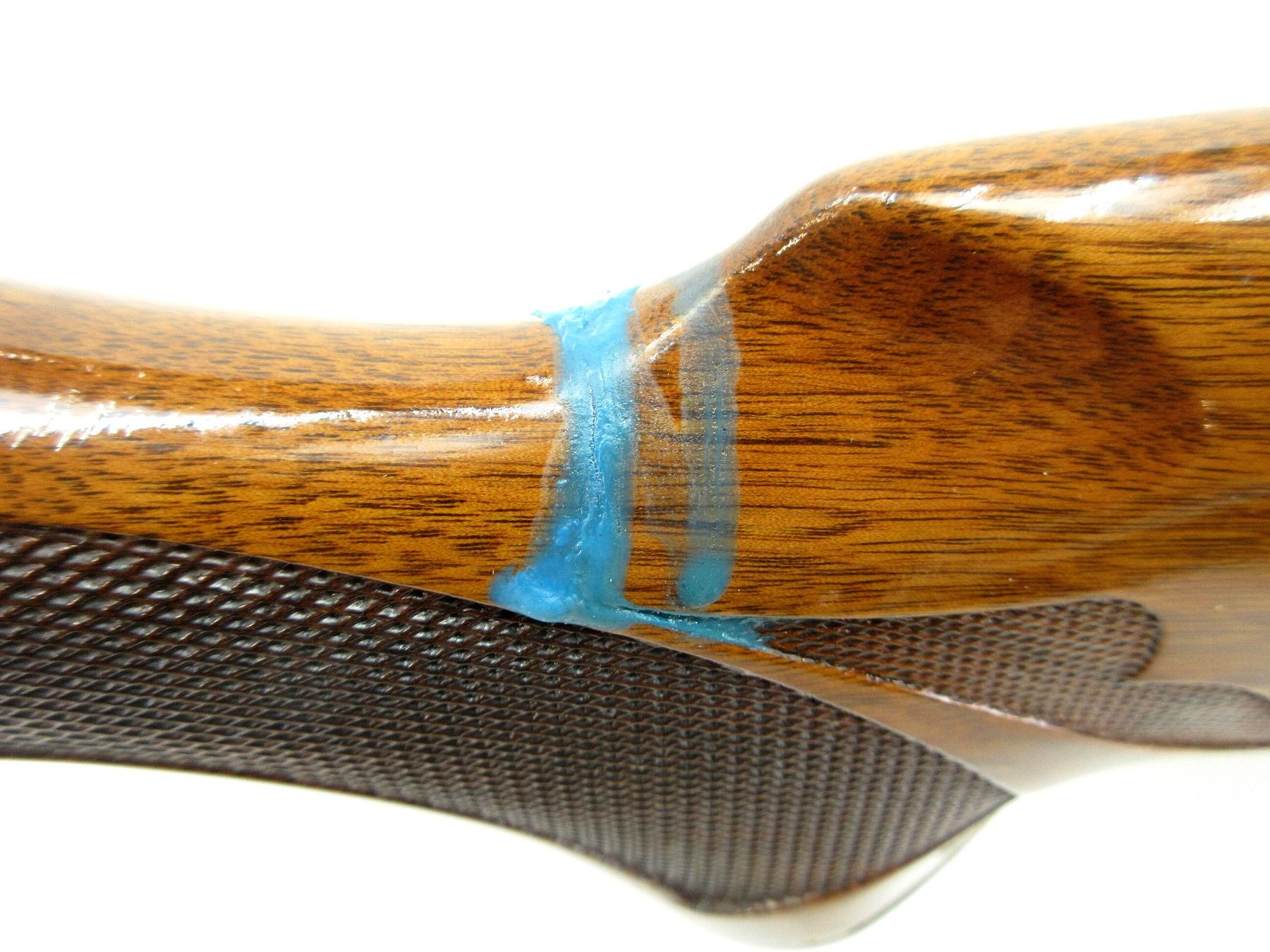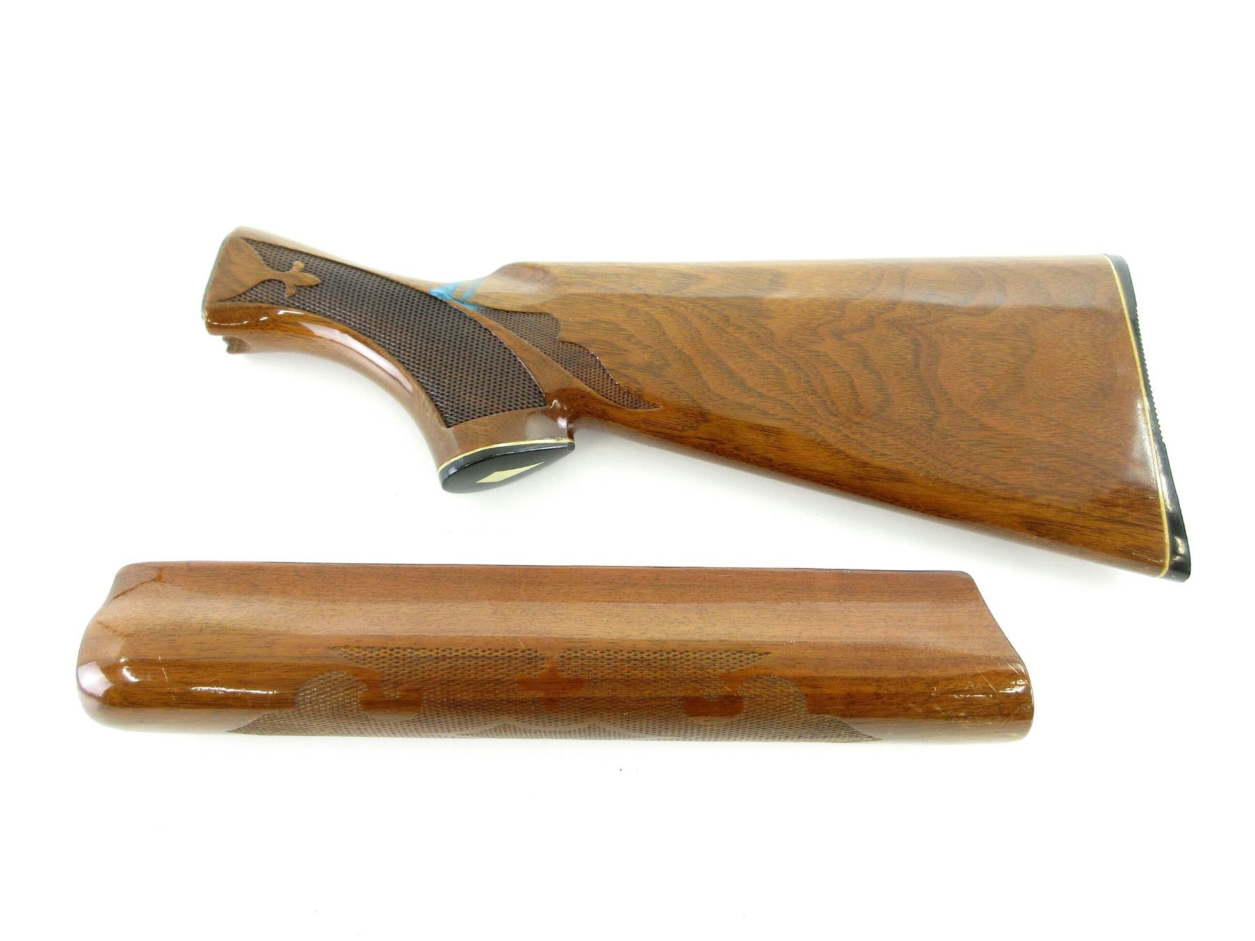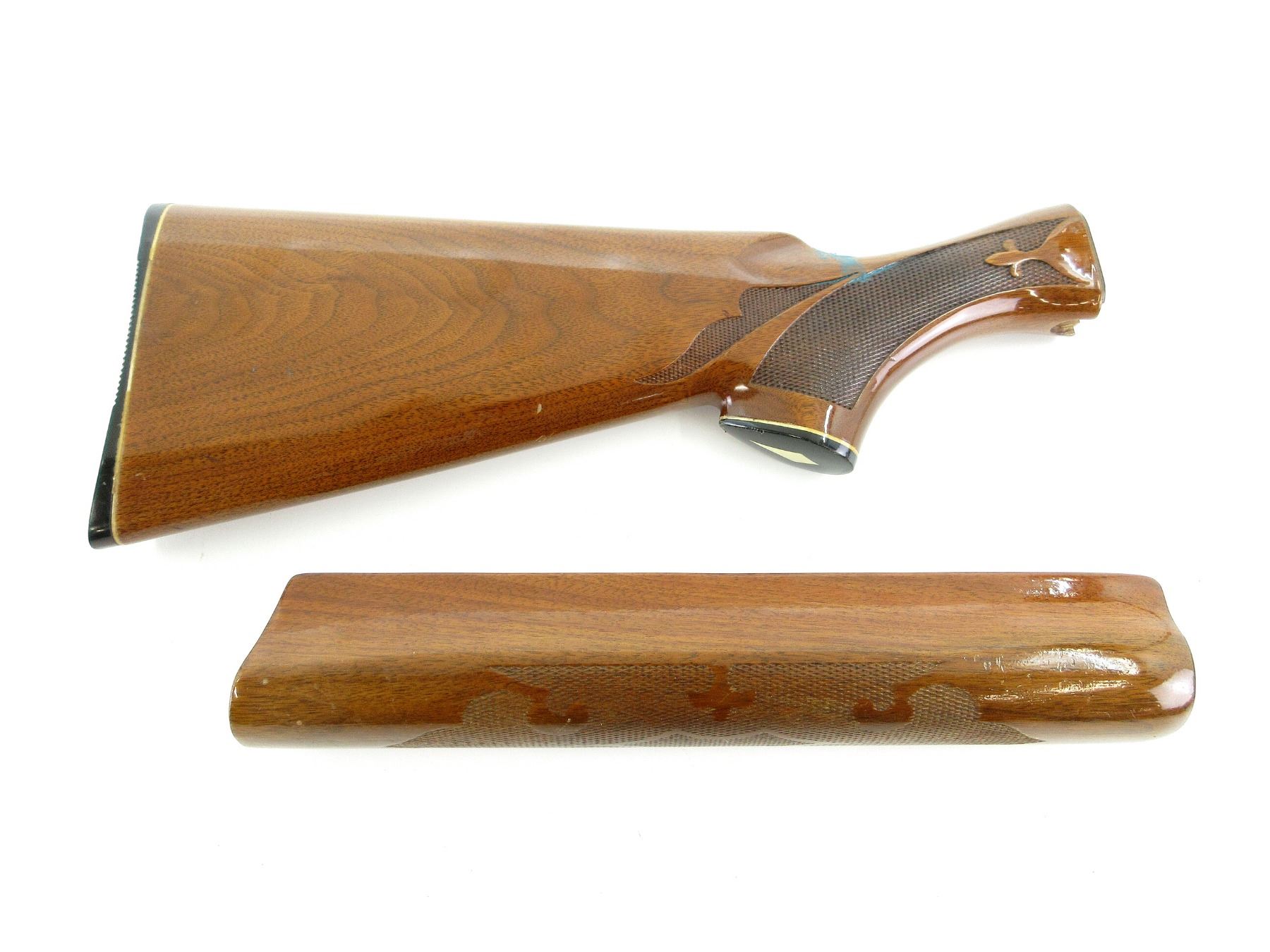 LOT INCLUDES; (1) REMINGTON 1100 SHOTGUN BUTT STOCK, WOOD CONSTRUCTION, SOME BLUE PAINT ON BUTT STOCK, CHECKERING ON GRIP, MARKED: "Y", WITH BUTT PLATE & GRIP CAP, BUTT PLATE MARKED: "REMINGTON" ETC., OAL APPROX. 14 5/8", MAY REQUIRE FITTING & (1) REMINGTON 1100 SHOTGUN FOREND, WOOD CONSTRUCTION, WITH SOME CHECKERING, OAL APPROX. 11 5/8", MAY REQUIRE FITTING. SEE PHOTOS.