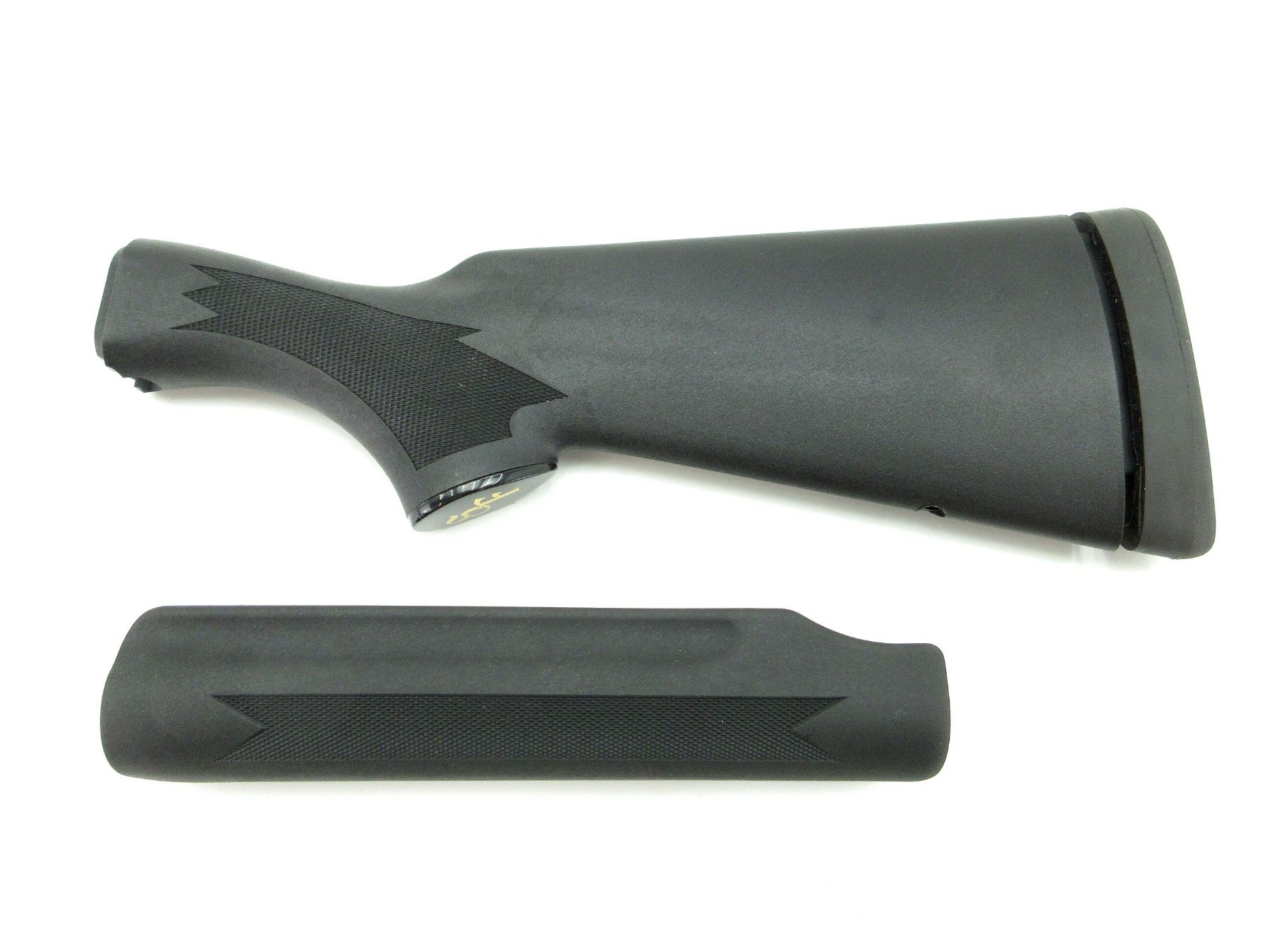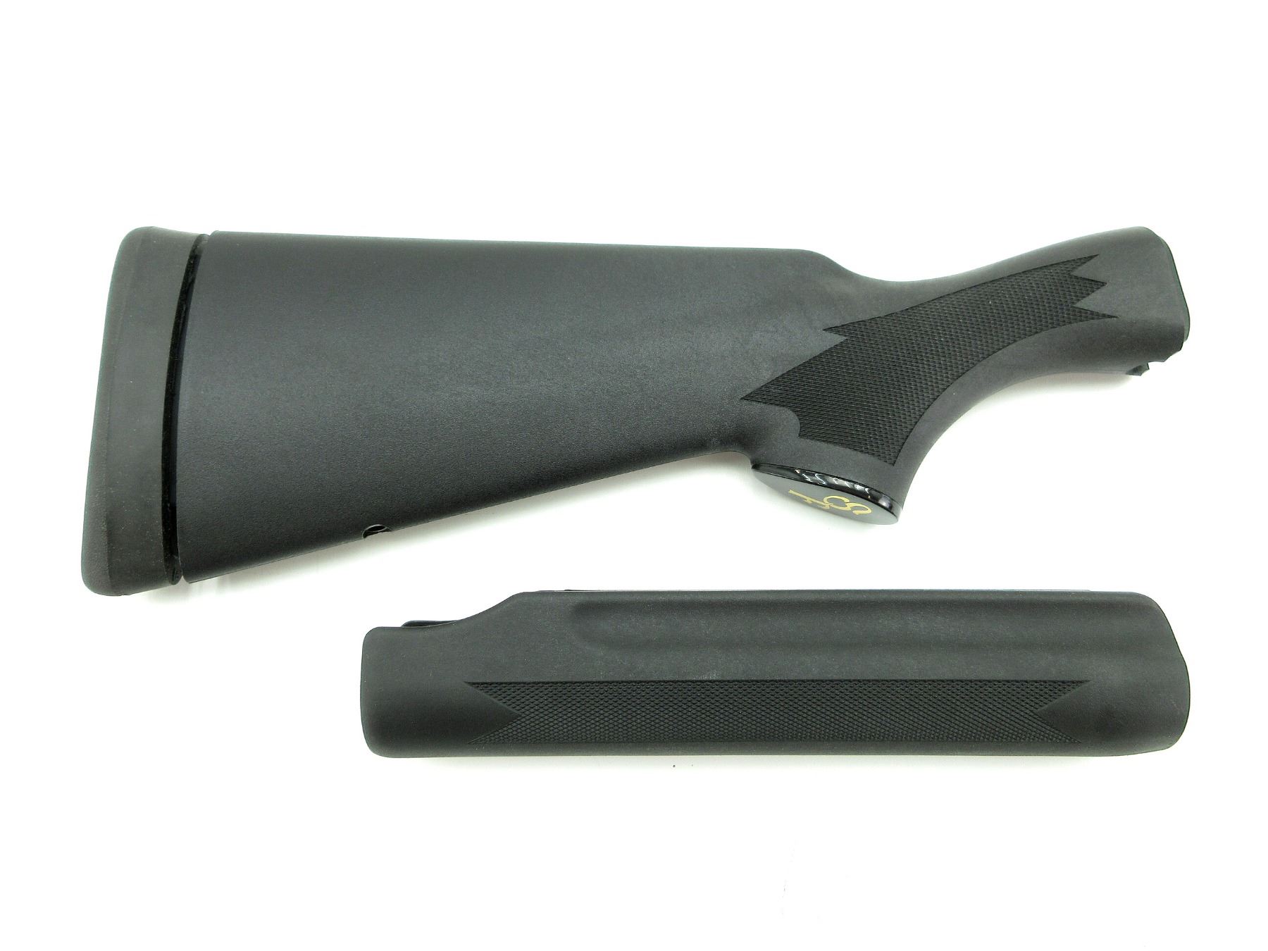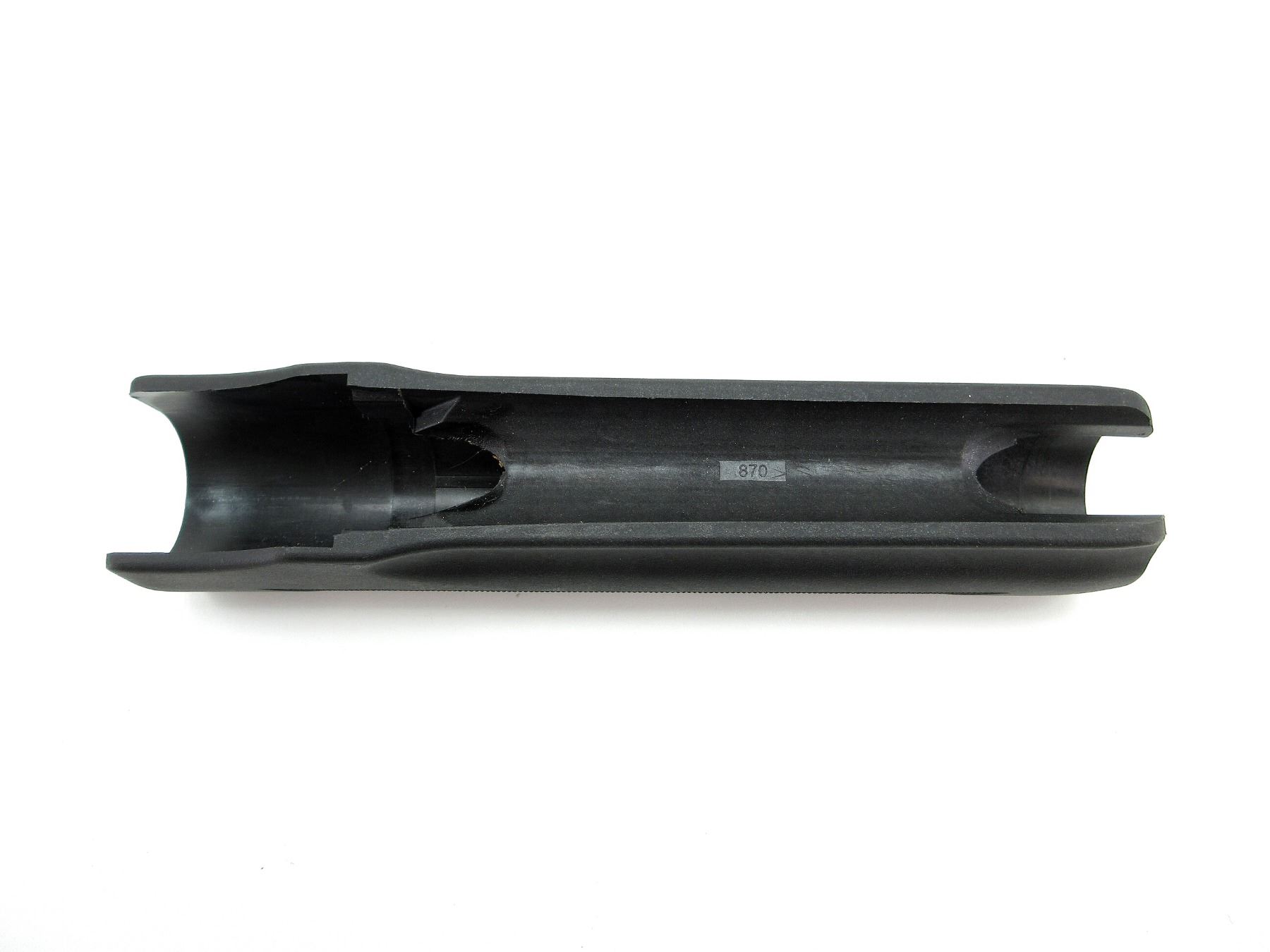LOT INCLUDES; (1) REMINGTON 870 SHOTGUN BUTT STOCK, BLACK POLYMER CONSTRUCTION, CHECKERING ON GRIP, WITH RUBBER RECOIL PAD, GRIP CAP & STOCK SCREW, OAL APPROX. 14.25", MAY REQUIRE FITTING & (1) REMINGTON 870 SHOTGUN FOREND, BLACK POLYMER CONSTRUCTION, WITH SOME CHECKERING, MARKED: "870", OAL APPROX. 9", MAY REQUIRE FITTING. SEE PHOTOS.