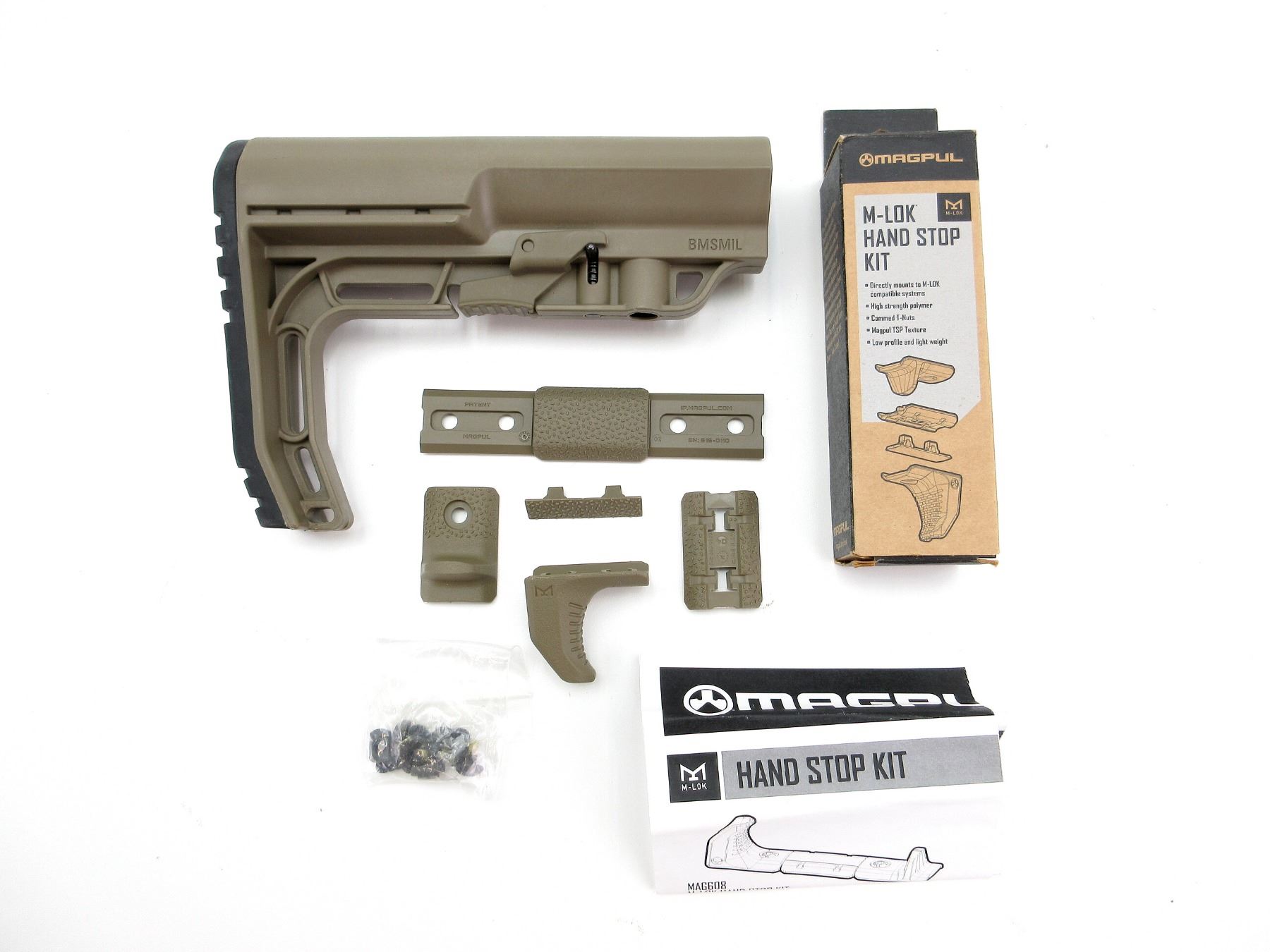 LOT INCLUDES; (1) MISSION FIRST TACTICAL AR-15 STOCK, TAN POLYMER CONSTRUCTION, MARKED: "MFT (MISSION FIRST TACTICAL)" & "BMSMIL", WITH RUBBER BUTT PLATE, OAL APPROX. 7 1/8" & (1) MAGPUL M-LOK HAND STOP KIT, MODEL FDE, TAN POLYMER CONSTRUCTION, APPEARS NOS, WITH ORIGINAL PACKAGING. SEE PHOTOS.