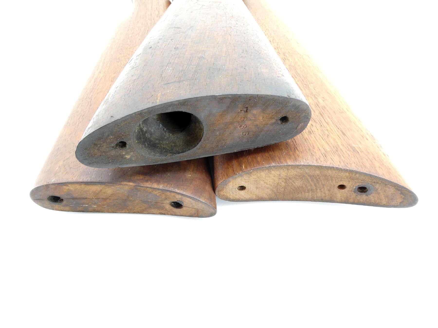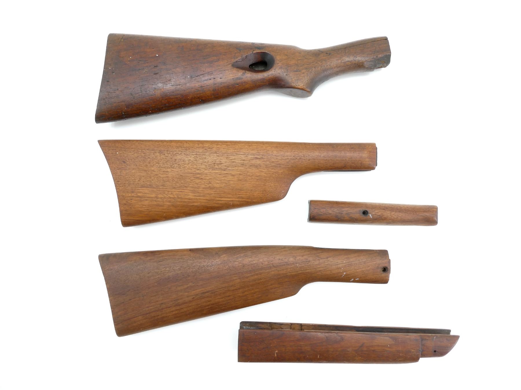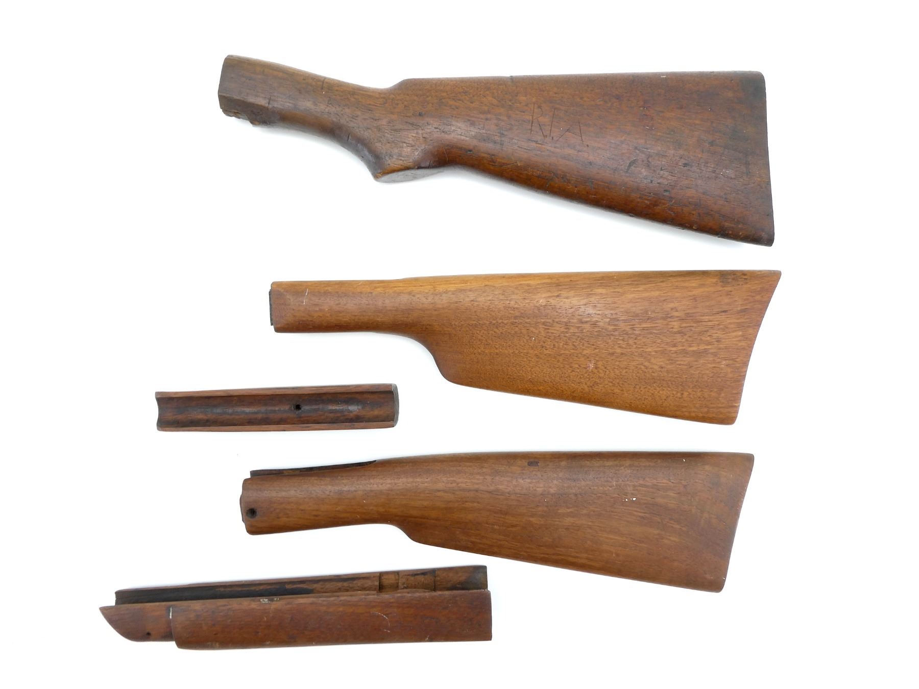 LOT INCLUDES; (1) STEVENS RIFLE BUTT STOCK, WOOD CONSTRUCTION, MARKED: "213", OAL APPROX. 12.75", (1) UNKNOWN BUTT STOCK, WOOD CONSTRUCTION, BUTT MARKED: "7636", CHIPPED / CRACKED AT ACTION, OAL APPROX. 14", (1) WINCHESTER RIFLE BUTT STOCK, WOOD CONSTRUCTION, NO VISIBLE MARKINGS, OAL APPROX. 13.25", (1) STEVENS RIFLE FOREND, WOOD CONSTRUCTION, NO VISIBLE MARKINGS, OAL APPROX. 6 1/8" & (1) UNKNOWN RIFLE FOREND, WOOD CONSTRUCTION, VARIOUS FAINT / UN-CLEAR MARKINGS, OAL APPROX. 9 7/8". SEE PHOTOS.