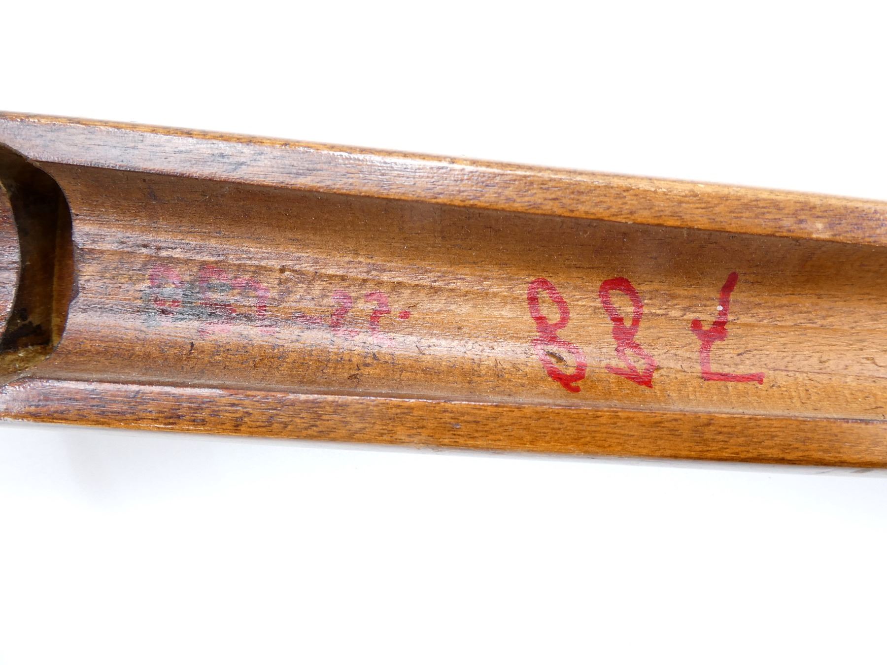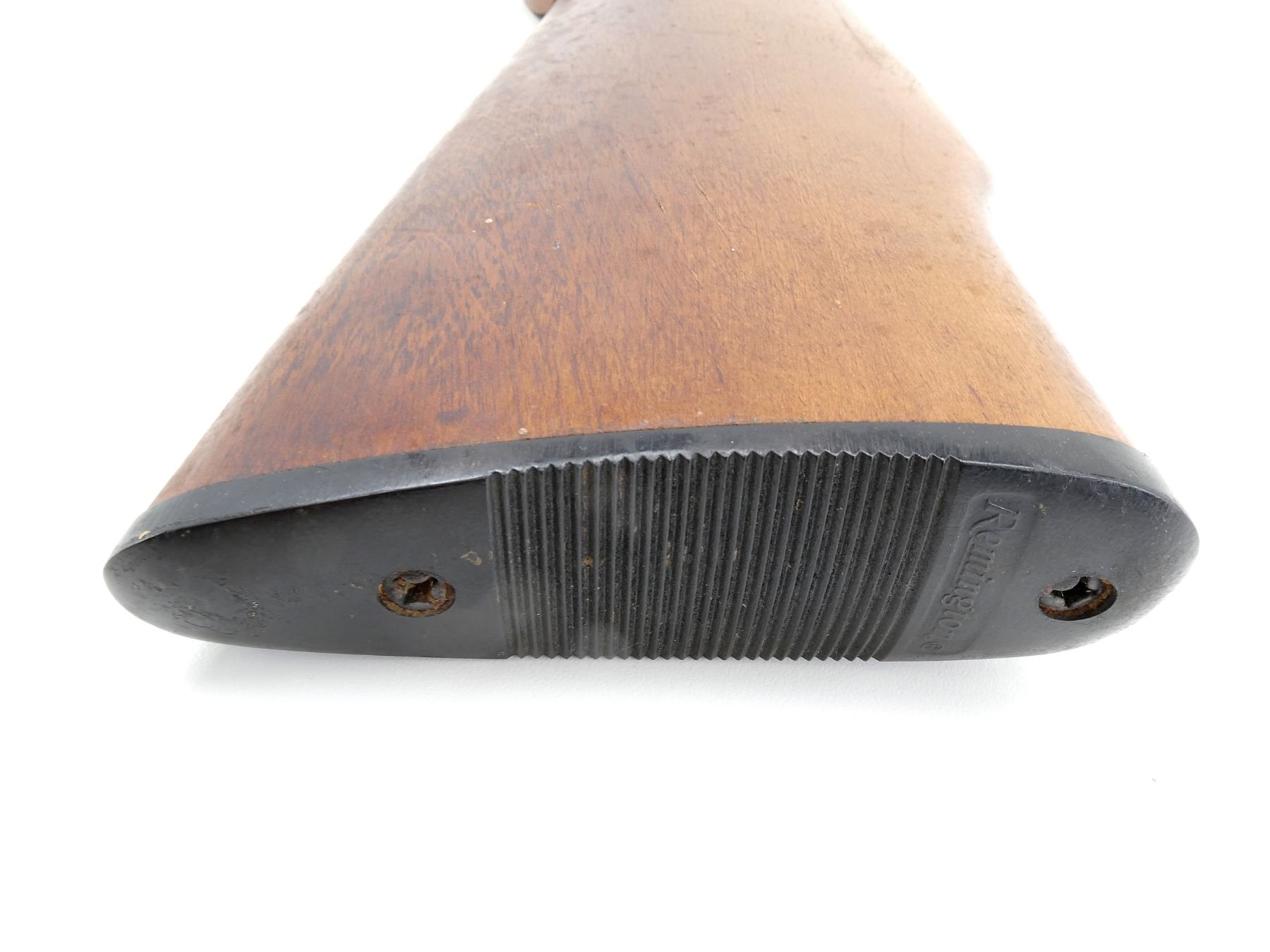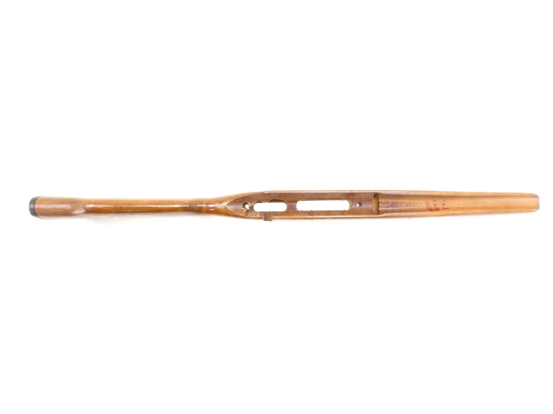 (1) WOOD CONSTRUCTION, RIGHT HANDED, NO VISIBLE CRACKS, VARIOUS HAND-WRITTEN MARKINGS, BLACK PLASTIC BUTT PLATE MARKED: "REMINGTON", SHOWS SOME WEAR, OAL APPROX. 30 5/8", MAY REQUIRE FITTING. SEE PHOTOS.