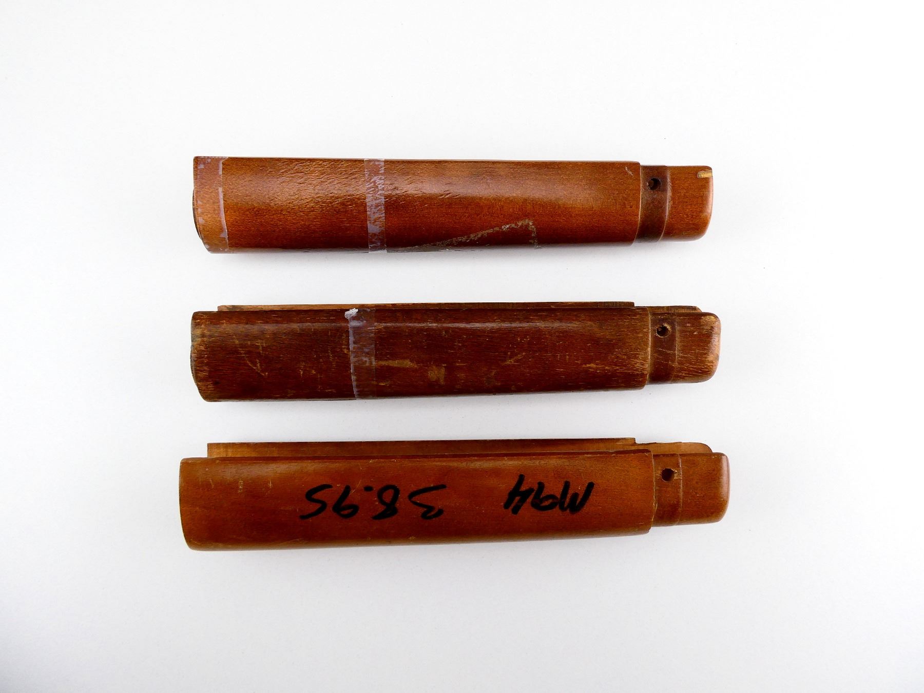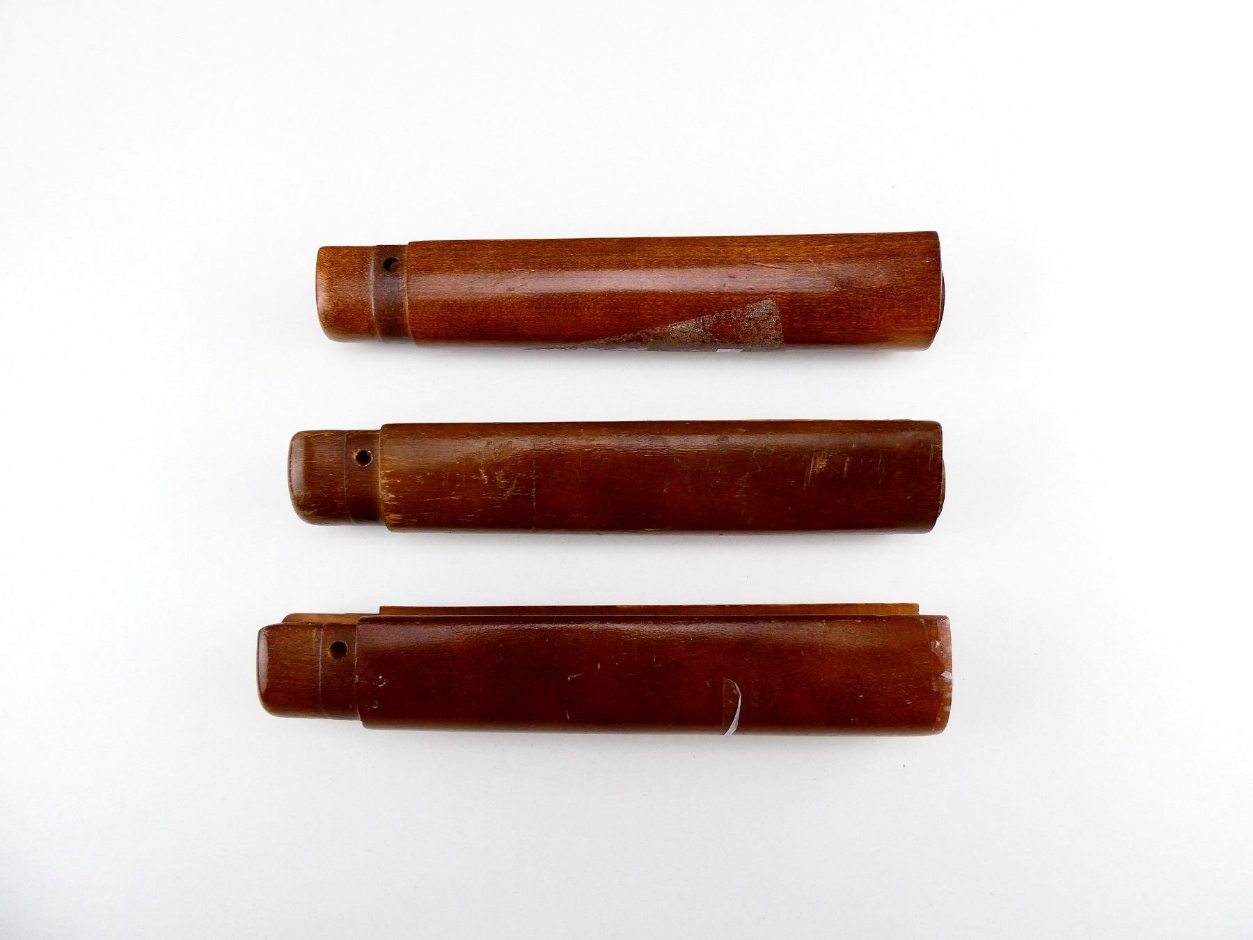 LOT INCLUDES; (3) WOODEN FORENDS, MAY HAVE SMALL CRACKS & CHIPS, OAL APPROX. 8". MAY REQUIRE FITTING. SEE PHOTOS.