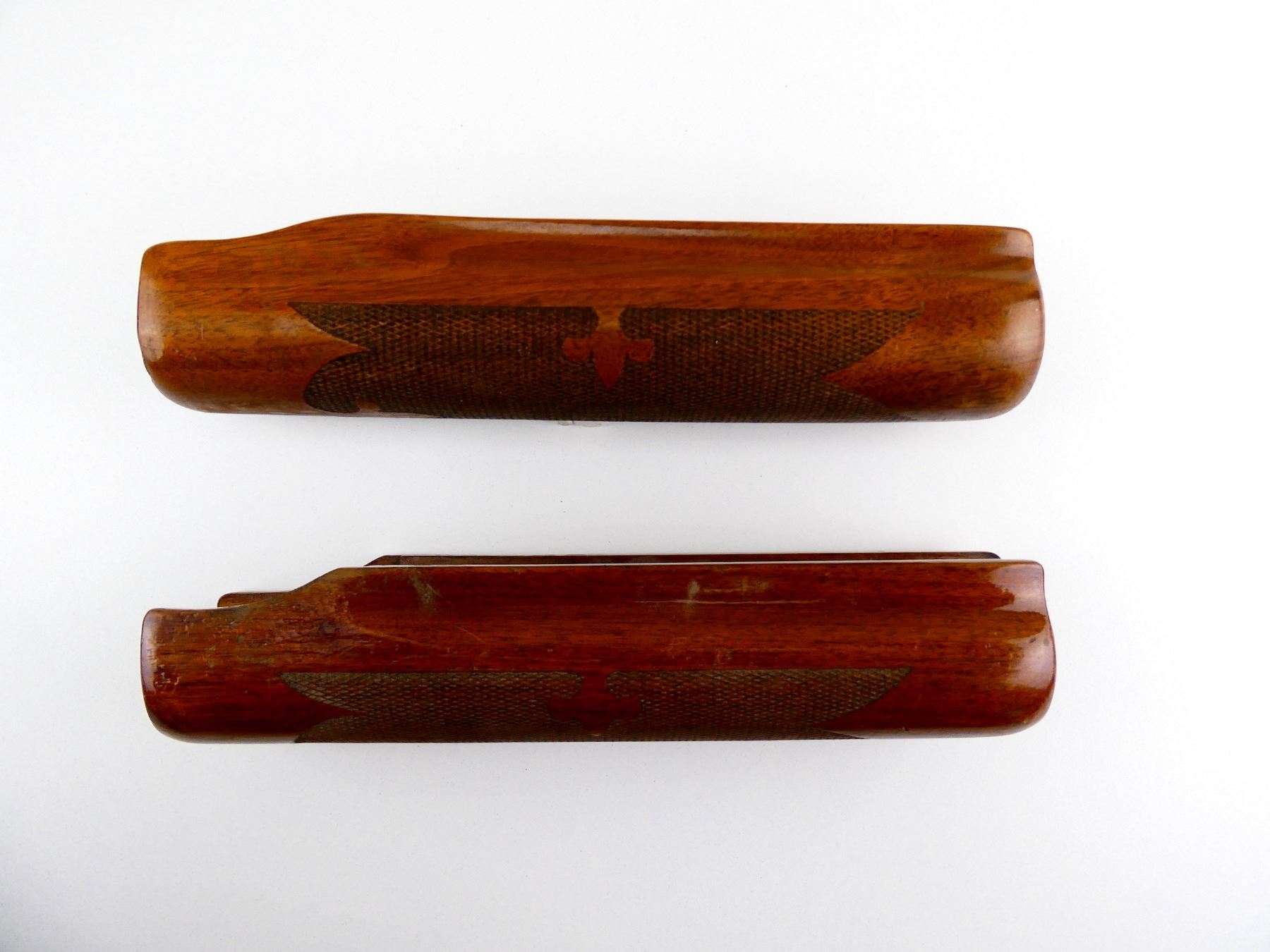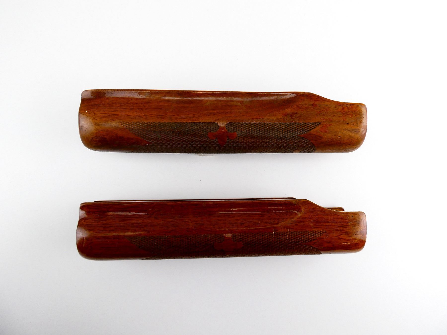 LOT INCLUDES; (2) WOODEN FORENDS, FLEUR-DE-LIS CHECKERING, MAY HAVE SMALL CRACKS & CHIPS, OAL APPROX. 9". MAY REQUIRE FITTING. SEE PHOTOS.