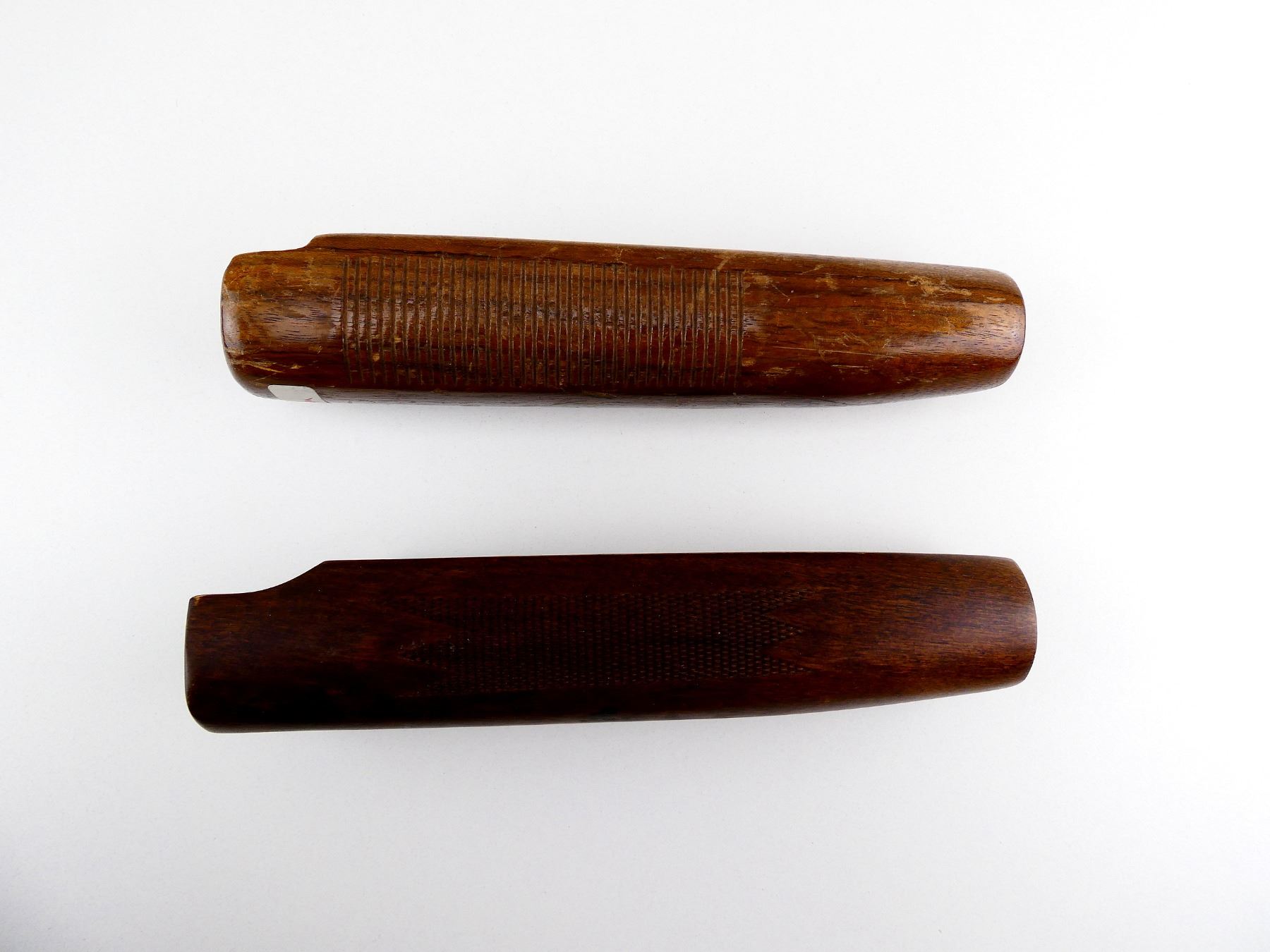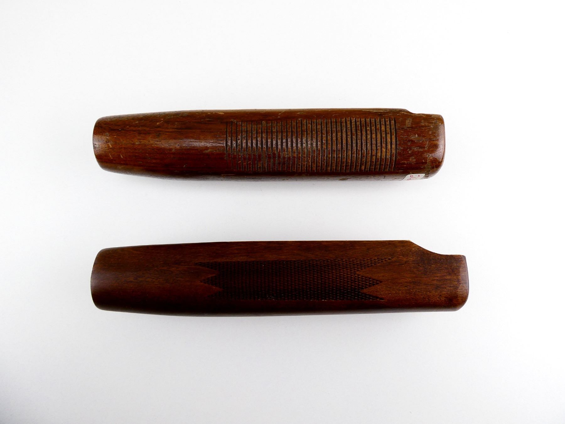 LOT INCLUDES; (1) 20 G. WOODEN FOREND, GROOVED, OAL APPROX. 9" & (1) 12 G. WOODEN FOREND, CHECKERED, OAL APPROX. 9". MAY REQUIRE FITTING. SEE PHOTOS.