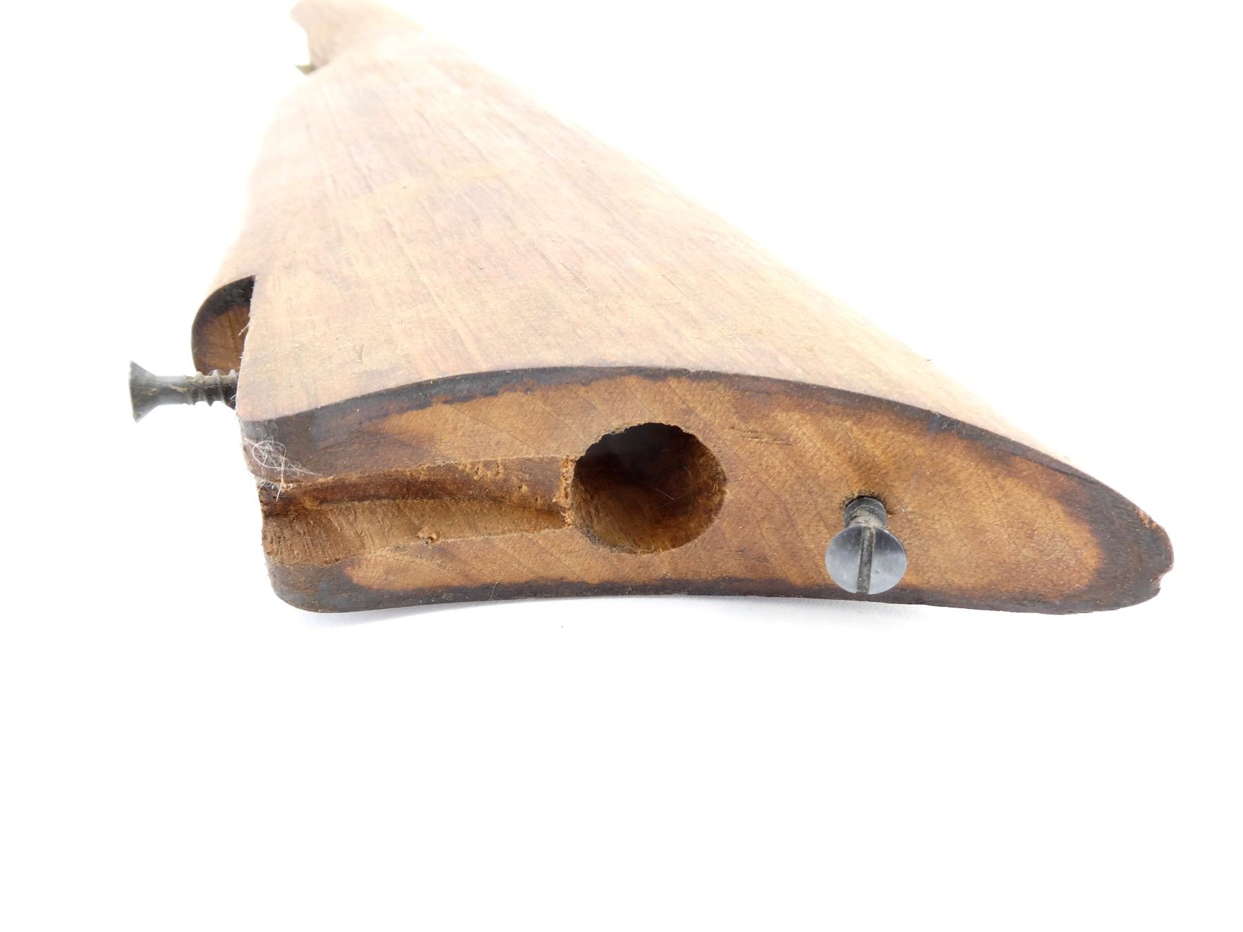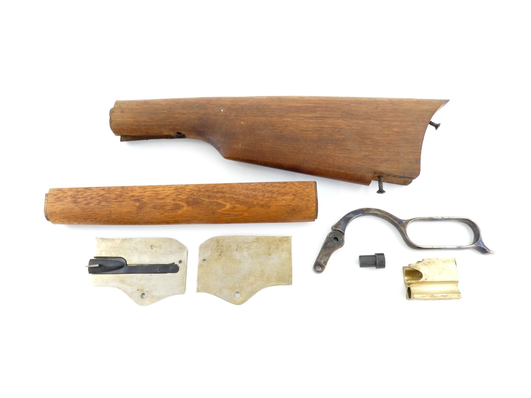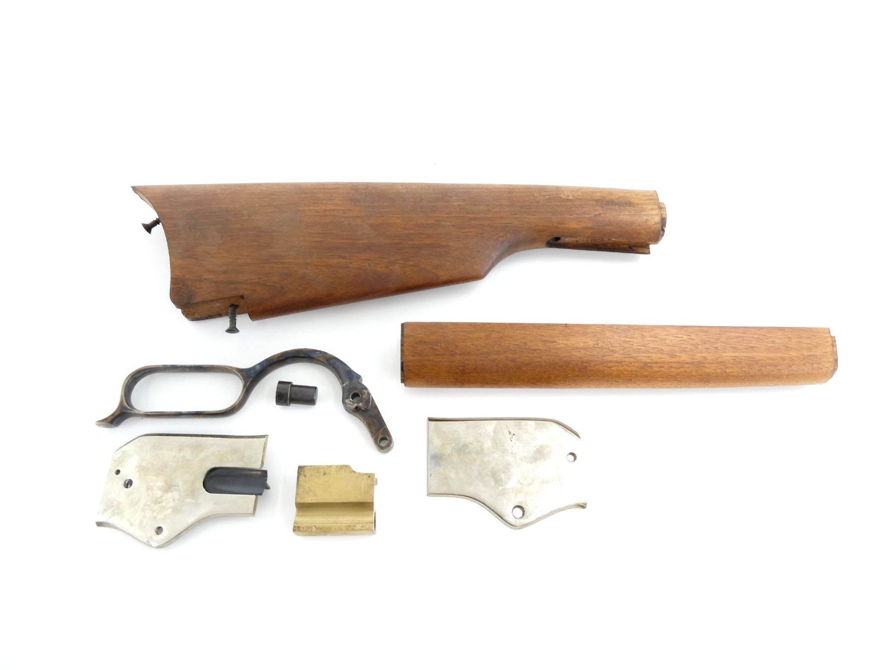 LOT INCLUDES; (1) WOODEN STRAIGHT-GRIP BUTT STOCK WITH TWO SCREWS, OAL APPROX. 13", (1) WOODEN FOREARM, SMOOTH, FITS OCTAGON BARREL, OAL APPROX. 9.75", (2) SIDE PLATES WITH LOADING GATE, (1) BRASS LIFTER, (1) COLOUR CASE HARDENED LEVER & FOLLOWER, ETC. MAY REQUIRE FITTING. SEE PHOTOS.