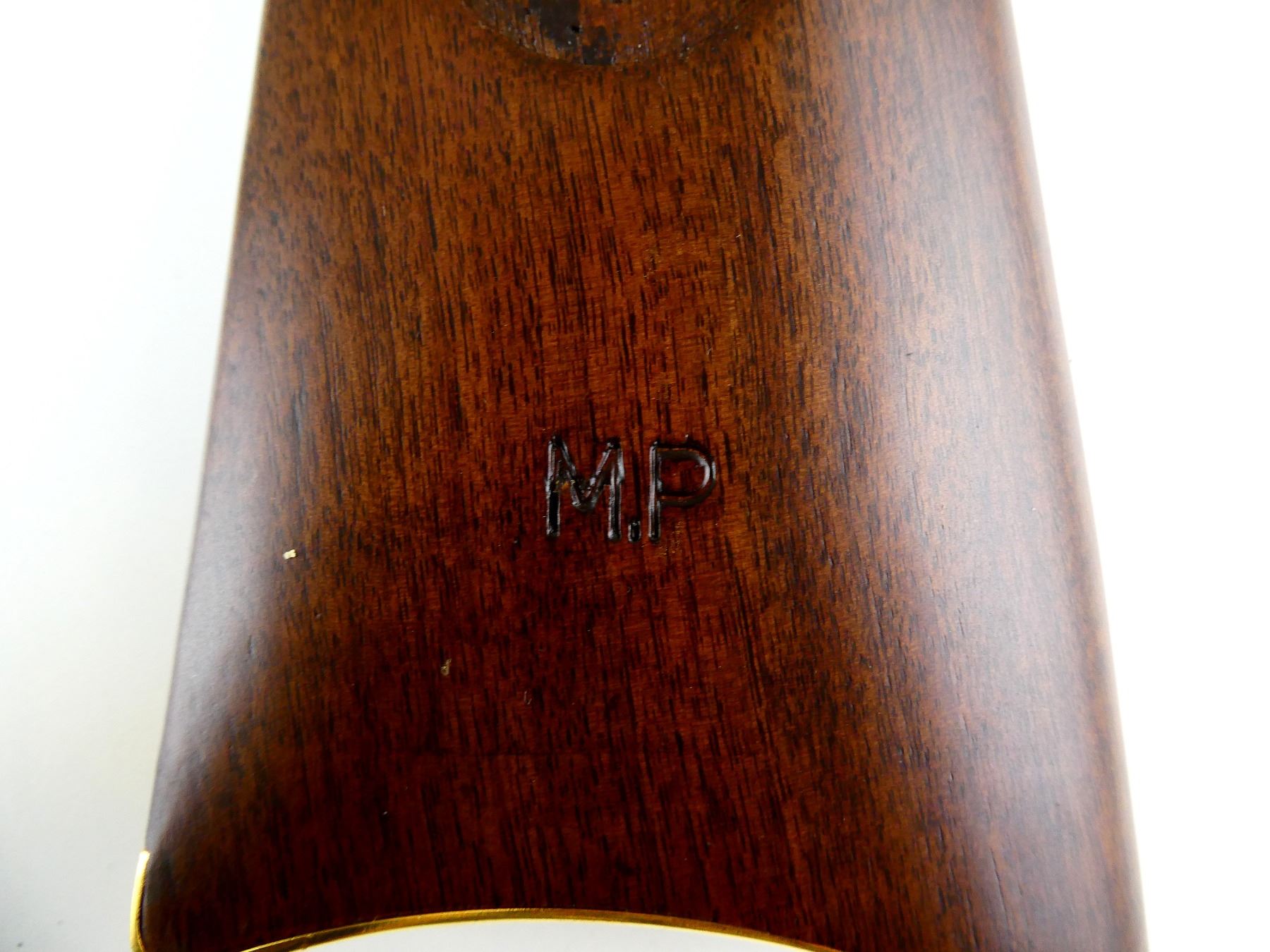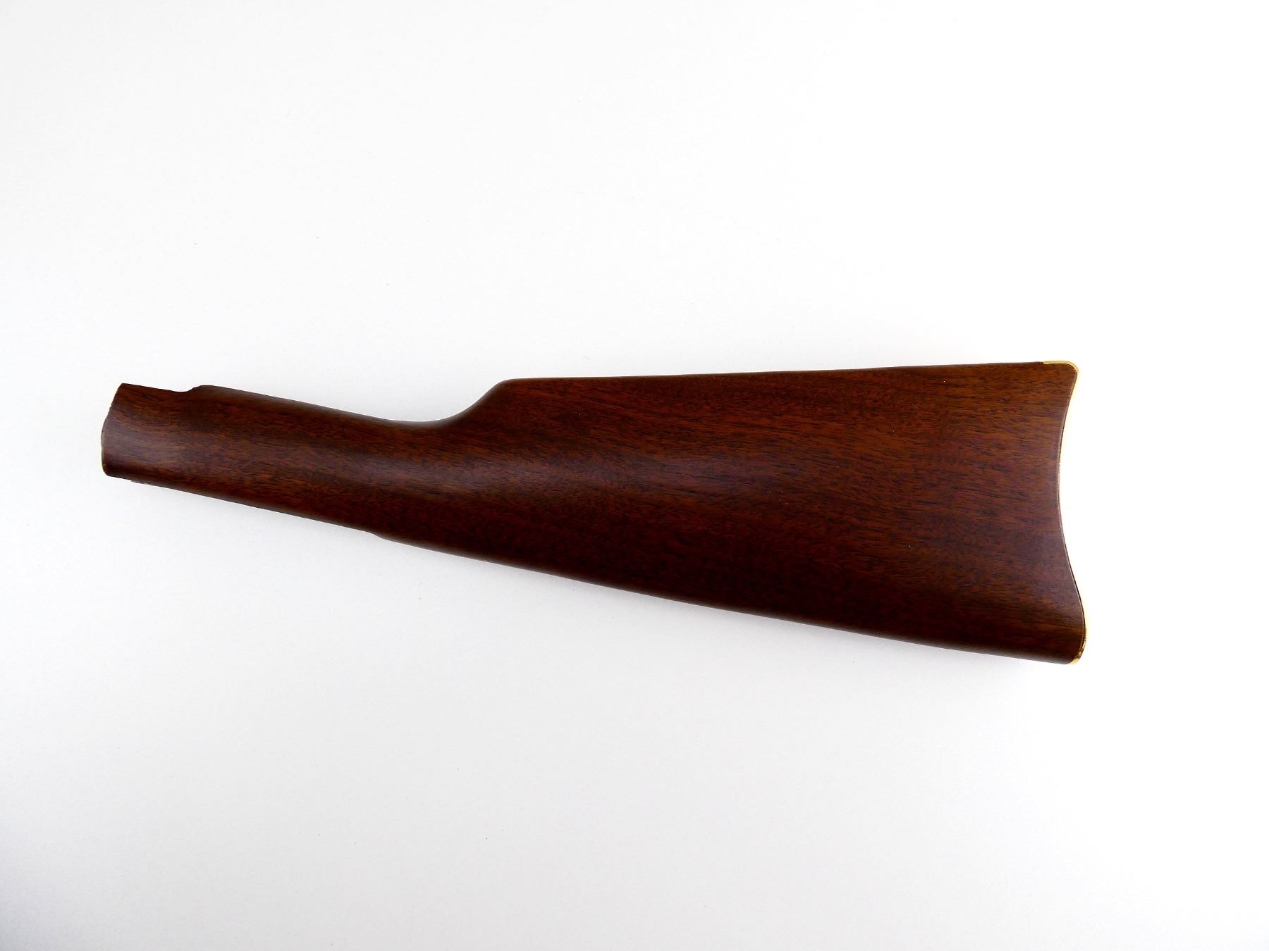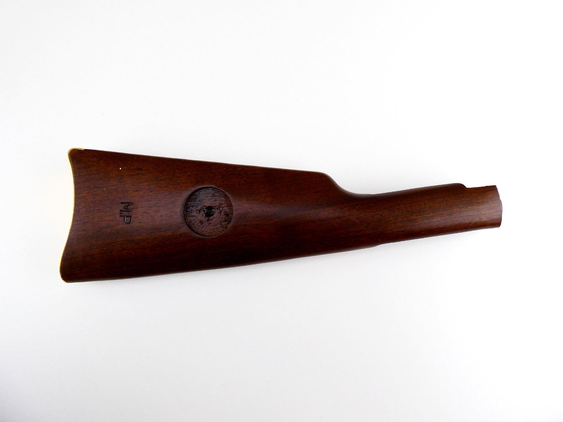(1) WOODEN BUTT STOCK, SMOOTH, GOLD BUTT PLATE, MARKED: "M.P", NO MEDALLION, APPEARS NOS, SHOWS LIGHT WEAR / TEAR, OAL APPROX. 13.25". MAY REQUIRE FITTING. SEE PHOTOS.