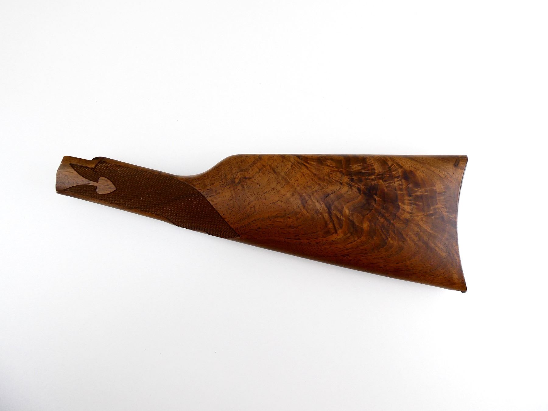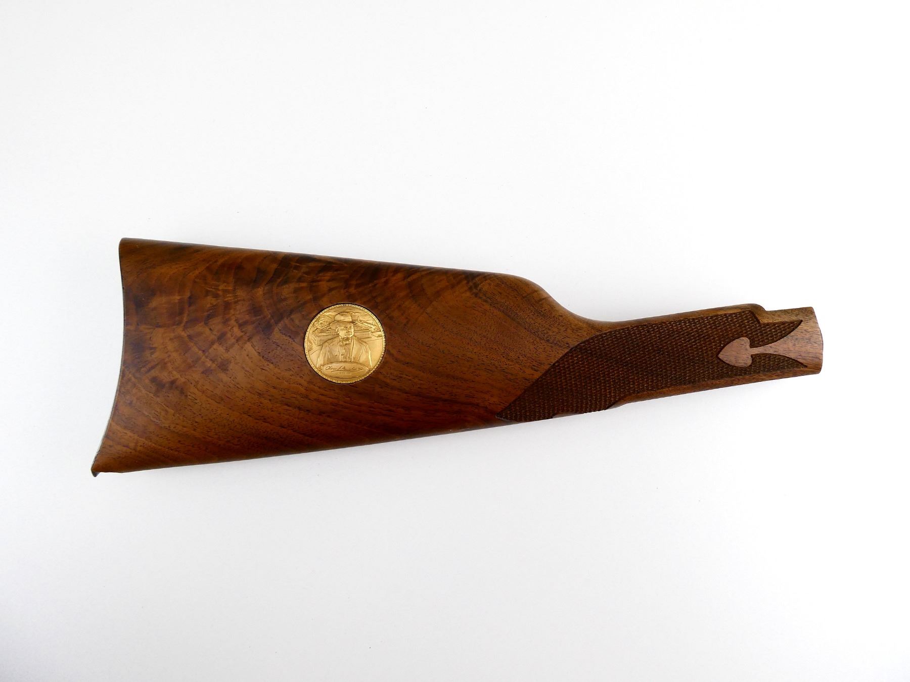 (1) WOODEN BUTT STOCK, CHECKERED, BLUED STEEL BUTT PLATE, BRASS MEDALLION, CHIPPED AT TOE, OAL APPROX. 13.25". MAY REQUIRE FITTING. SEE PHOTOS.