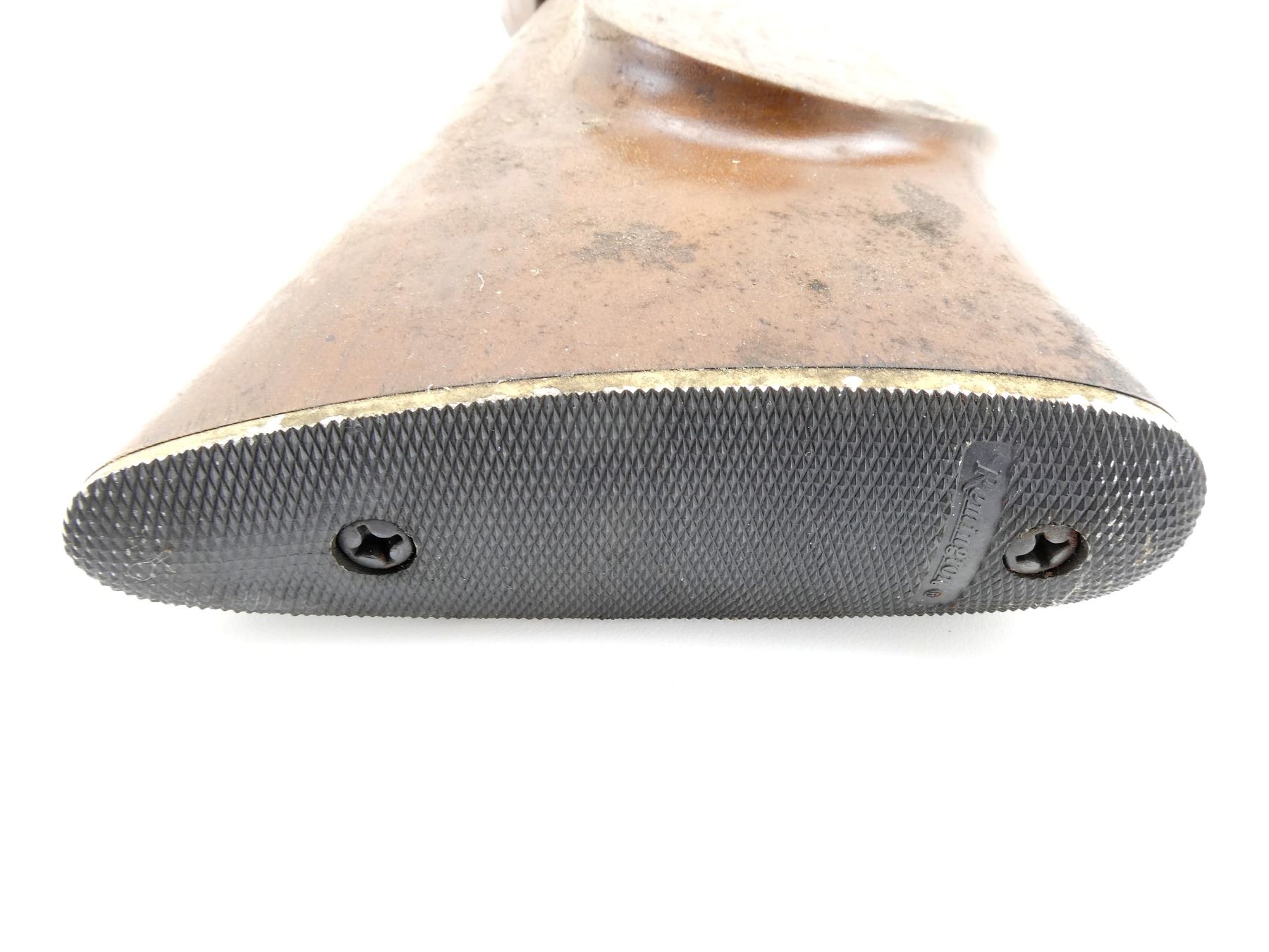 (1) WOODEN STOCK, RIGHT HANDED, CHECKERED, PISTOL GRIP, CHECKERED ALLOY BUTT PLATE, CHEEK REST, BLIND MAG, SHOWS SMALL CHIPS / CRACKS / WEAR, 4" OAL MAG WELL, OAL APPROX. 30.5". MAY REQUIRE FITTING. SEE PHOTOS.
