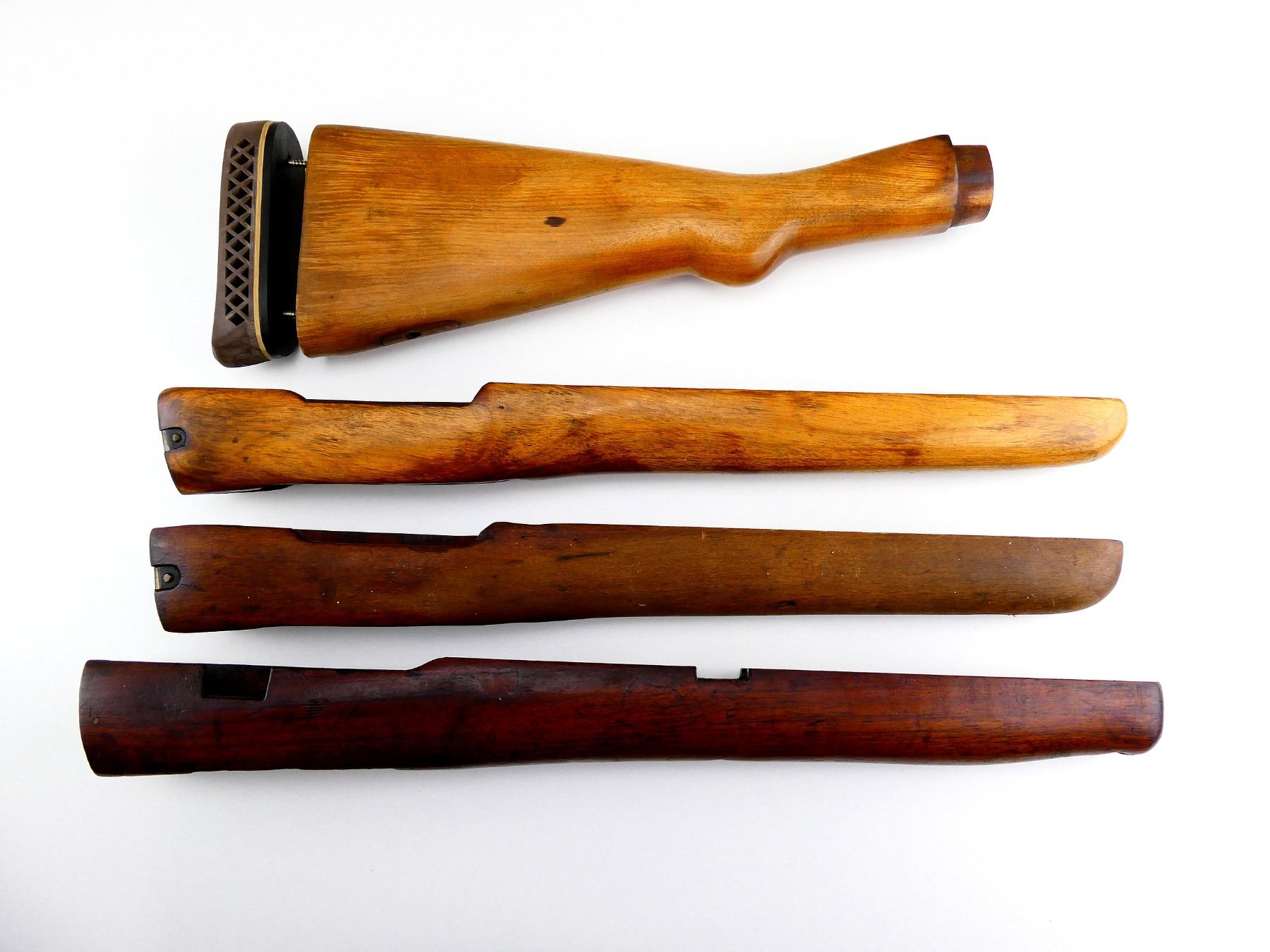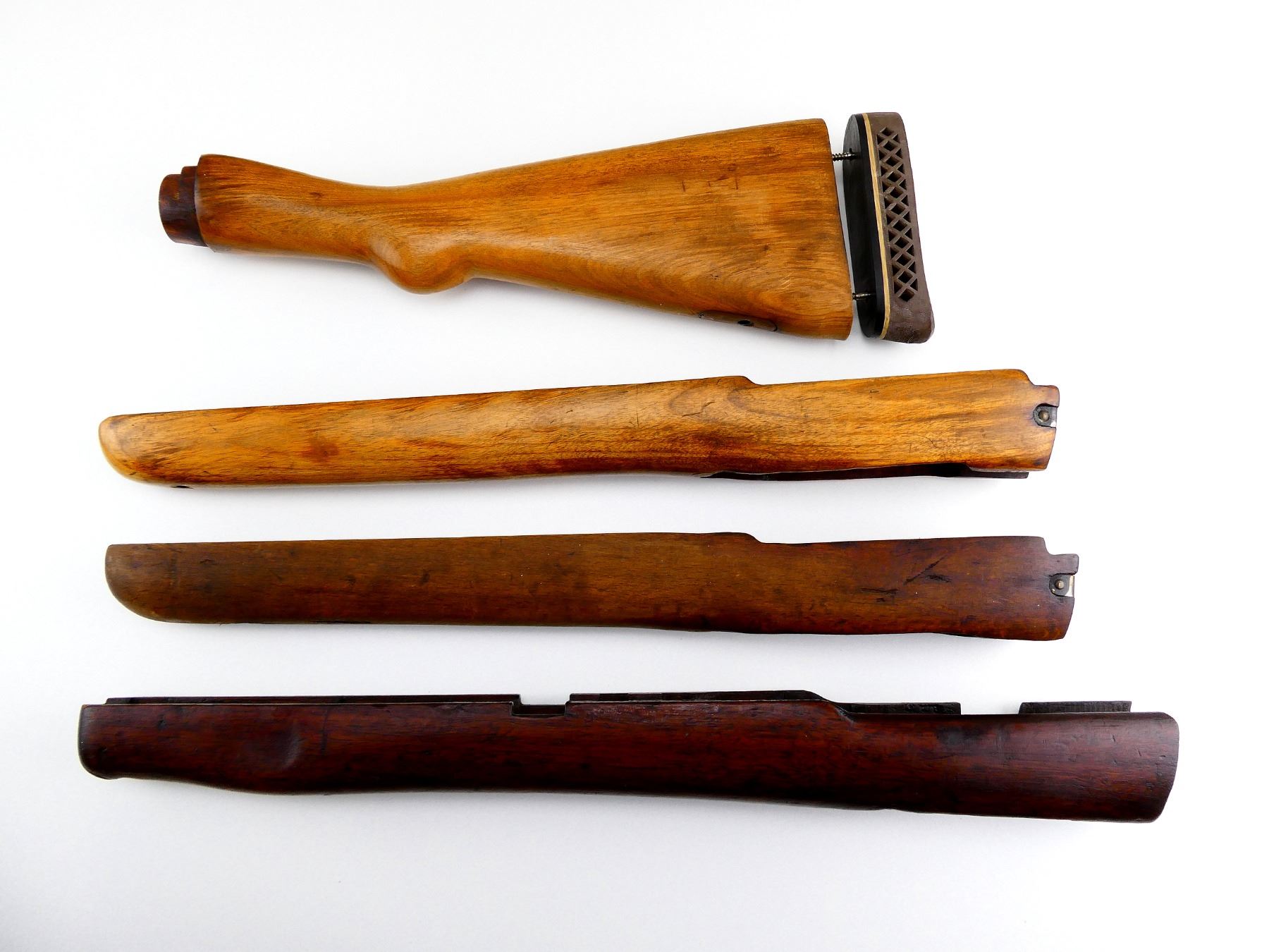 LOT INCLUDES; (1) LEE ENFIELD NO.4 SPORTER STOCK, WOOD CONSTRUCTION, WITH BROWN RUBBER CHIEFTAIN RECOIL PAD, STOCK MARKED: "S", OAL APPROX. 13.25", (1) LEE ENFIELD NO.4 SPORTER FOREND, WOOD CONSTRUCTION, UNMARKED, CRACKED AT BACK, OAL APPROX. 17.25", (1) LEE ENFIELD NO.4 SPORTER FOREND, WOOD CONSTRUCTION, UNMARKED, CRACKED AT BACK, OAL APPROX. 17", (1) LEE ENFIELD SMLE SPORTER FOREND, WOOD CONSTRUCTION, MARKED: "?, S", CRACK AT BACK, OAL APPROX. 18.5". MAY REQUIRE FITTING. SEE PHOTOS.