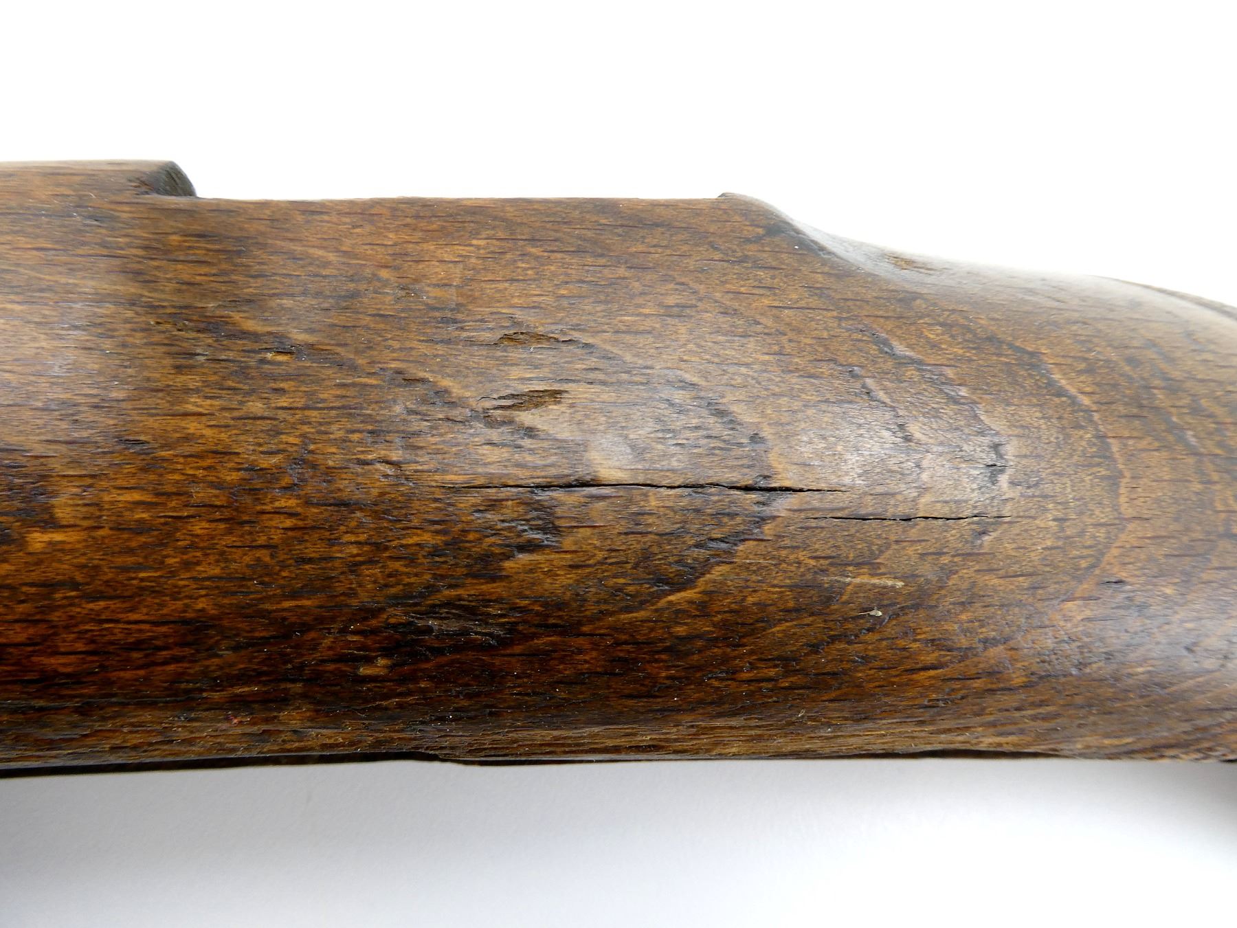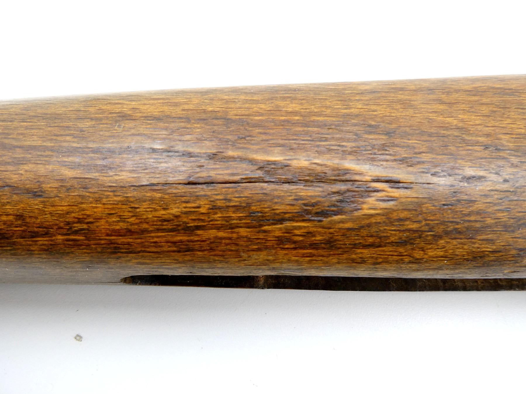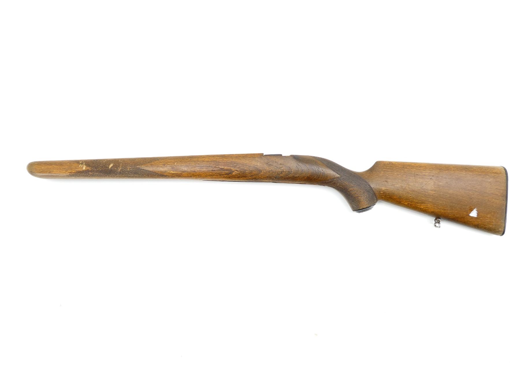 (1) WOODEN STOCK, RIGHT HANDED, CHECKERED, PISTOL GRIP WITH CAP, BLACK POLYMER BUTT PLATE, REAR SLING SWIVEL, SHOWS SMALL CHIPS / CRACKS / WEAR, CRACKED AT WRIST, OAL APPROX. 32.5". MAY REQUIRE FITTING. SEE PHOTOS.