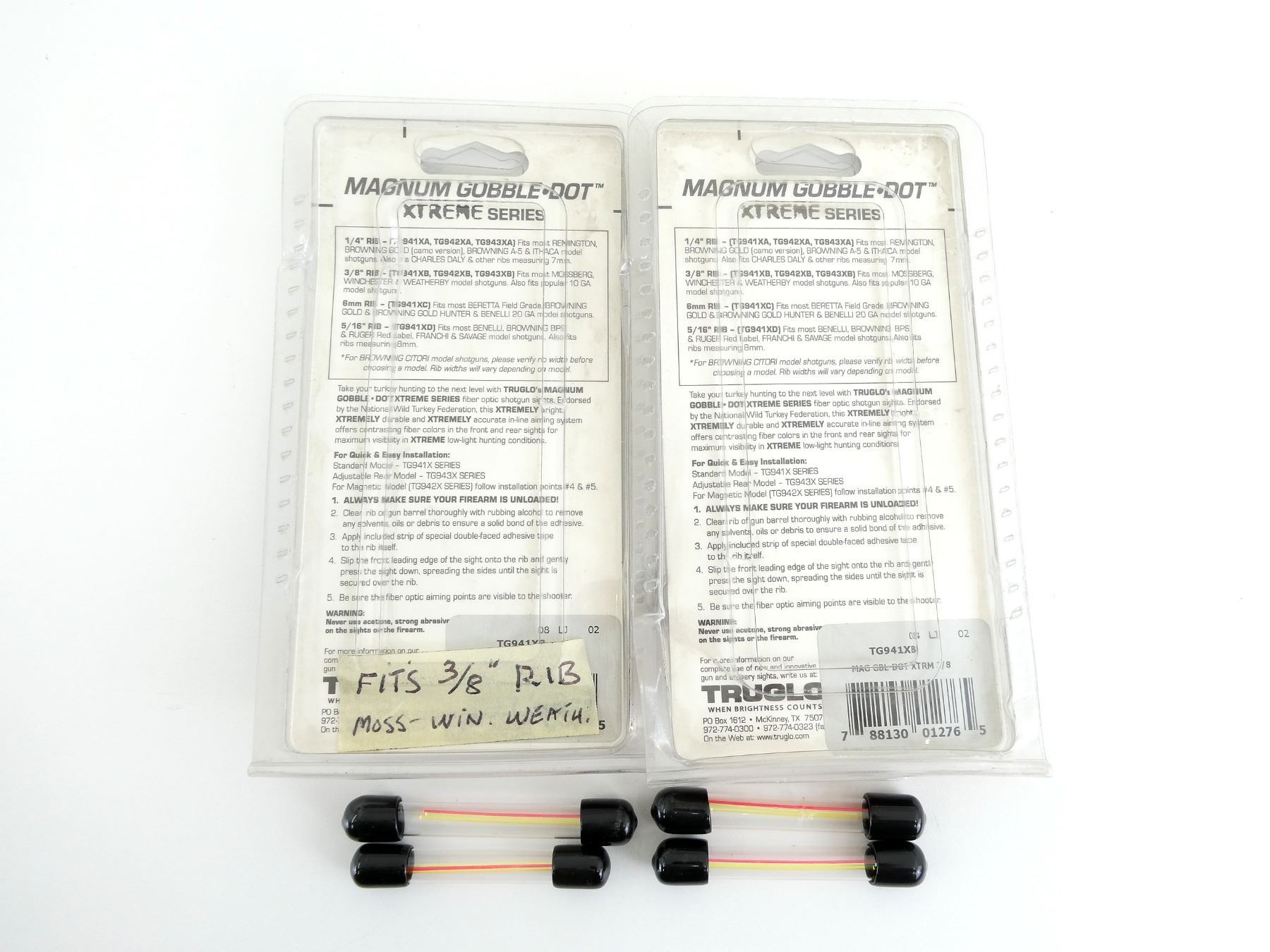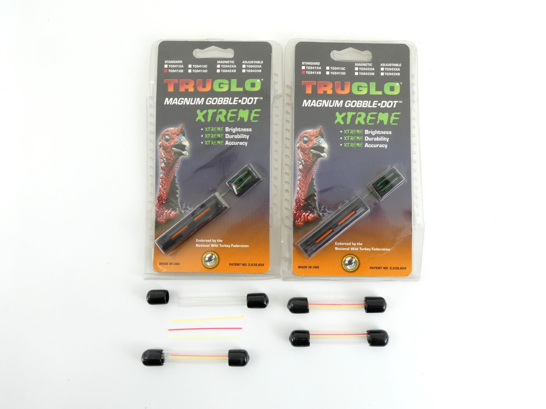 LOT INCLUDES; (2) TRUGLO MAGNUM GOBBLE-DOT EXTREME SHOTGUN SIGHTS, GREEN / RED, FIBER OPTIC, FITS MOST MOSSBERG, WEATHERBY, WINCHESTER, AND POPULAR 10 GA MODELS, NOS, IN ORIGINAL PACKAGING, DOES NOT APPEAR TO GLOW & (4) TUBES OF THREE FIBER OPTICS, GREEN / YELLOW / RED, DOES NOT APPEAR TO GLOW. SEE PHOTOS.