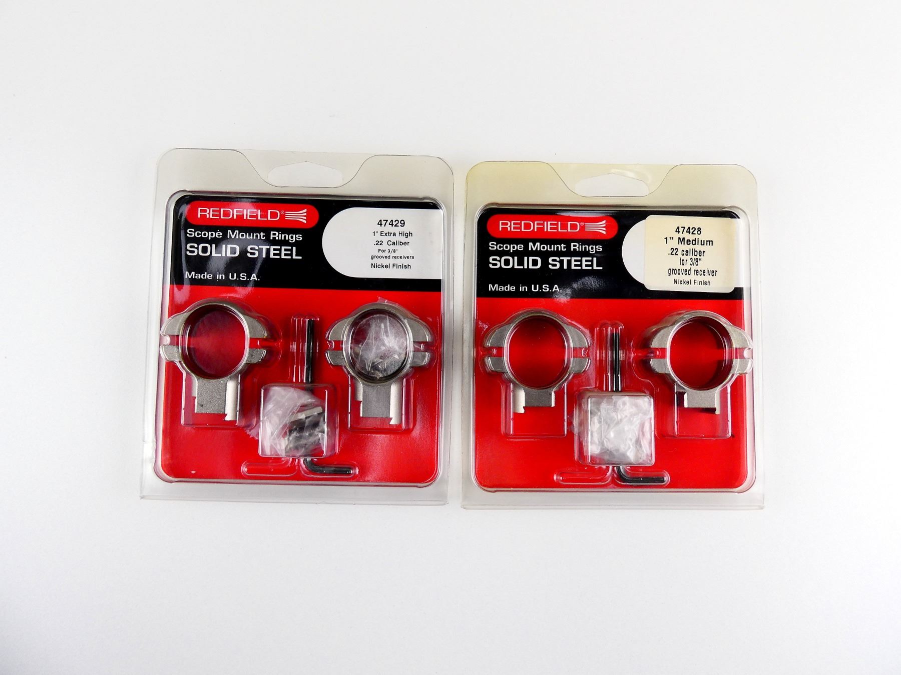 LOT INCLUDES; (1) PAIR OF 1" RINGS, NICKEL FINISH STEEL, PART #: 47428, NOS IN ORIGINAL PACKAGING & (1) PAIR OF 1" RINGS, NICKEL FINISH STEEL, PART #: 47489, NOS IN ORIGINAL PACKAGING. MAY REQUIRE FITTING. SEE PHOTOS.