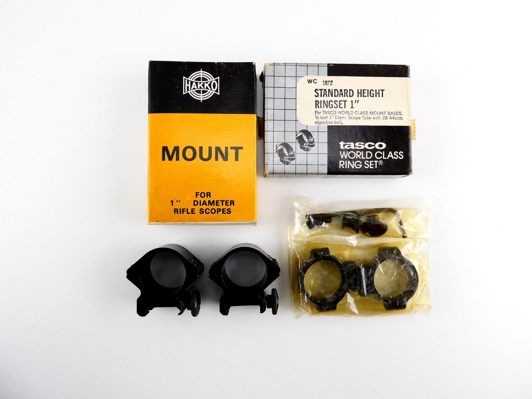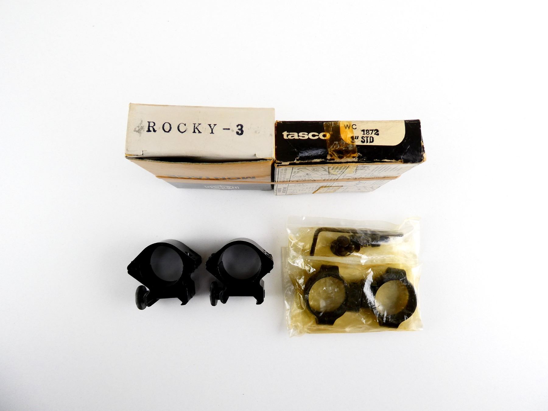 LOT INCLUDES; (1) TASCO PAIR OF 1" RINGS, BLACK STEEL, PART #: WC 1872, NOS IN ORIGINAL PACKAGING, MAY NOT BE COMPLETE & (1) HAKKO PAIR OF 1" SCOPE RINGS, BLACK STEEL, PART #: ROCKY-3, APPEARS NOS IN ORIGINAL PACKAGING, MAY NOT BE COMPLETE. MAY REQUIRE FITTING. SEE PHOTOS.