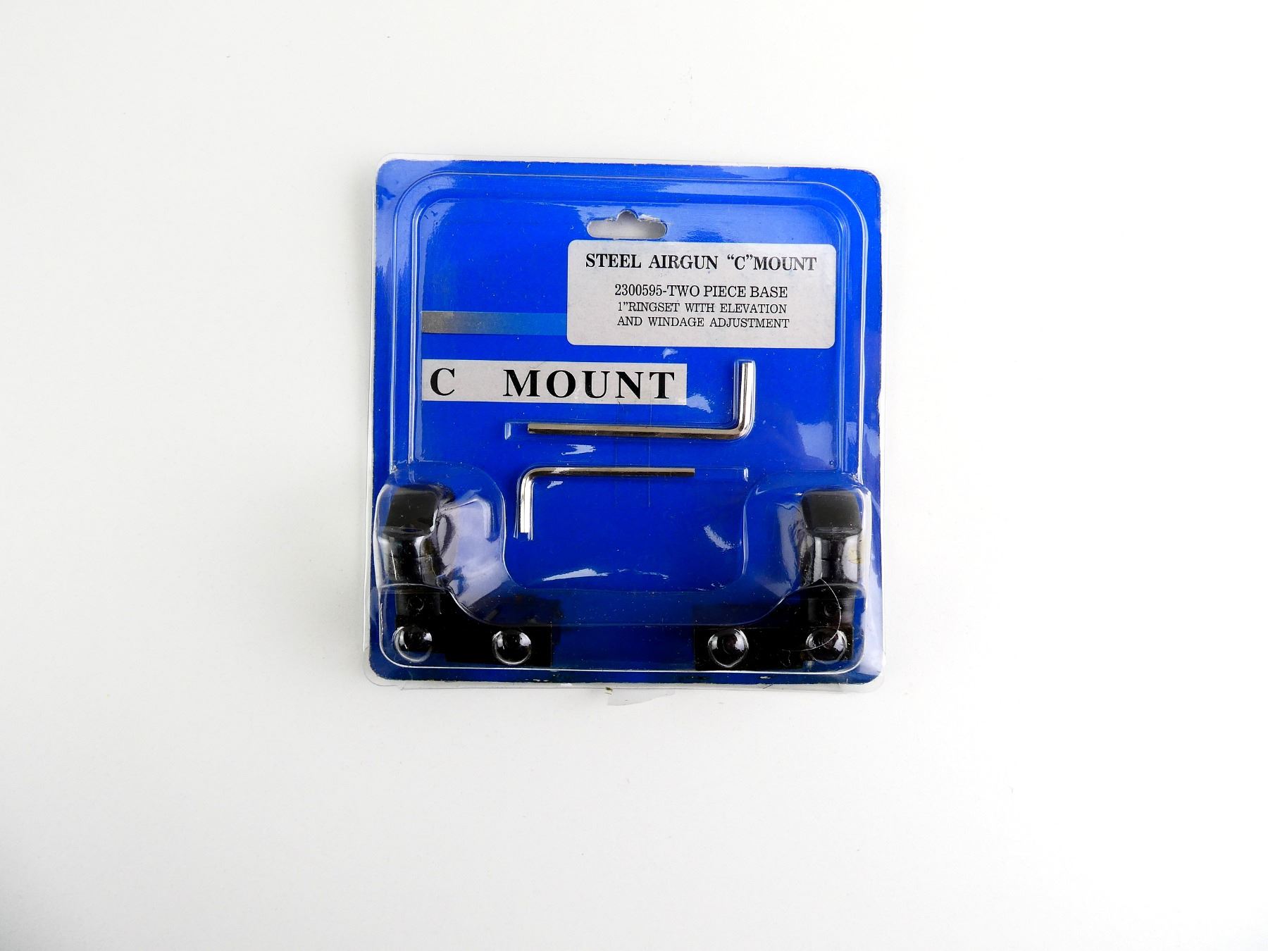 (1) 2-PIECE AIRGUN MOUNT BASE, BLACK ALUMINIUM, MARKED: "C" MOUNT, PART #: 2300595, 1" RING SET WITH ELEVATION & WINDAGE, WITH ORIGINAL PACKAGING. MAY REQUIRE FITTING. SEE PHOTOS.