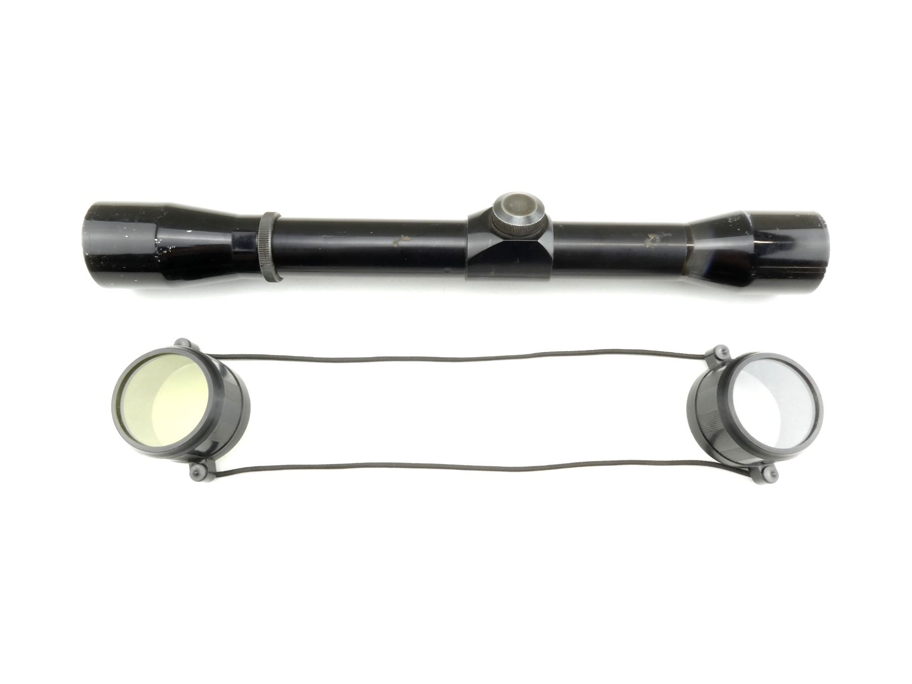 (1) CLEAR OPTICS, WITH FINE CROSSHAIR RETICLE, 1" TUBE DIAMETER, WORKING MAGNIFICATION RING, WINDAGE & ELEVATION KNOBS TURN, WITH LENS COVERS, SCOPE SHOWS WEAR & TEAR / USE MARKS. SEE PHOTOS.