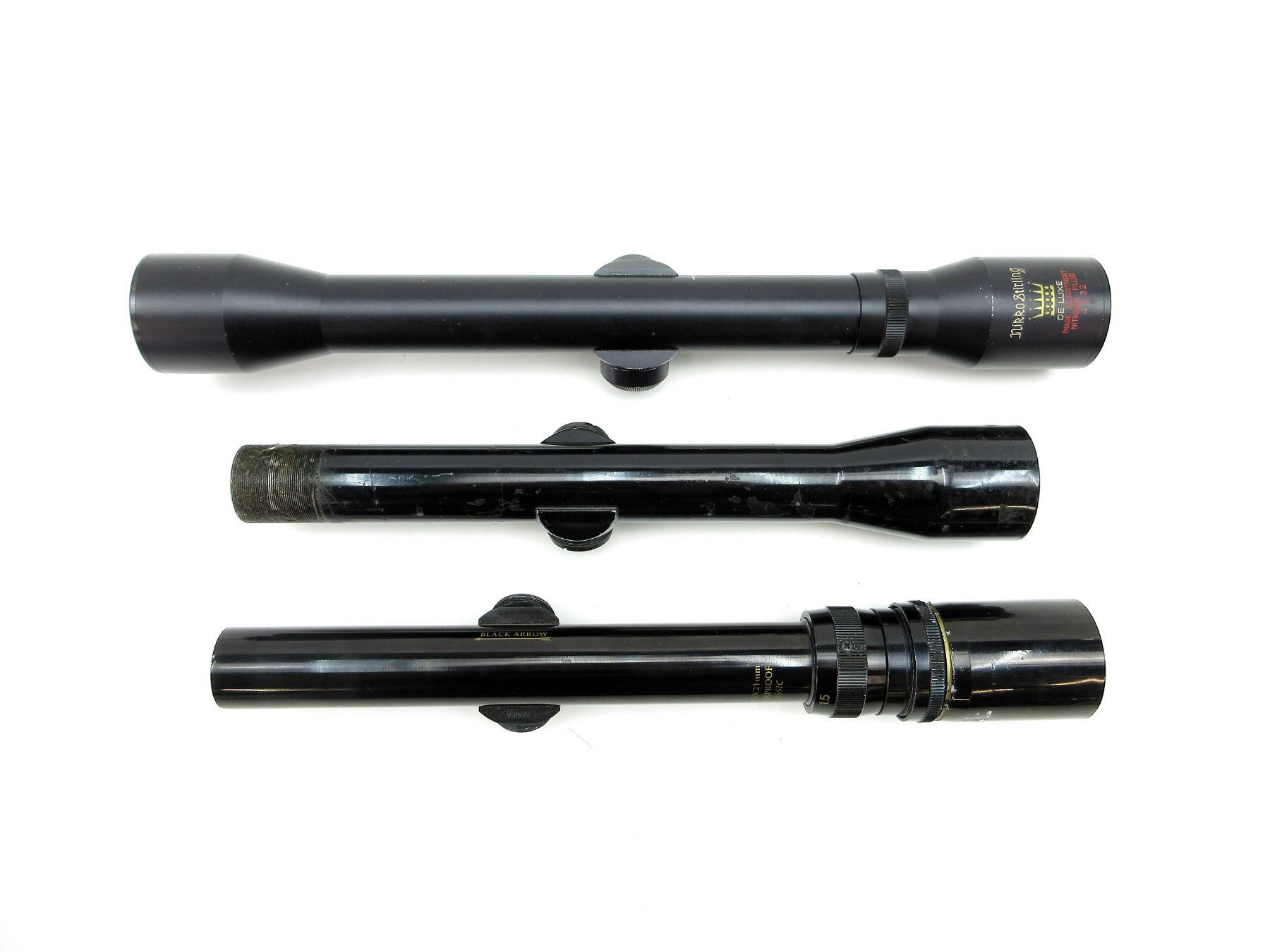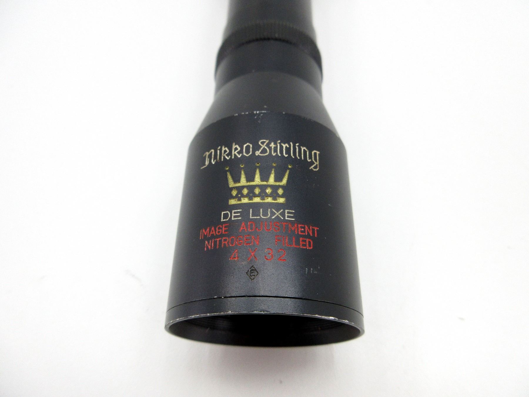 LOT INCLUDES; (1) NIKKO STIRLING 4X32 RIFLE SCOPE, CLEAR OPTICS, WITH FINE CROSSHAIR RETICLE, 1" TUBE DIAMETER, WORKING MAGNIFICATION RING, WINDAGE & ELEVATION KNOBS TURN, WITH LENS COVERS, SCOPE SHOWS WEAR & TEAR / USE MARKS, (1) BLACK ARROW 1.5X4.5X21MM RIFLE SCOPE, MISSING RETICLE LENS, WITH LENS COVER, FOR PARTS ONLY & (1) UNKNOWN RIFLE SCOPE, MISSING RETICLE LENS, MISSING WINDAGE / ELEVATION KNOBS, FOR PARTS ONLY. SEE PHOTOS.