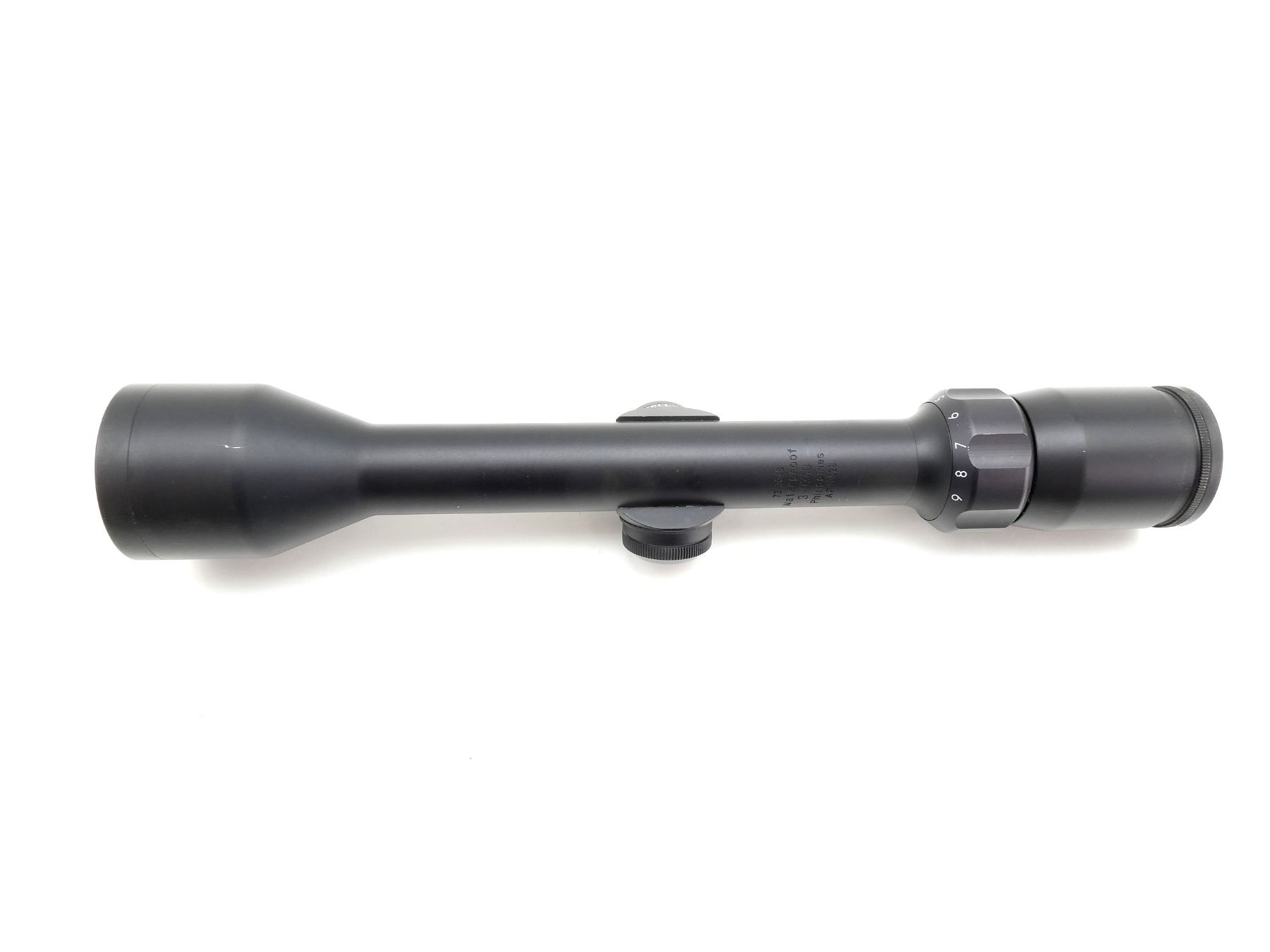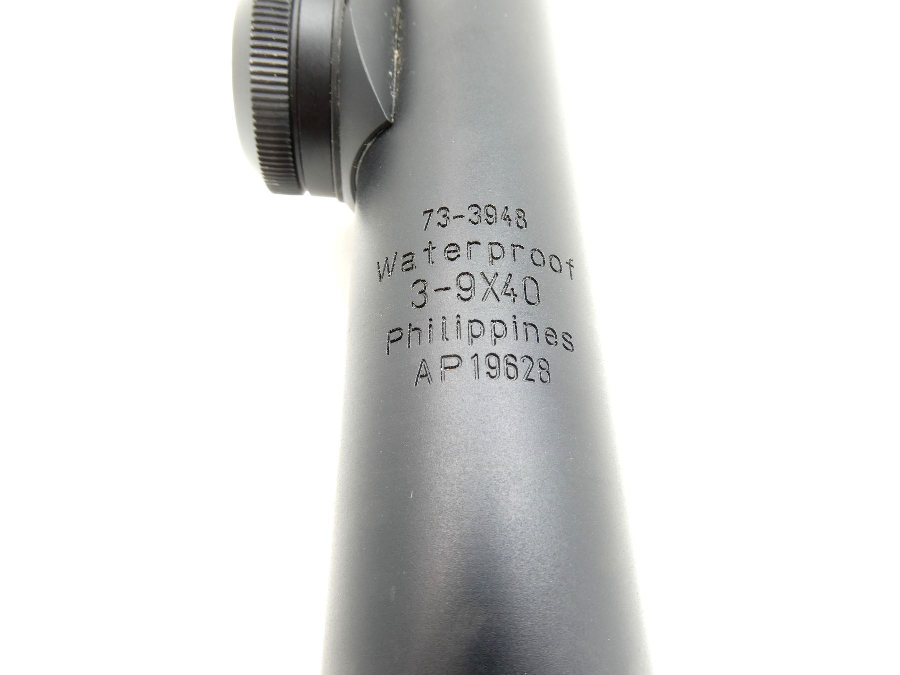(1) CLEAR OPTICS, DUPLEX RETICLE, 1" DIAMETER TUBE, WORKING MAGNIFICATION RING, WINDAGE & ELEVATION KNOBS TURN, MARKED: "73-3948, WATERPROOF, 3-9X40, PHILIPPINES, AP19628", FRONT / REAR BIKINI CAP COVERS, SHOWS LIGHT WEAR & TEAR / USE MARKS. SEE PHOTOS.