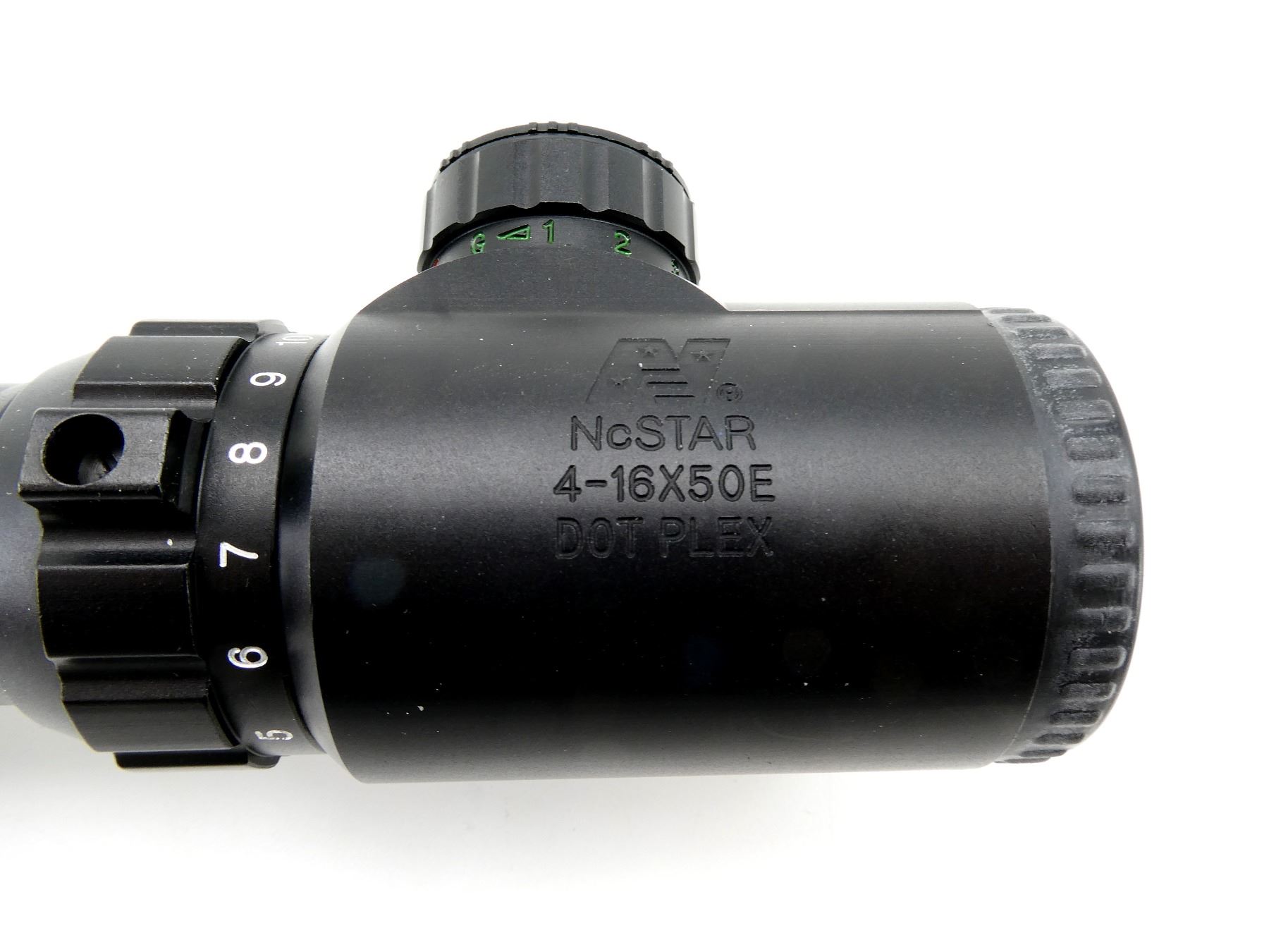 (1) CLEAR OPTICS, DUPLEX RETICLE, 1" DIAMETER TUBE, WORKING MAGNIFICATION RING, WINDAGE & ELEVATION KNOBS TURN, MARKED: "NCSTAR, 4-16X50E, DOT PLEX", WITH LENS COVERS, SHOWS LIGHT WEAR & TEAR / USE MARKS, APPEARS NOS IN ORIGINAL PACKAGING. SEE PHOTOS.