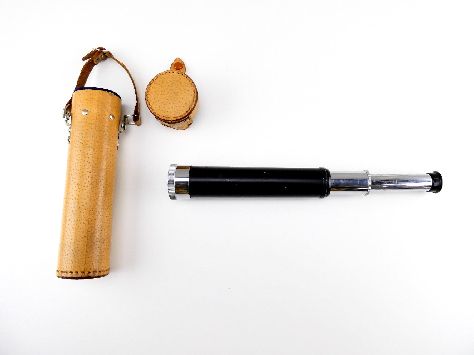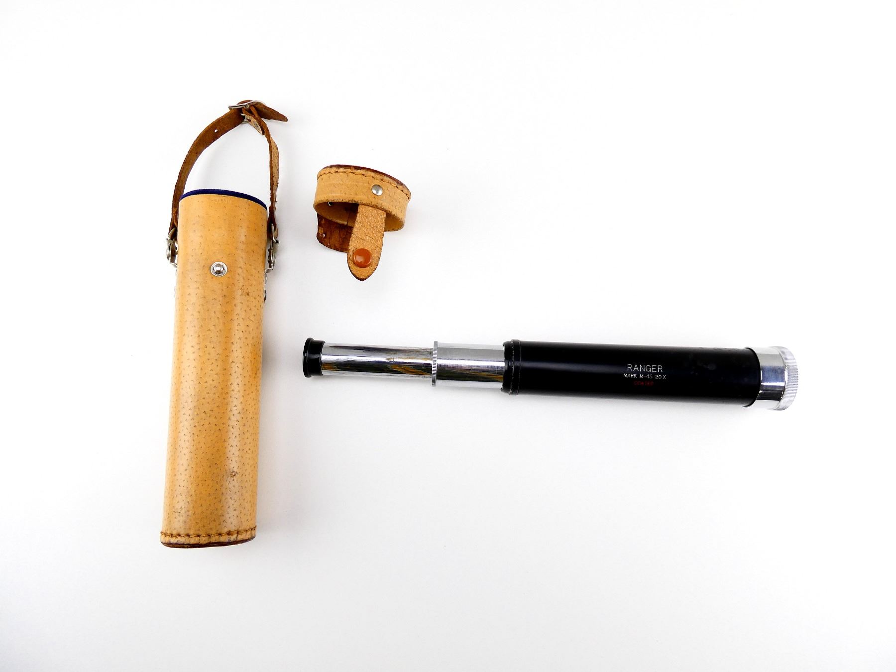 (1) SPOTTING SCOPE, CLEAR OPTICS (FLAKES / CHIPS WITHIN LENS), MARKED: "RANGER MARK M-45 20X", WITH TAN LEATHER CASE, UNMARKED. SEE PHOTOS.