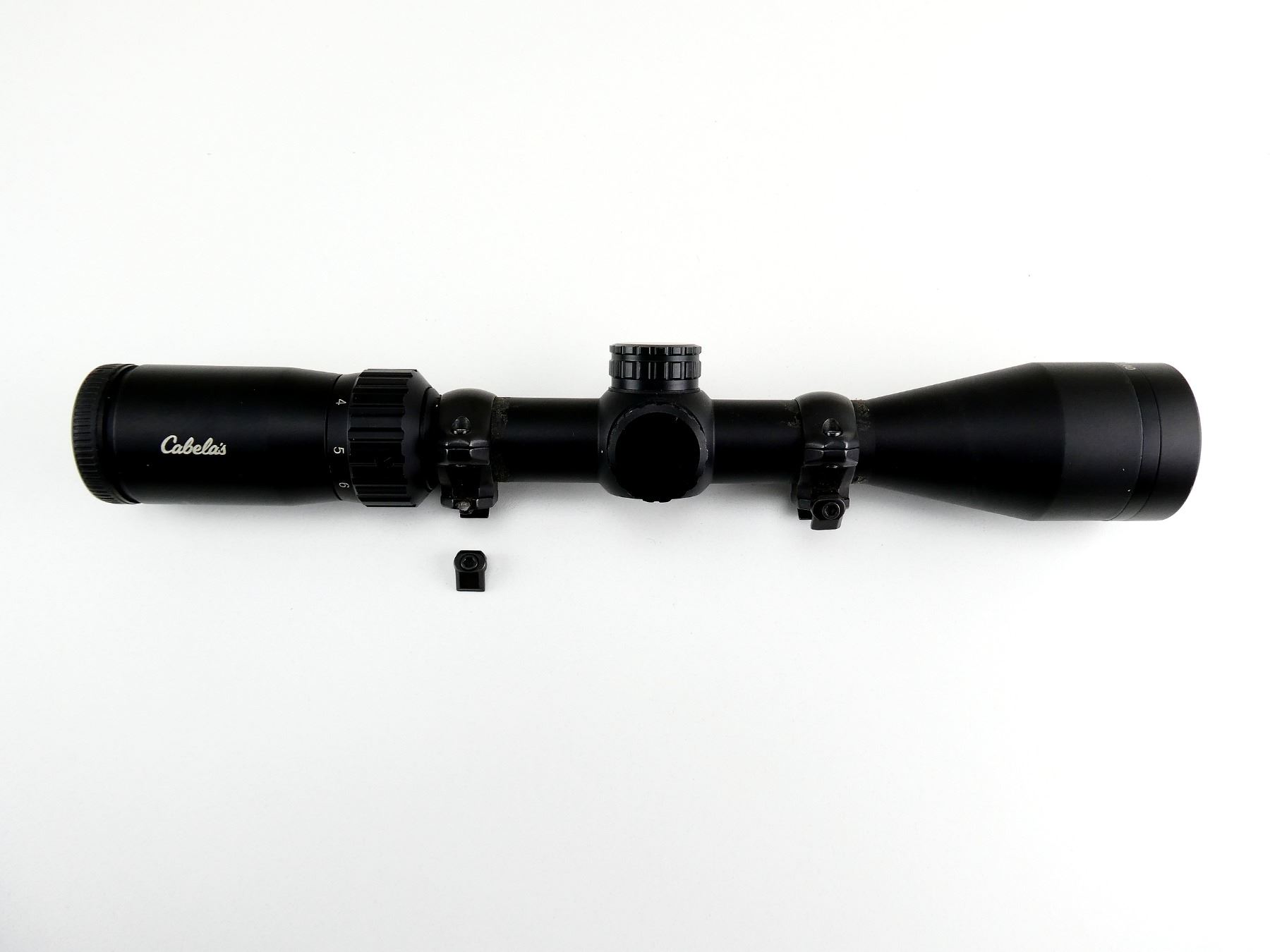 (1) CLEAR OPTICS, RETICLE WITH RANGE FINDER, 1" TUBE DIAMETER, WORKING MAGNIFICATION RING, WINDAGE & ELEVATION KNOBS TURN, MILET RINGS (ONE MOUNTING SCREW IS BROKEN), MARKED: "SLUG", "3-9X40", "CABELA'S", ETC., WITH LENS COVER. SEE PHOTOS.