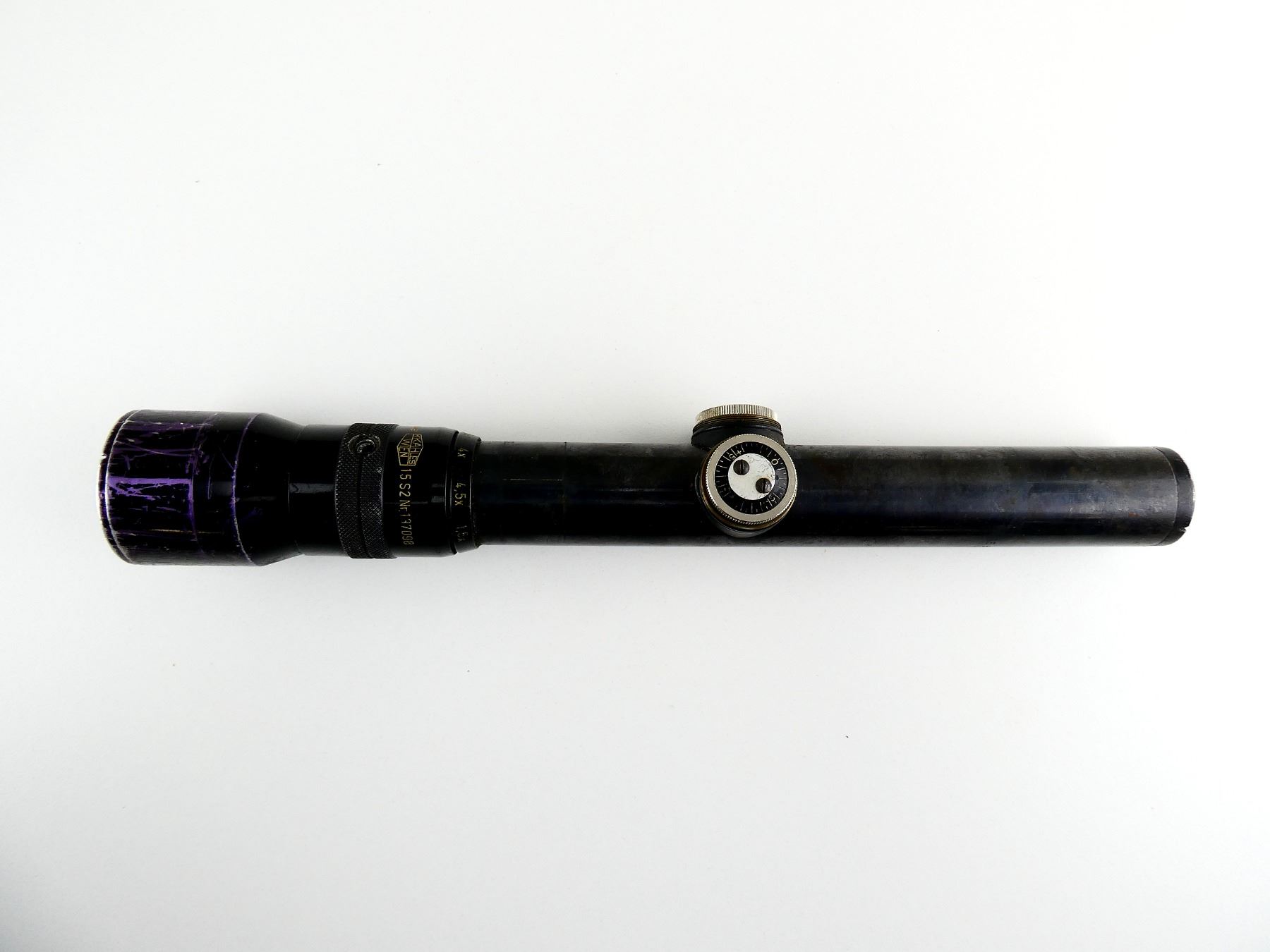 (1) CLEAR OPTICS, GERMAN #1 RETICLE, 1" TUBE DIAMETER, MAGNIFICATION RING DOESN'T TURN, WINDAGE & ELEVATION KNOBS TURN (MISSING ADJUSTMENT CAPS), SERIAL NO. NR137098, SHOWS WEAR & TEAR / USE MARKS / DENTED. SEE PHOTOS.