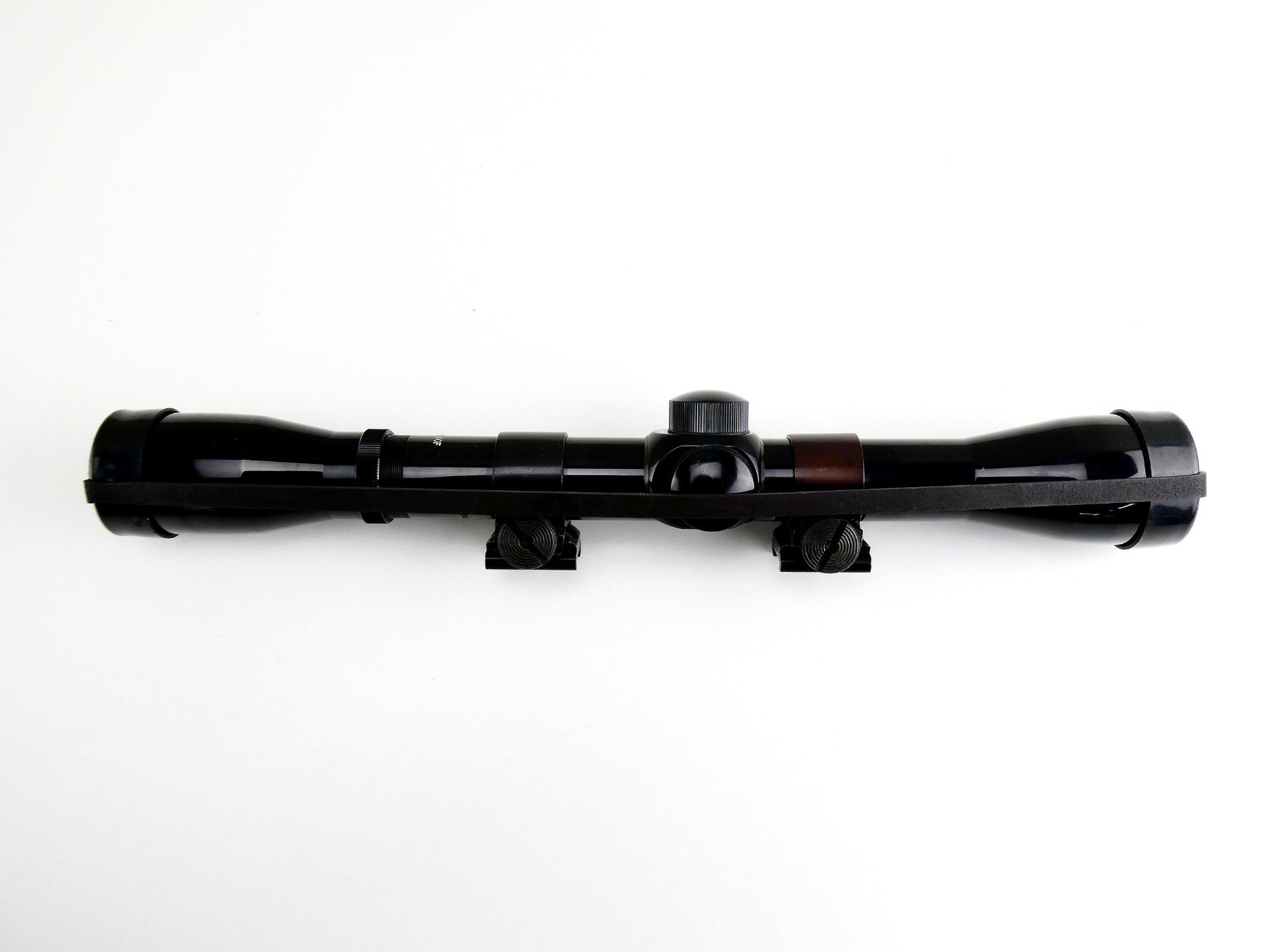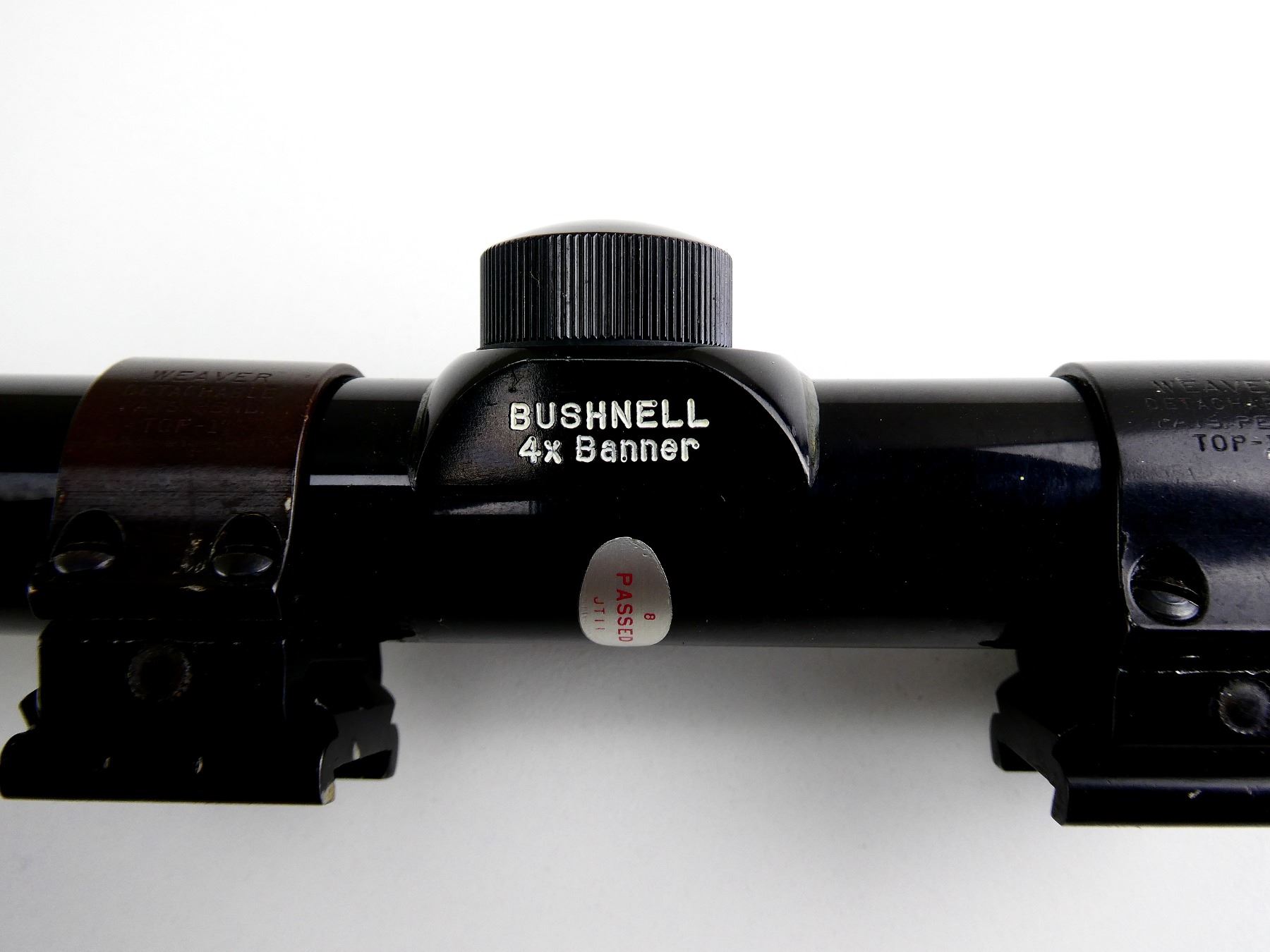 (1) CLEAR OPTICS, DUPLEX CROSSHAIR RETICLE, 1" TUBE DIAMETER, WORKING MAGNIFICATION RING, WINDAGE & ELEVATION KNOBS TURN, MARKED: "BUSHNELL 4X BANNER", WITH LENS COVER, SHOWS WEAR & TEAR / USE MARKS. SEE PHOTOS.