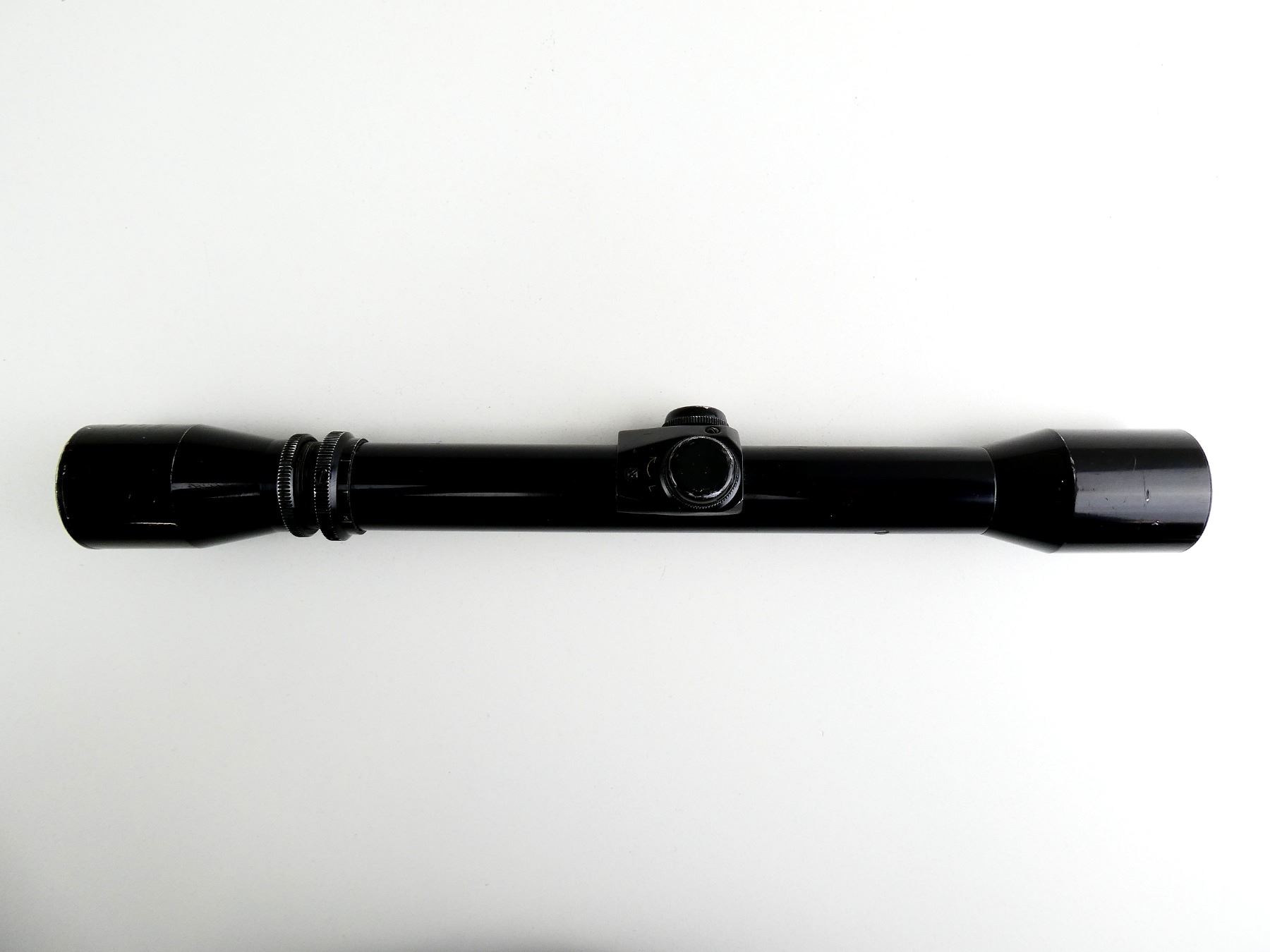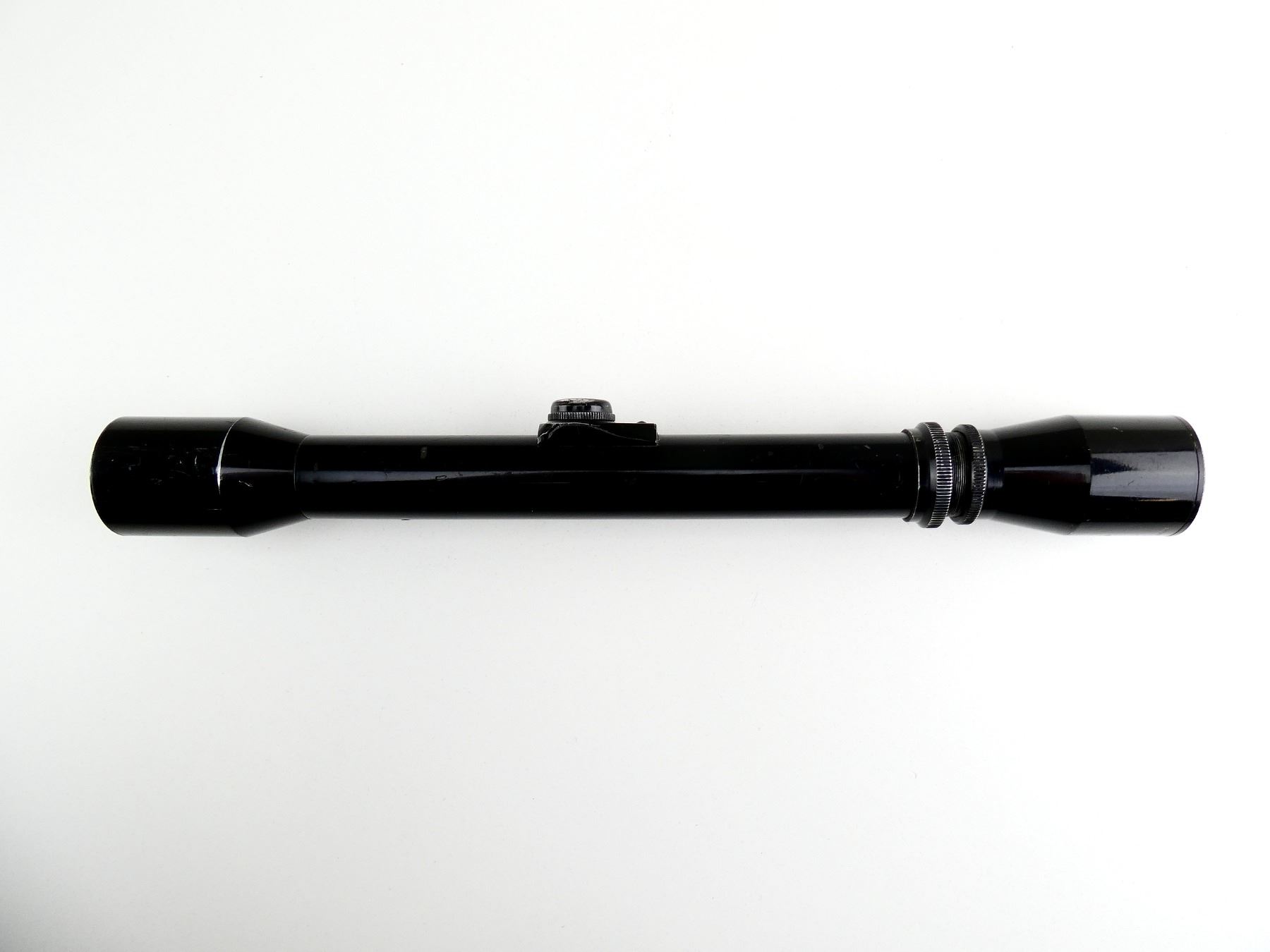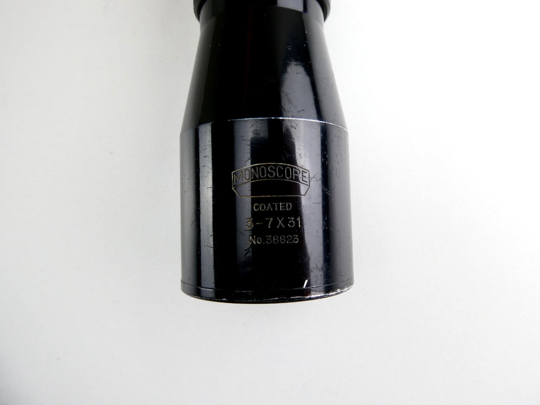 (1) CLEAR OPTICS, DUPLEX RETICLE, 1" TUBE DIAMETER, WORKING MAGNIFICATION RING 3-7, WINDAGE & ELEVATION KNOBS TURN, MARKED: "MONOSCOPE CODED 3-7X31 NO. 38823", ETC., SHOWS WEAR & TEAR / USE MARKS. SEE PHOTOS.