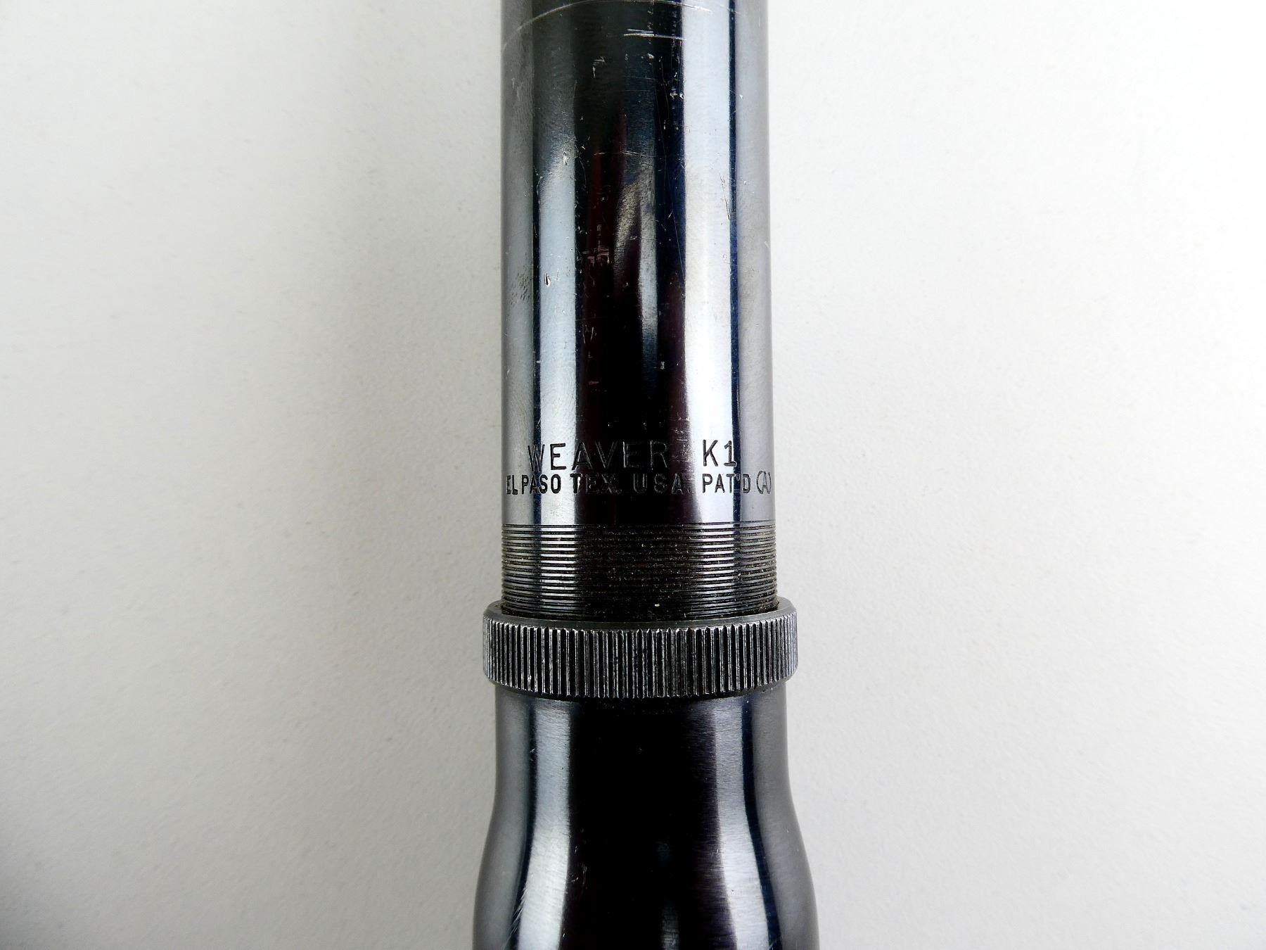 (1) CLEAR OPTICS, DUPLEX RETICLE, 1" TUBE DIAMETER, WORKING MAGNIFICATION RING, WINDAGE & ELEVATION KNOBS TURN, MARKED: "WEAVER K1", ETC., SHOWS WEAR & TEAR / USE MARKS. SEE PHOTOS.