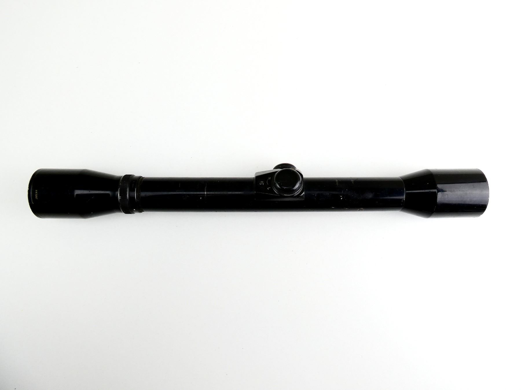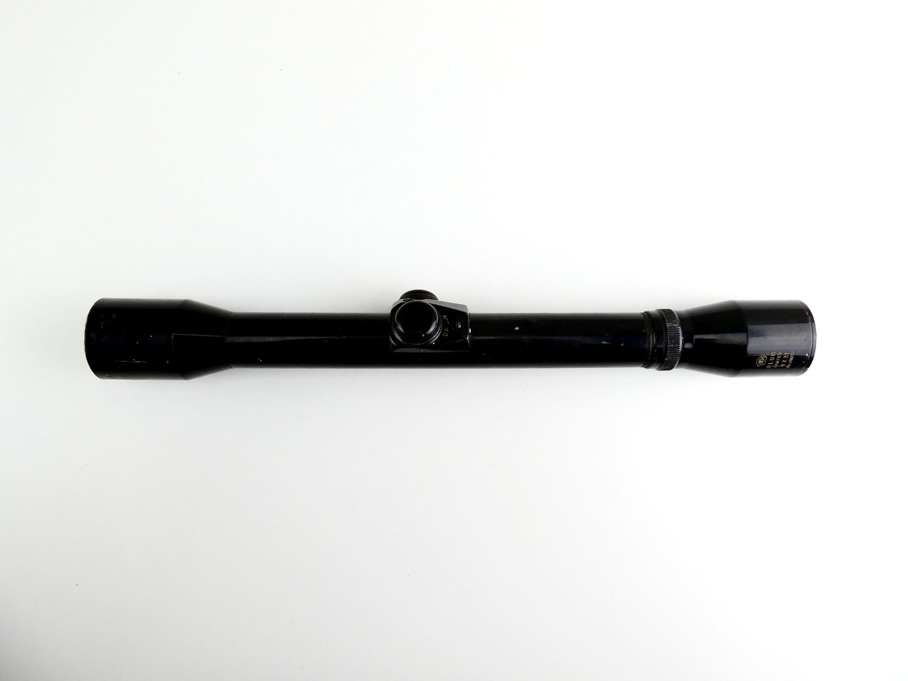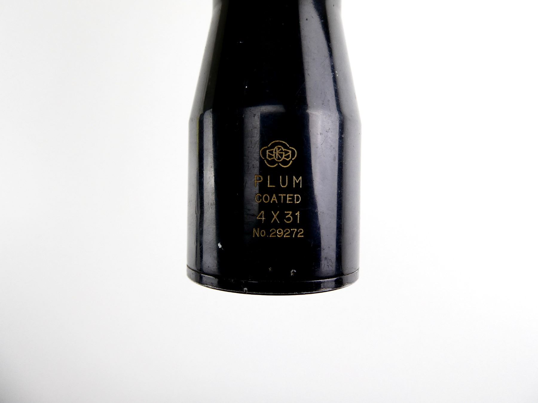 (1) CLEAR OPTICS, FINE CROSSHAIR RETICLE, 1" TUBE DIAMETER, STIFF MAGNIFICATION RING, WINDAGE & ELEVATION KNOBS TURN, MARKED: "PLUM" "COATED", "4 X 31", "NO. 29272", ETC., SHOWS WEAR & TEAR / USE MARKS. SEE PHOTOS.