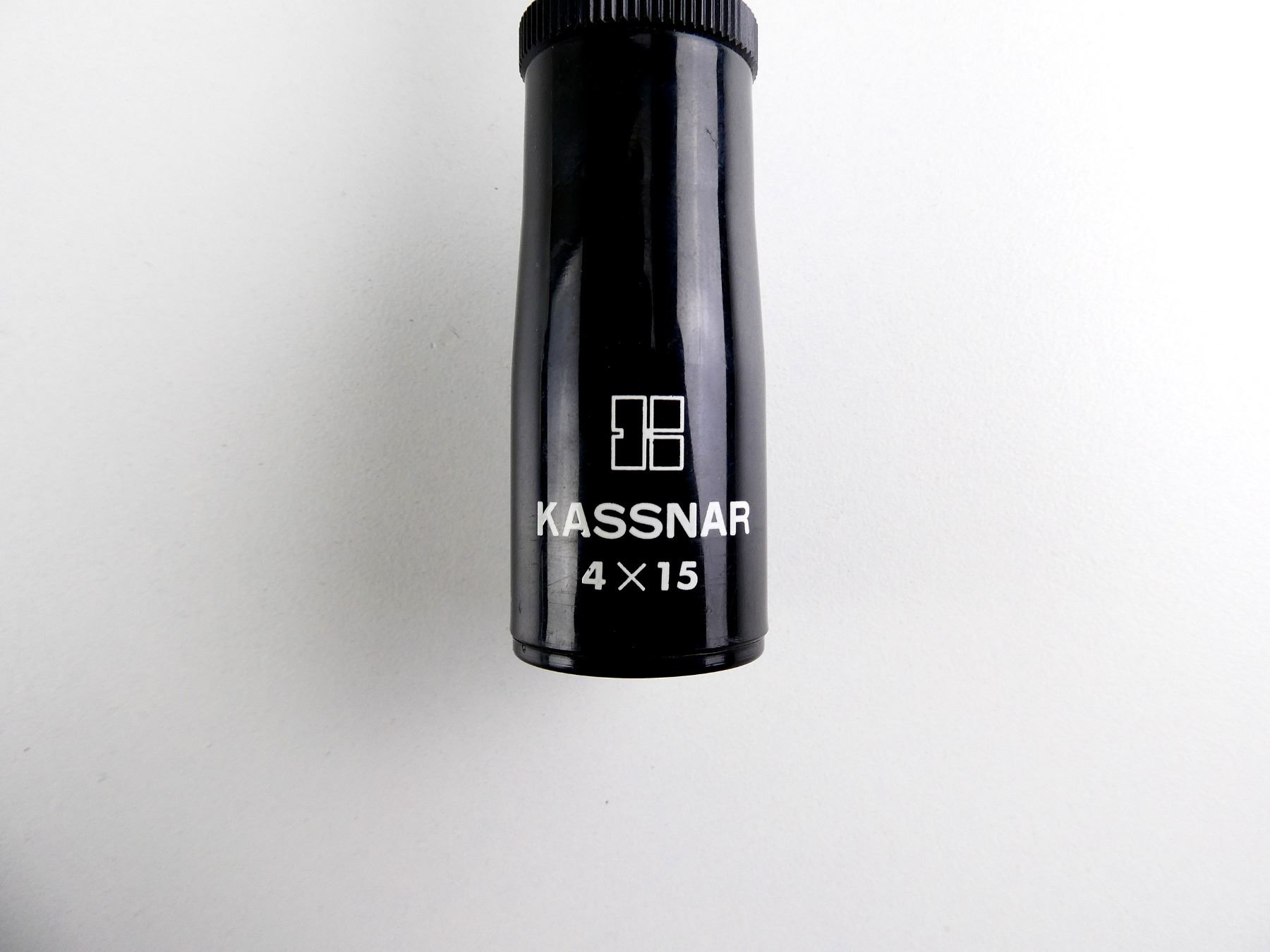 (1) CLOUDY OPTICS, FINE CROSSHAIR RETICLE, 3/4" TUBE DIAMETER, WORKING MAGNIFICATION RING, WINDAGE & ELEVATION KNOBS TURN, MARKED: "KASSNAR 4X15", ETC., WITH MOUNTING RAIL, SHOWS WEAR & TEAR / USE MARKS. SEE PHOTOS.