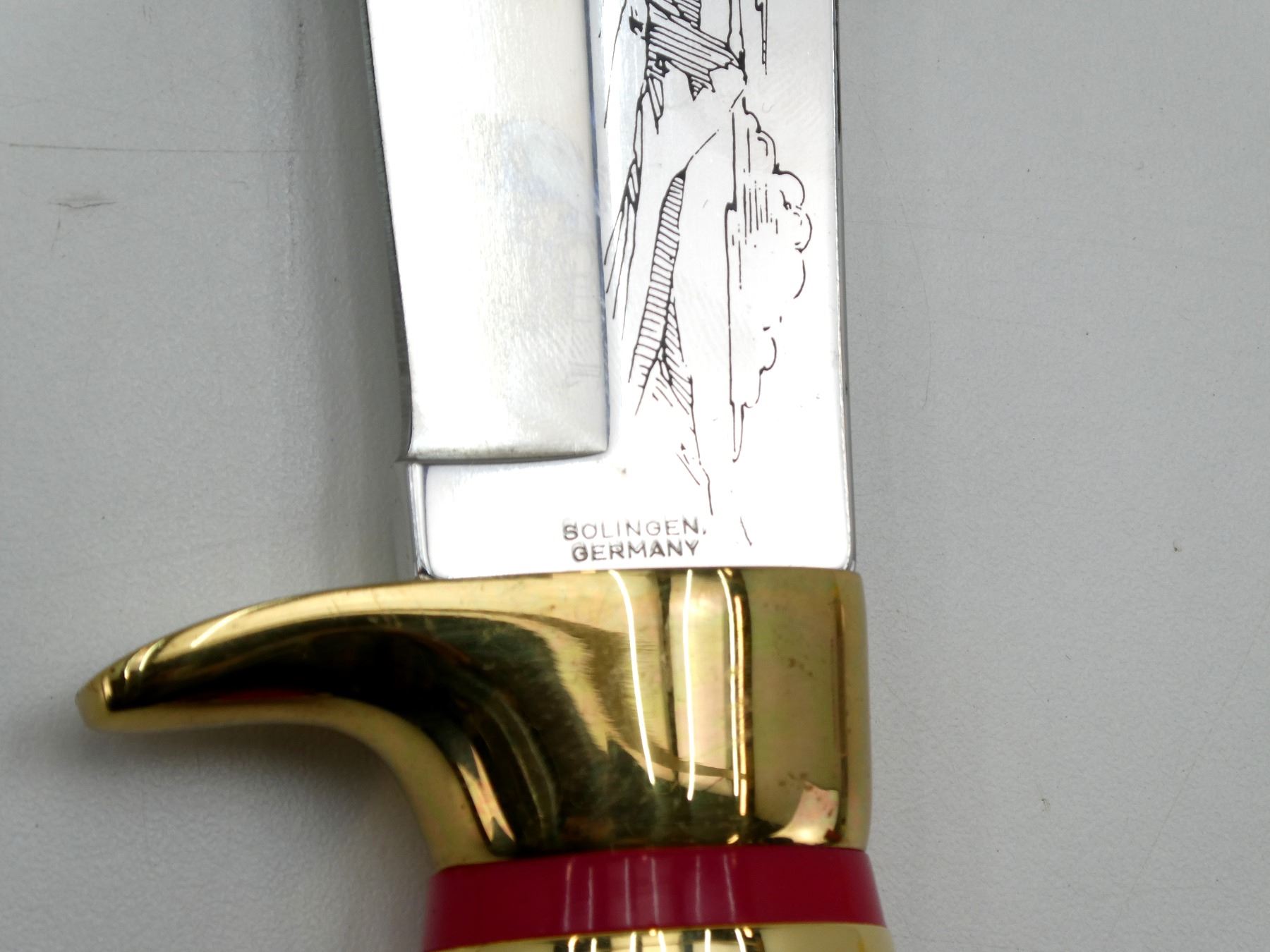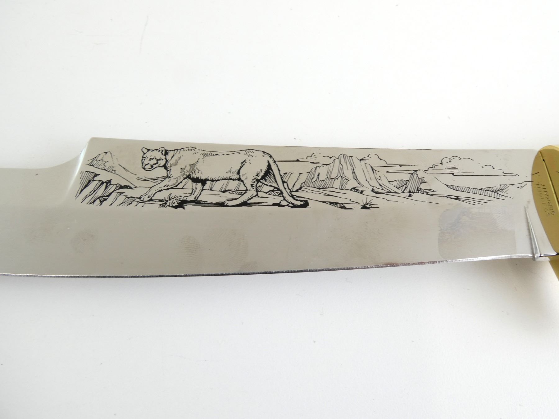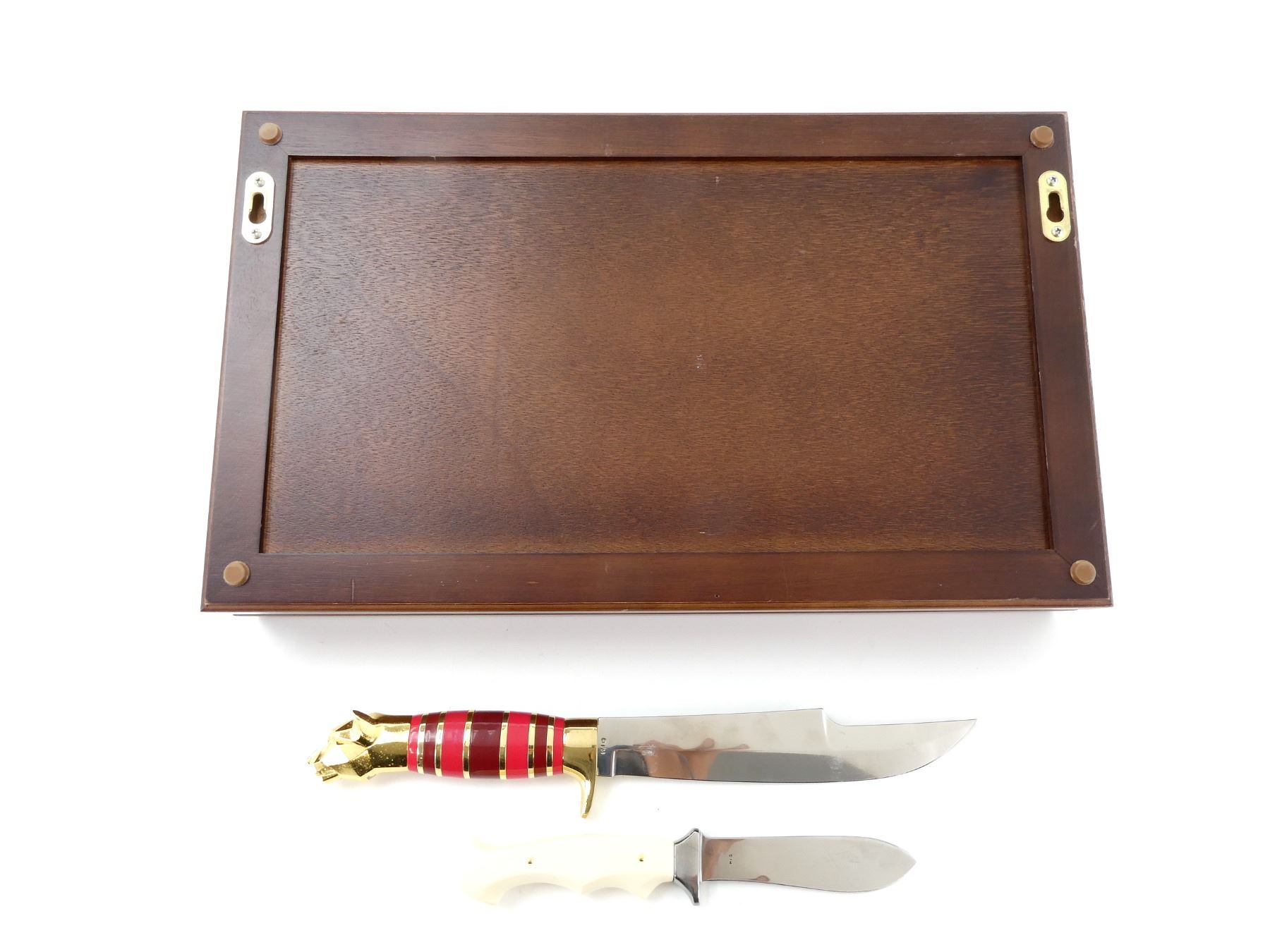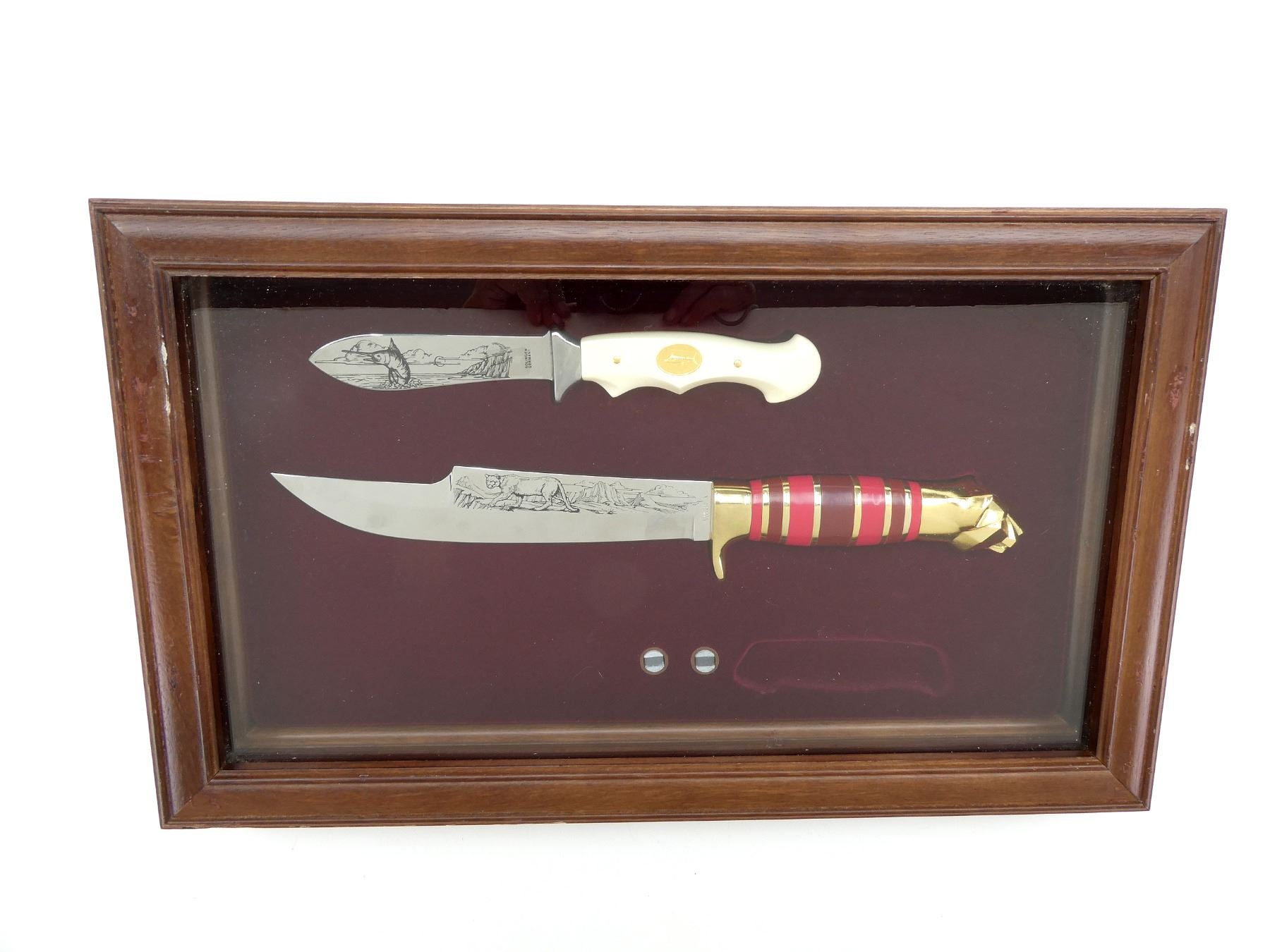 LOT INCLUDES; (1) FRANKLIN MINT FIXED BLADE KNIFE, MOUNTAIN LION ETCHED DESIGN ON BLADE, BLADE MARKED: "SOLINGEN, GERMANY", OTHER-SIDE MARKED: "C (COPYRIGHT) FM", GOLD-COLOURED / RED HANDLE, MOUNTAIN LION / COUGAR GOLD-COLOURED POMMEL, POMMEL SHOWS SLIGHT WEAR, NO SHEATH, BLADE APPROX. 8.25", OAL APPROX. 14.25", (1) FRANKLIN MINT FIXED BLADE KNIFE, MARLIN ETCHED DESIGN ON BLADE, BLADE MARKED: "SOLINGEN, GERMANY", OTHER-SIDE MARKED: "C (COPYRIGHT) FM", WHITE GRIP WITH GOLD-COLOURED MARLIN / PINS, NO SHEATH, BLADE APPROX. 4.5", OAL APPROX. 9.25" & (1) GLASS DISPLAY CASE, WOOD / GLASS CONSTRUCTION, FELT LINED INSIDE, FITTED TO FRANKLIN MINT KNIVES WITH MAGNETS TO HOLD IN PLACE, LOCKABLE, MISSING KEY, WITH RUBBER FEET ON BOTTOM, APPROX. 18.5" X 11" X 3". SEE PHOTOS. *NO GUARANTEE ON GLASS FOR SHIPPING*