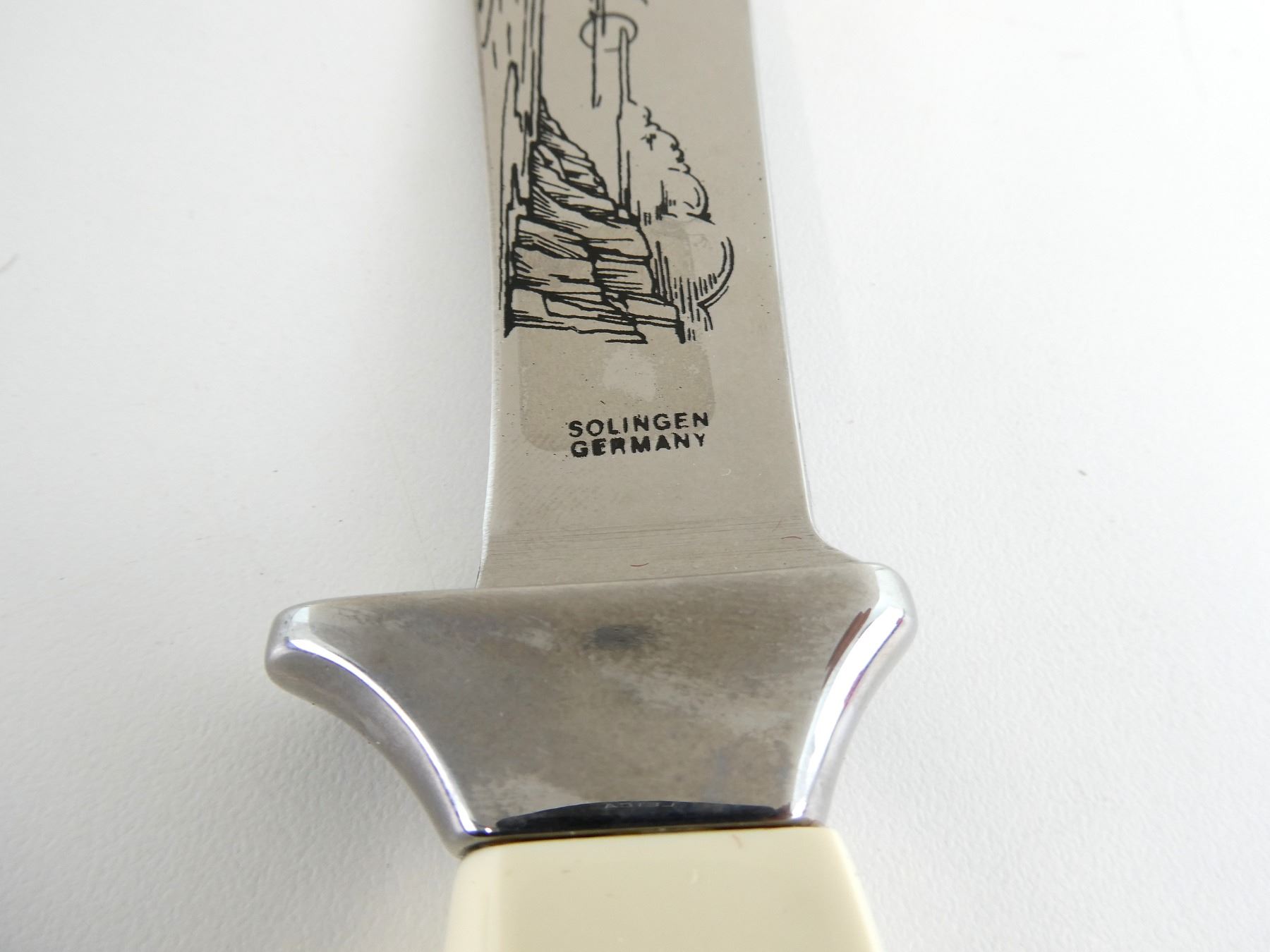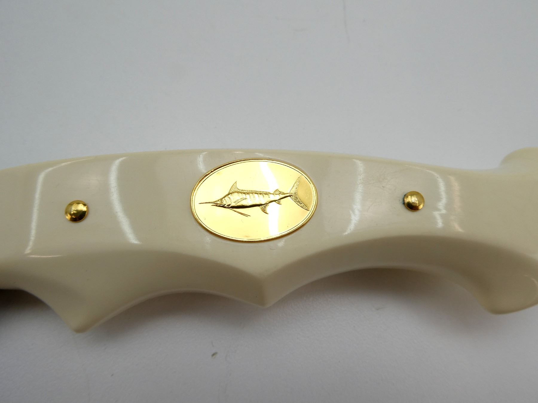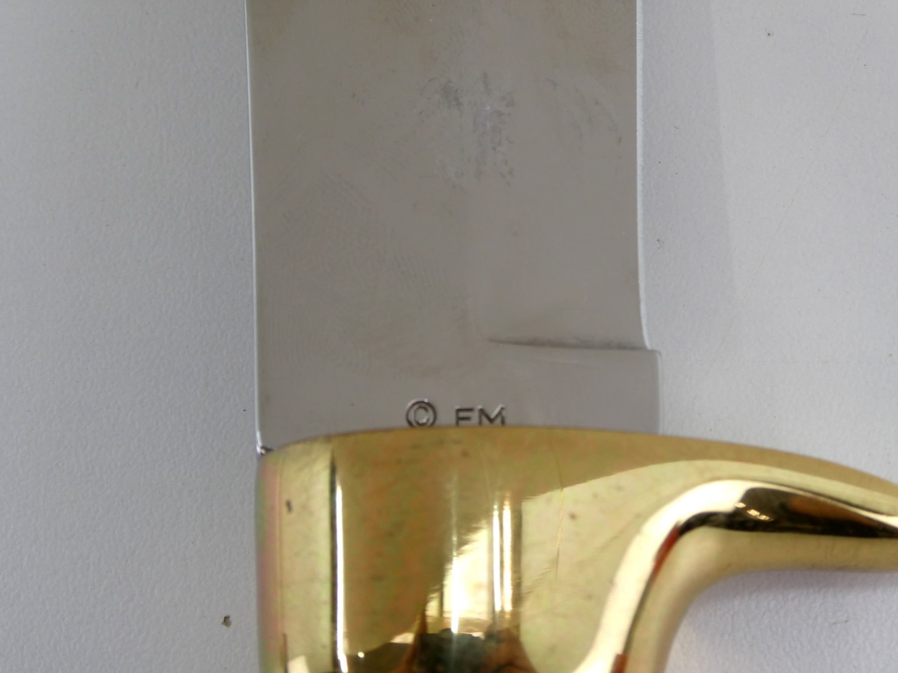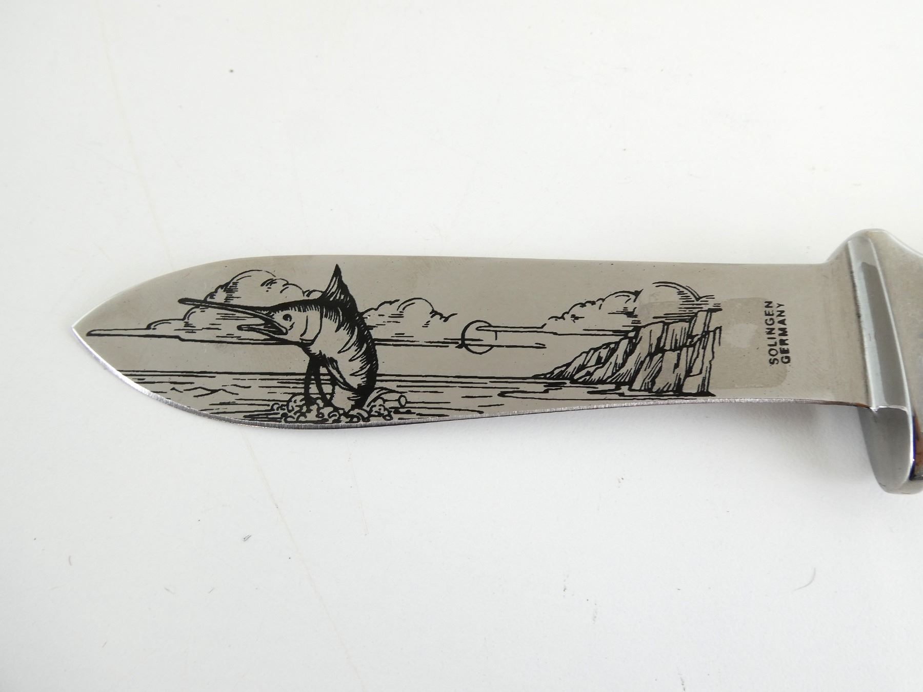 LOT INCLUDES; (1) FRANKLIN MINT FIXED BLADE KNIFE, MOUNTAIN LION ETCHED DESIGN ON BLADE, BLADE MARKED: "SOLINGEN, GERMANY", OTHER-SIDE MARKED: "C (COPYRIGHT) FM", GOLD-COLOURED / RED HANDLE, MOUNTAIN LION / COUGAR GOLD-COLOURED POMMEL, POMMEL SHOWS SLIGHT WEAR, NO SHEATH, BLADE APPROX. 8.25", OAL APPROX. 14.25", (1) FRANKLIN MINT FIXED BLADE KNIFE, MARLIN ETCHED DESIGN ON BLADE, BLADE MARKED: "SOLINGEN, GERMANY", OTHER-SIDE MARKED: "C (COPYRIGHT) FM", WHITE GRIP WITH GOLD-COLOURED MARLIN / PINS, NO SHEATH, BLADE APPROX. 4.5", OAL APPROX. 9.25" & (1) GLASS DISPLAY CASE, WOOD / GLASS CONSTRUCTION, FELT LINED INSIDE, FITTED TO FRANKLIN MINT KNIVES WITH MAGNETS TO HOLD IN PLACE, LOCKABLE, MISSING KEY, WITH RUBBER FEET ON BOTTOM, APPROX. 18.5" X 11" X 3". SEE PHOTOS. *NO GUARANTEE ON GLASS FOR SHIPPING*