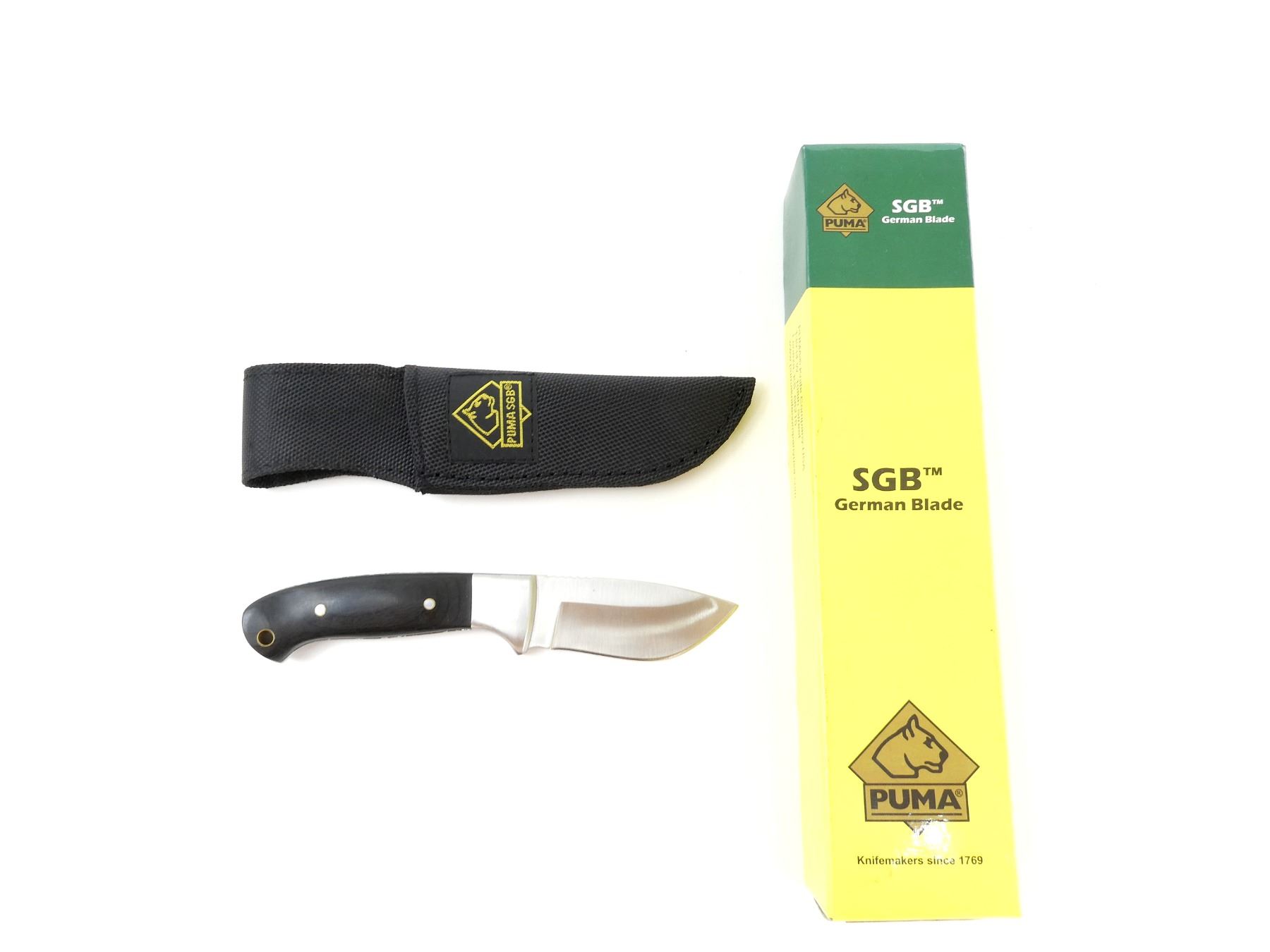 (1) FIXED BLADE KNIFE, MARKED: "PUMA SGB, SGB SP DROP 6561000, GERMAN STEEL 14/RC", 2-PIECE WOOD HANDLE WITH PUMA SGB EMBLEM, INCLUDES BLACK NYLON SHEATH, MARKED: "PUMA SGB", APPEARS NOS, WITH ORIGINAL BOX, BLADE APPROX. 3" & OAL APPROX. 7.25". SEE PHOTOS.