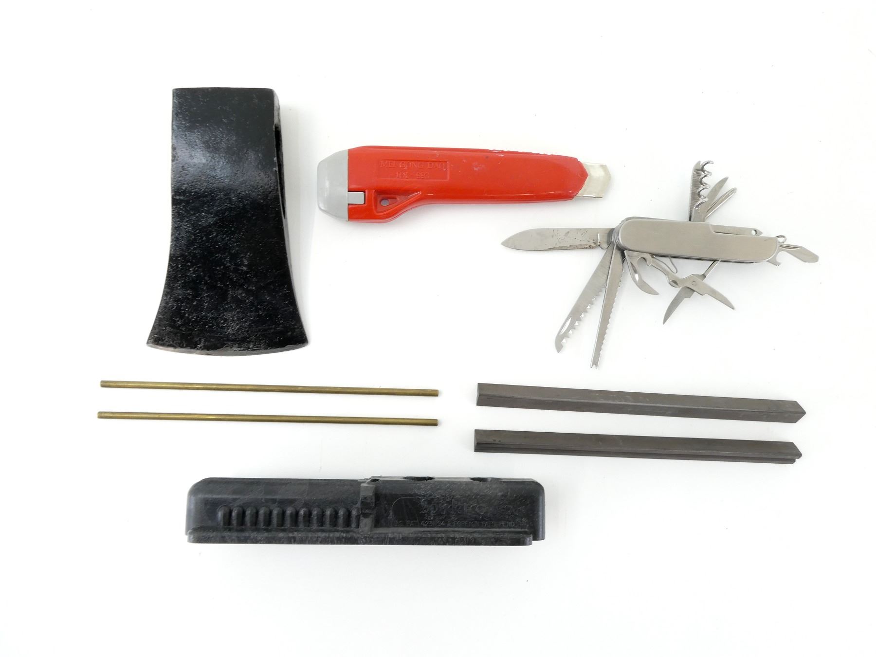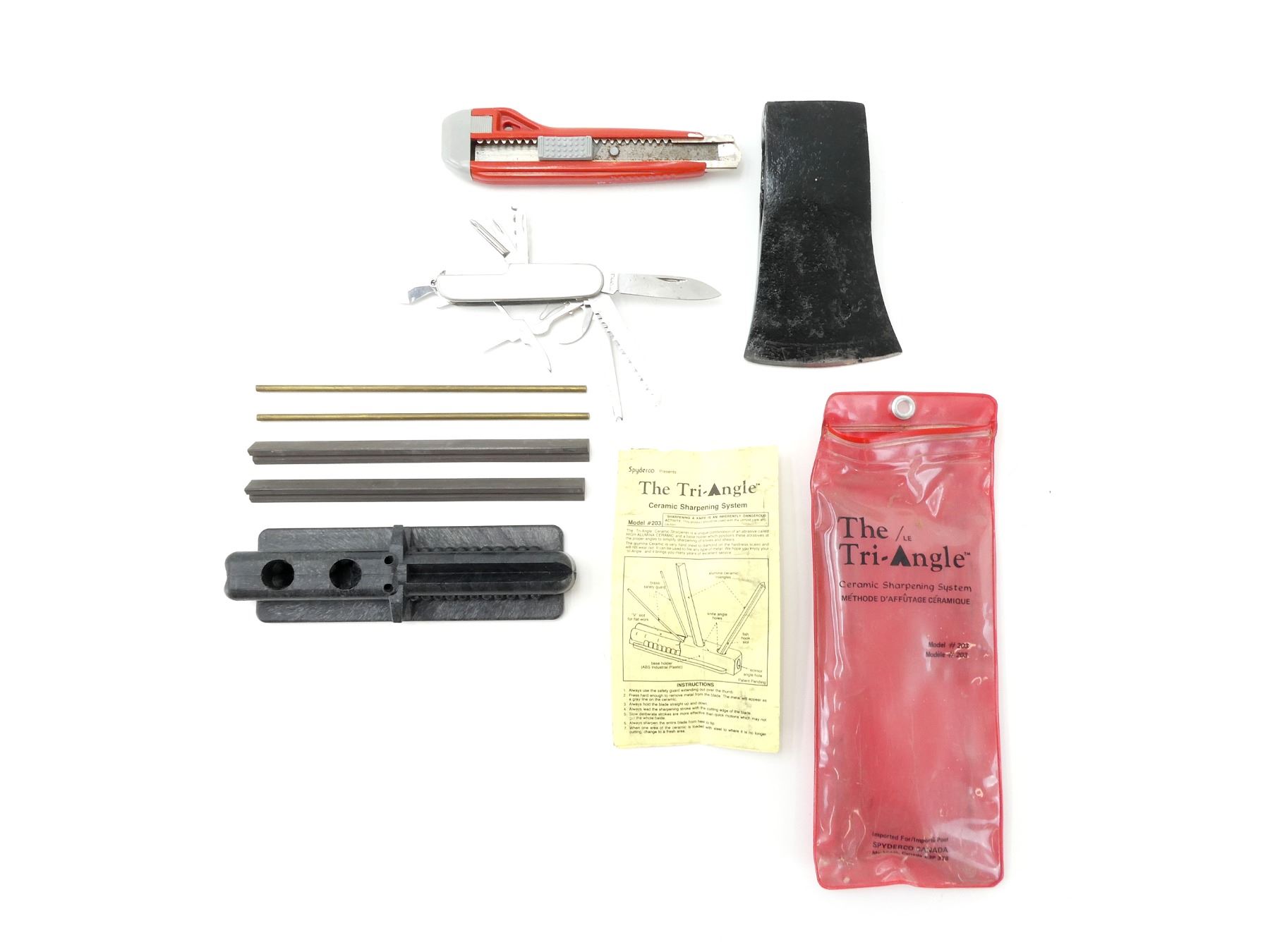 LOT INCLUDES; (1) MULTI-TOOL FOLDING KNIFE WITH BOTTLE OPENER, CAN OPENER, SAW BLADE, SMOOTH EDGED BLADE, SCISSORS, CORKSCREW, FILE, CROSS PONT SCREW DRIVER, ETC., STEEL HANDLE, NO VISIBLE MARKINGS, SMOOTH EDGE BLADE APPROX. 2 5/8", SAW BLADE APPROX. 2 5/8", SHOWS WEAR, (1) SPYDERCO THE TRIANGLE CERAMIC SHARPENING SYSTEM, WITH INSTRUCTIONS, MAY NOT BE COMPLETE, (1) UNKNOWN AXE HEAD, BLACK PAINTED, NO VISIBLE MARKINGS, SHOWS WEAR, EDGE APPROX. 3 3/8", OAL APPROX. 5.5" & (1) BOX CUTTER, RED PLASTIC HANDLE, SHOWS WEAR / RUST, MARKED: "MEI GONG DAO, RX-993". SEE PHOTOS.