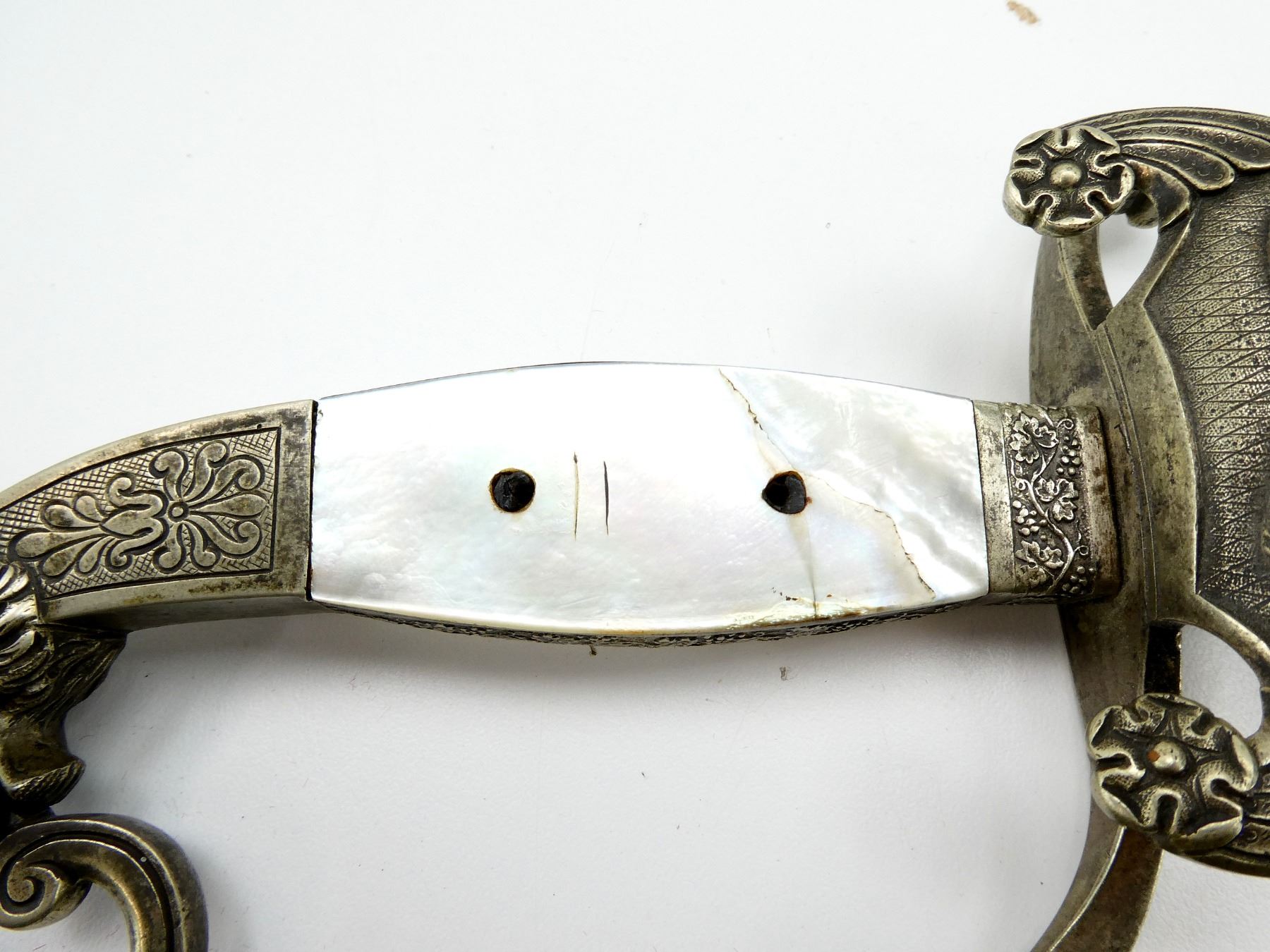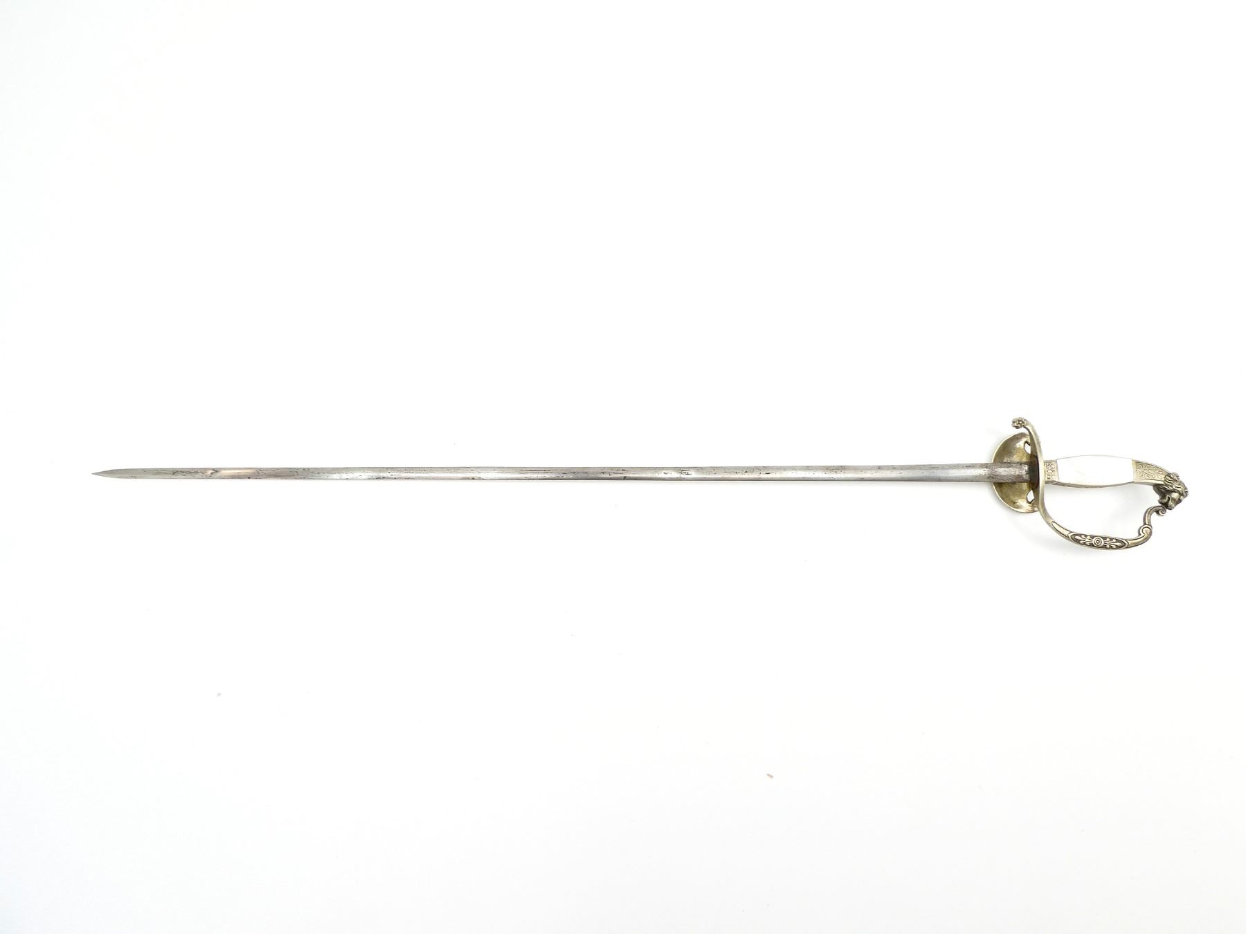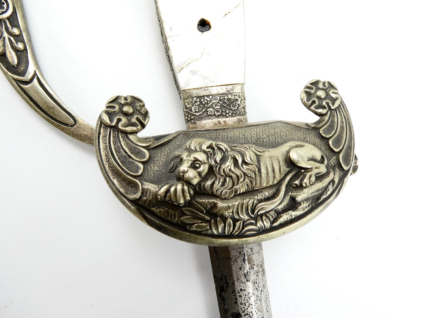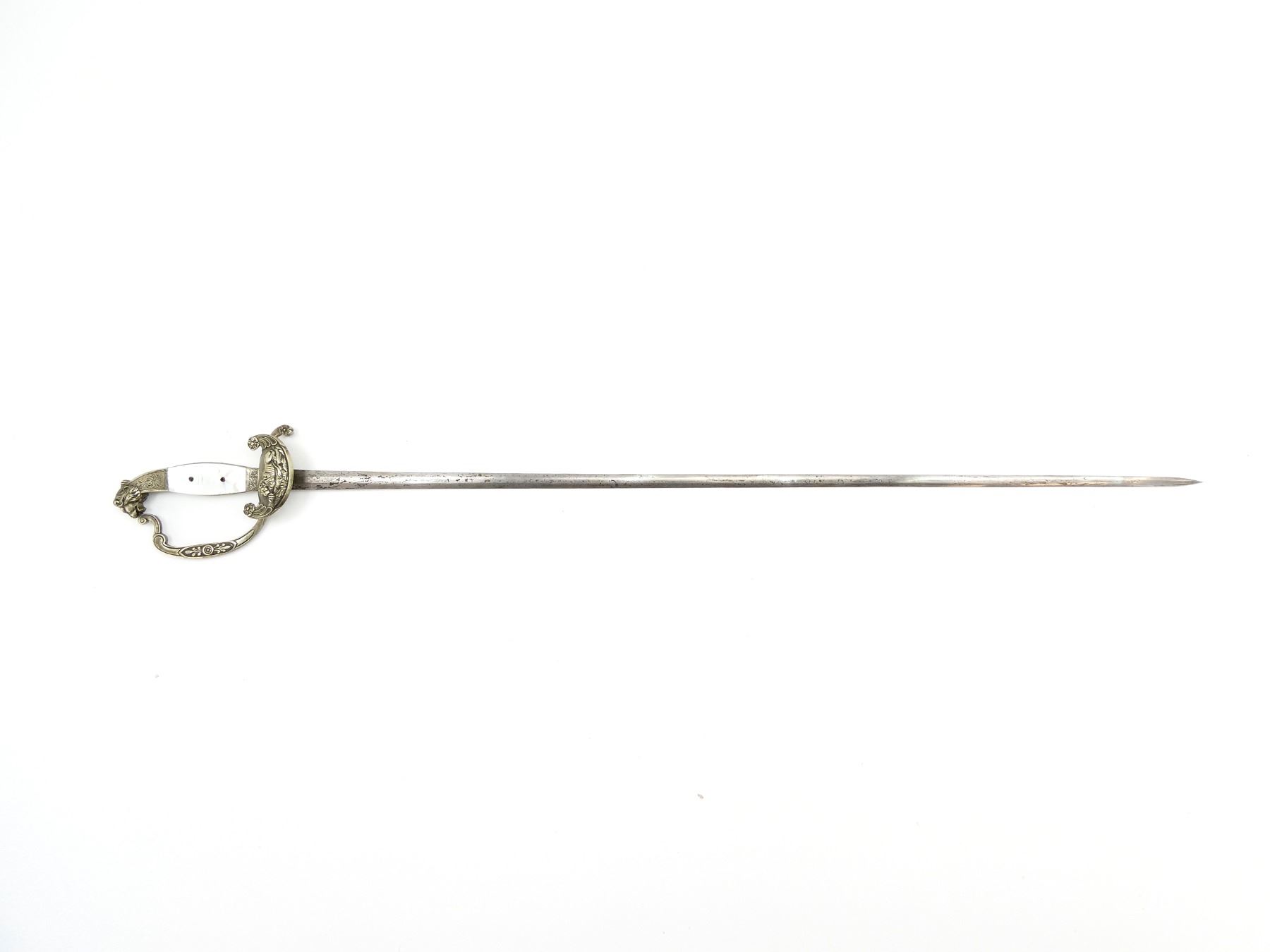 (1) STEEL BLADE, METAL GUARD, METAL & MOTHER OF PEARL HANDLE, METAL LION'S HEAD POMMEL, NO SHEATH, BLADE APPROX. 29.5" & OAL APPROX. 34.5". SEE PHOTOS.