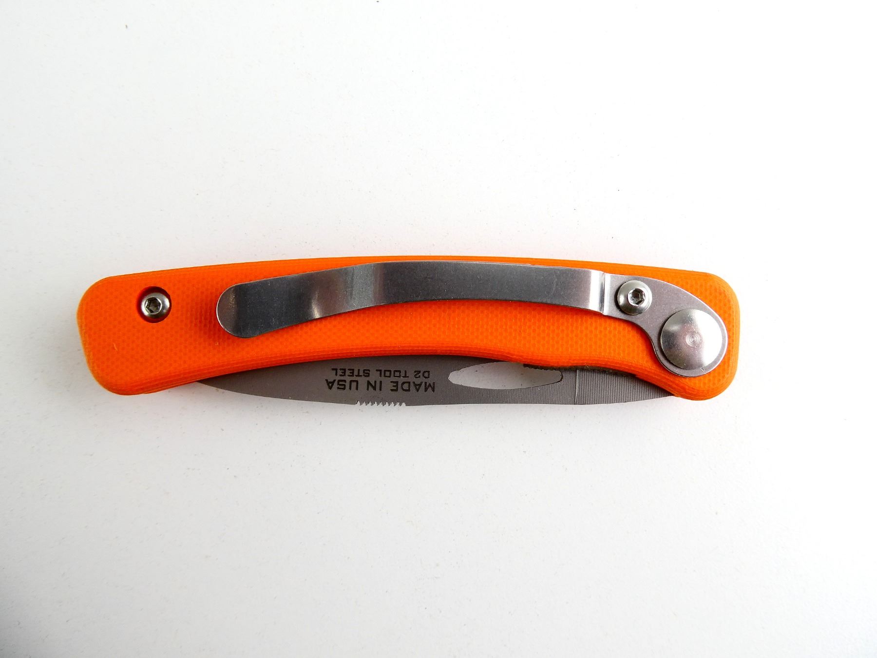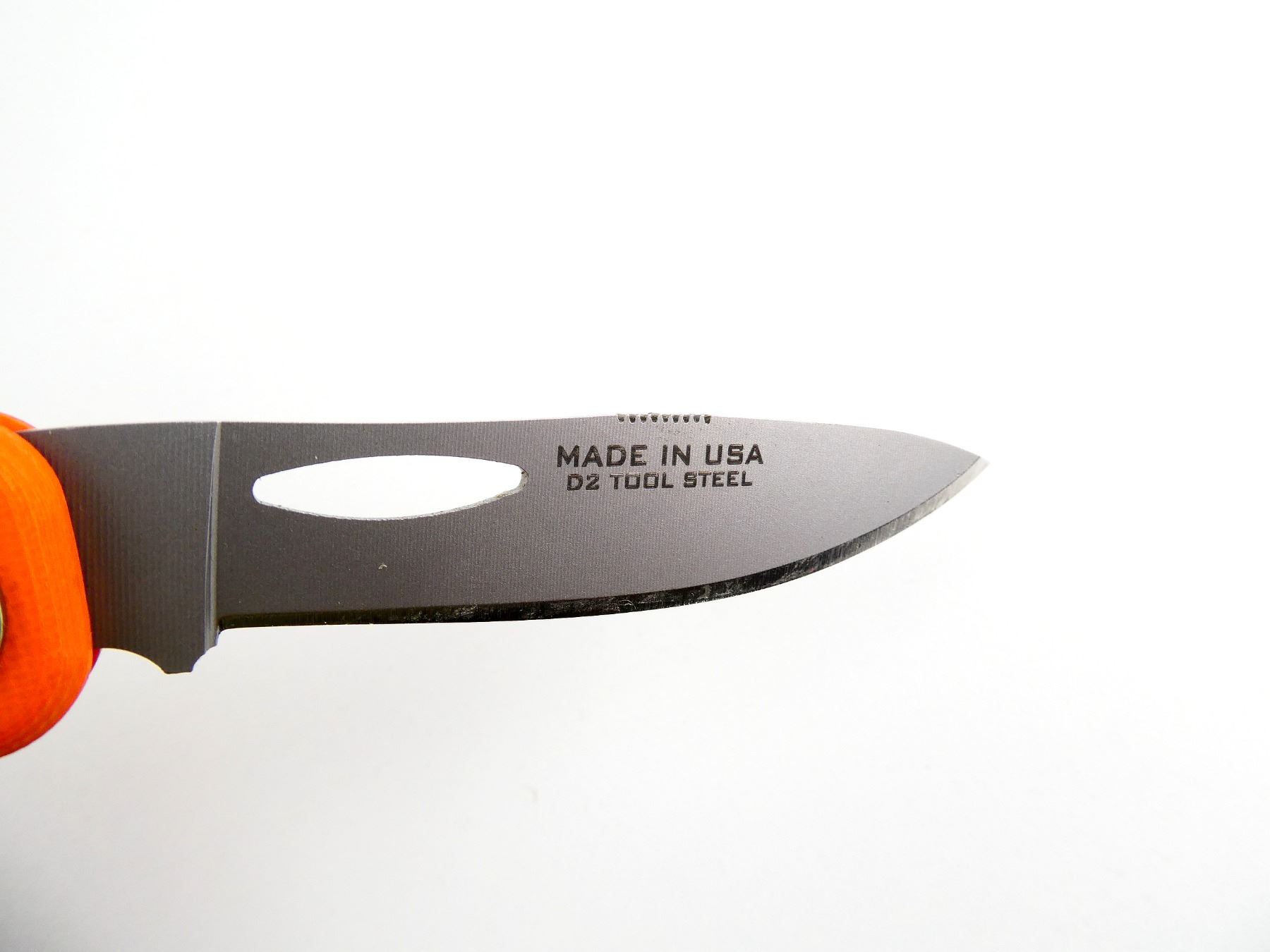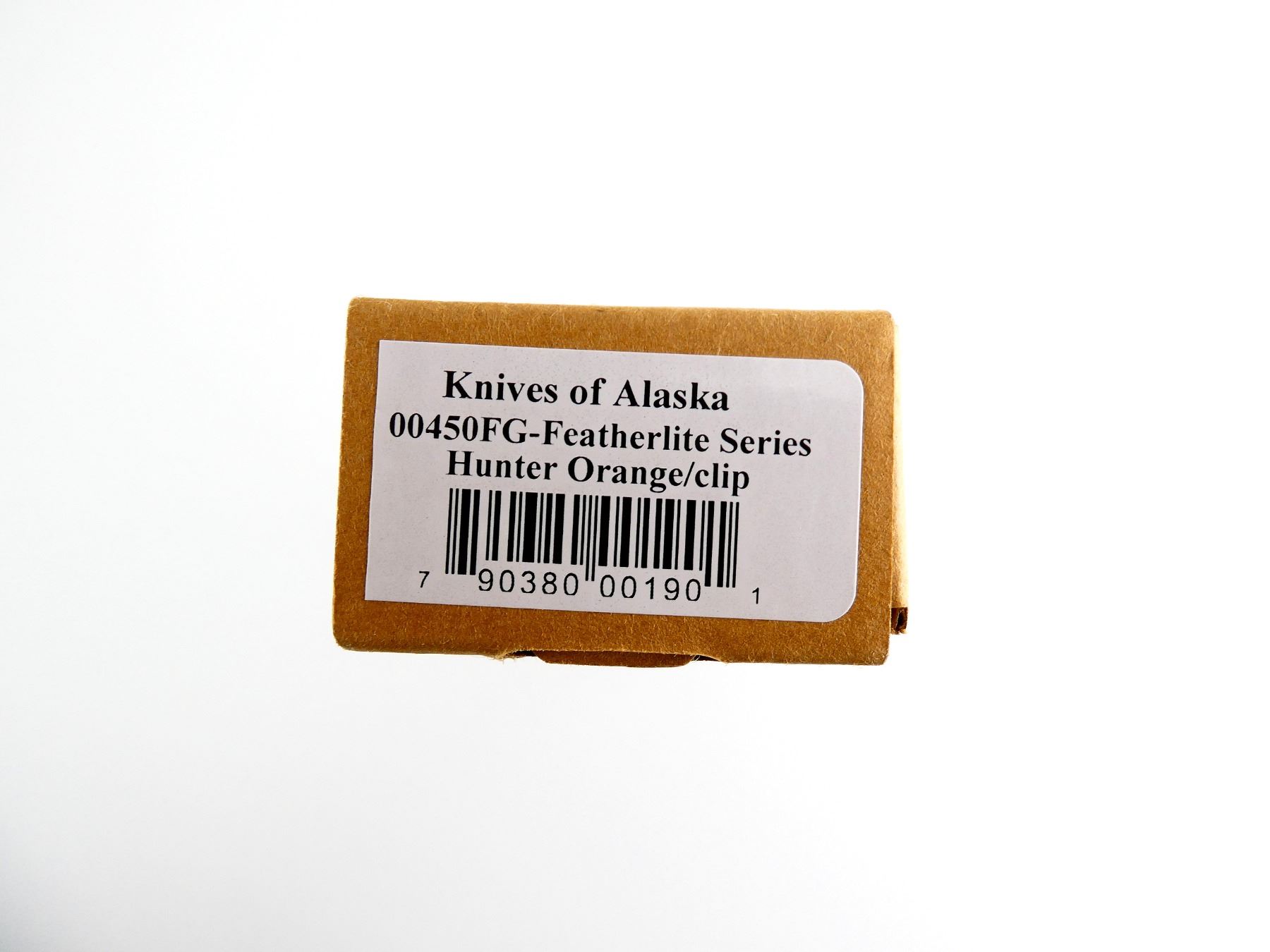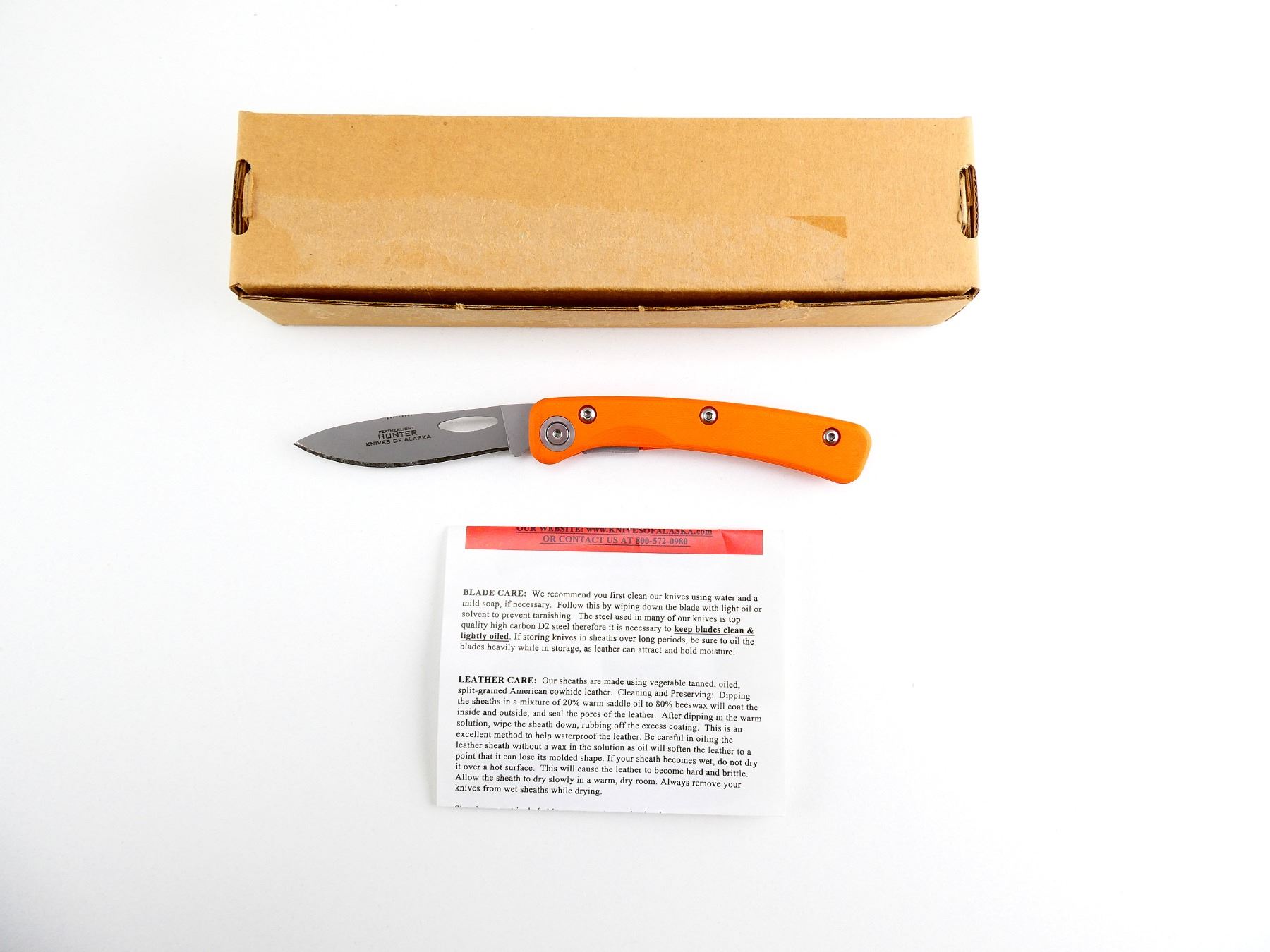 (1) STEEL FOLDING BLADE, HUNTER ORANGE HANDLE, MARKED: "FEATHERLIGHT HUNTER, KNIVES OF ALASKA" & "MADE IN USA, D2 TOOL STEEL", WITH INSTRUCTIONS, APPEARS NOS IN ORIGINAL PACKAGING, BLADE APPROX. 3" & OAL APPROX. 7.25". SEE PHOTOS.