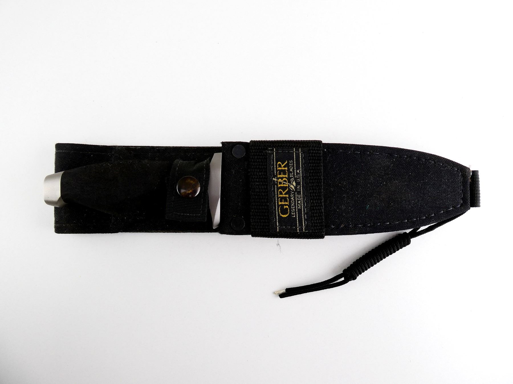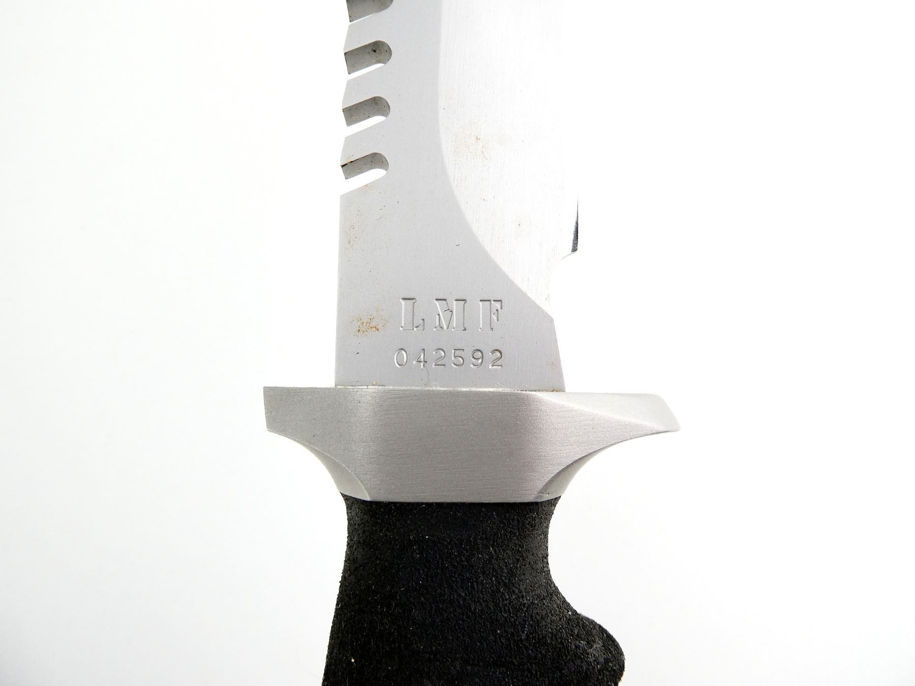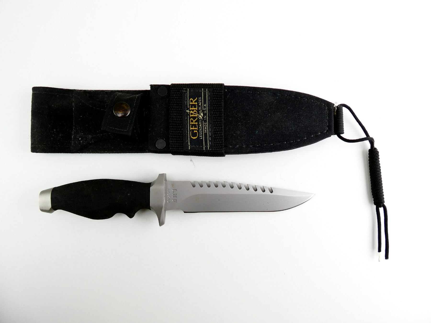 (1) METAL FIXED BLADE MARKED: "GERBER", "LMF", "042592", ETC., FOAM GRIP WITH FINGER CUT-OUT, BLACK NYLON SHEATH, BLADE APPROX. 5 7/8" & OAL APPROX. 10 5/8". SEE PHOTOS.
