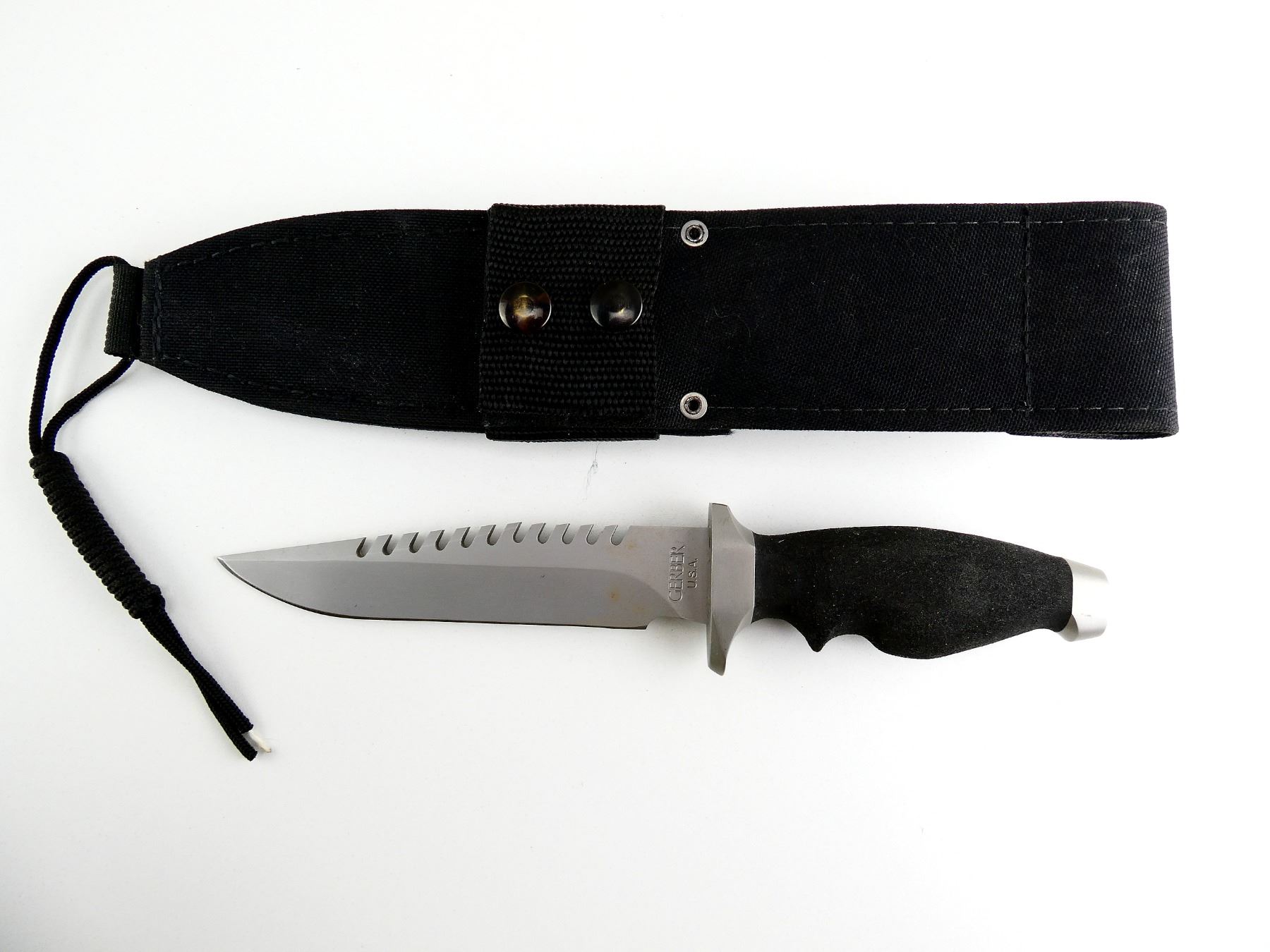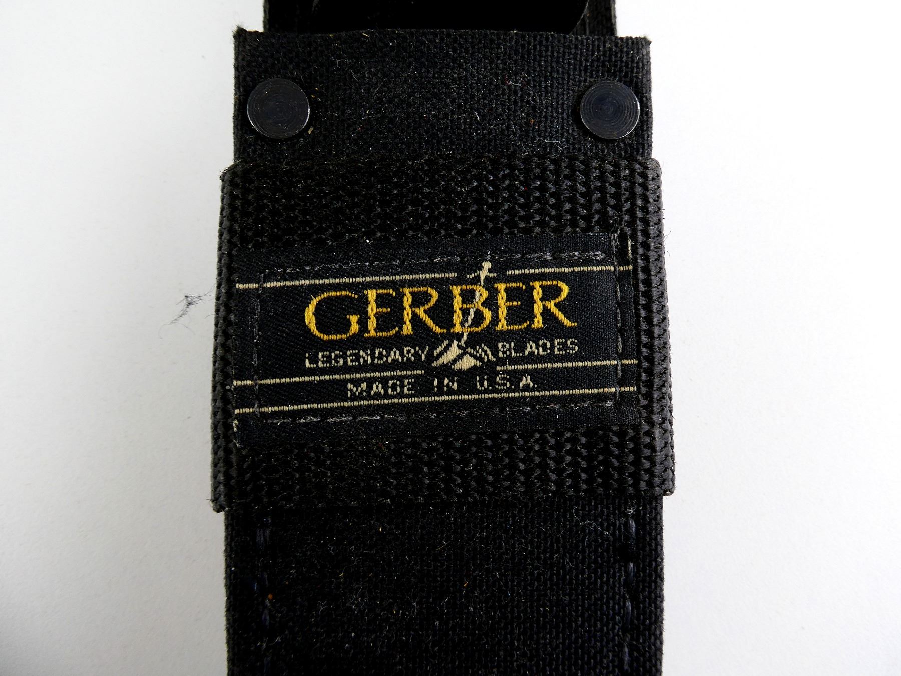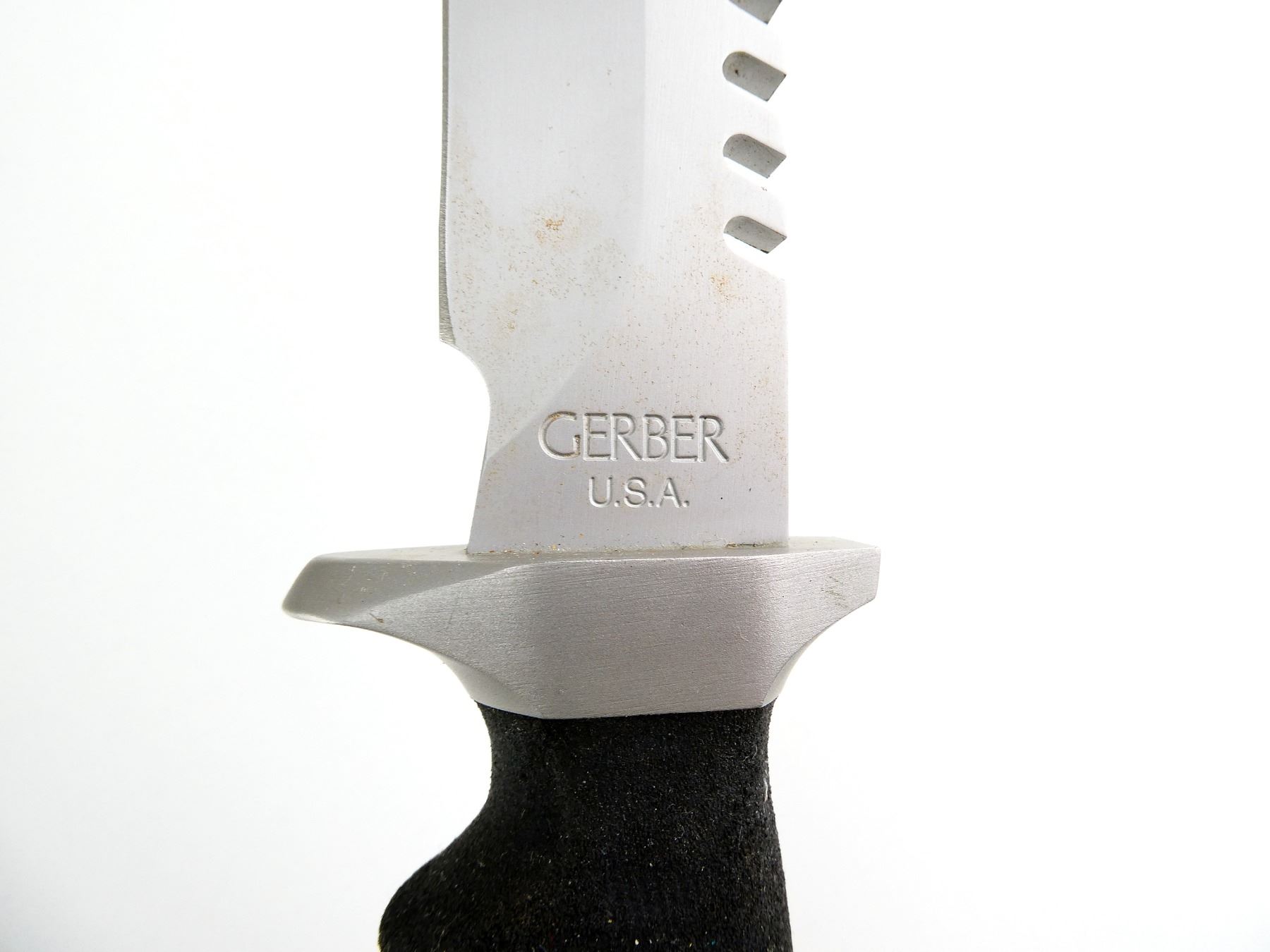 (1) METAL FIXED BLADE MARKED: "GERBER", "LMF", "042592", ETC., FOAM GRIP WITH FINGER CUT-OUT, BLACK NYLON SHEATH, BLADE APPROX. 5 7/8" & OAL APPROX. 10 5/8". SEE PHOTOS.