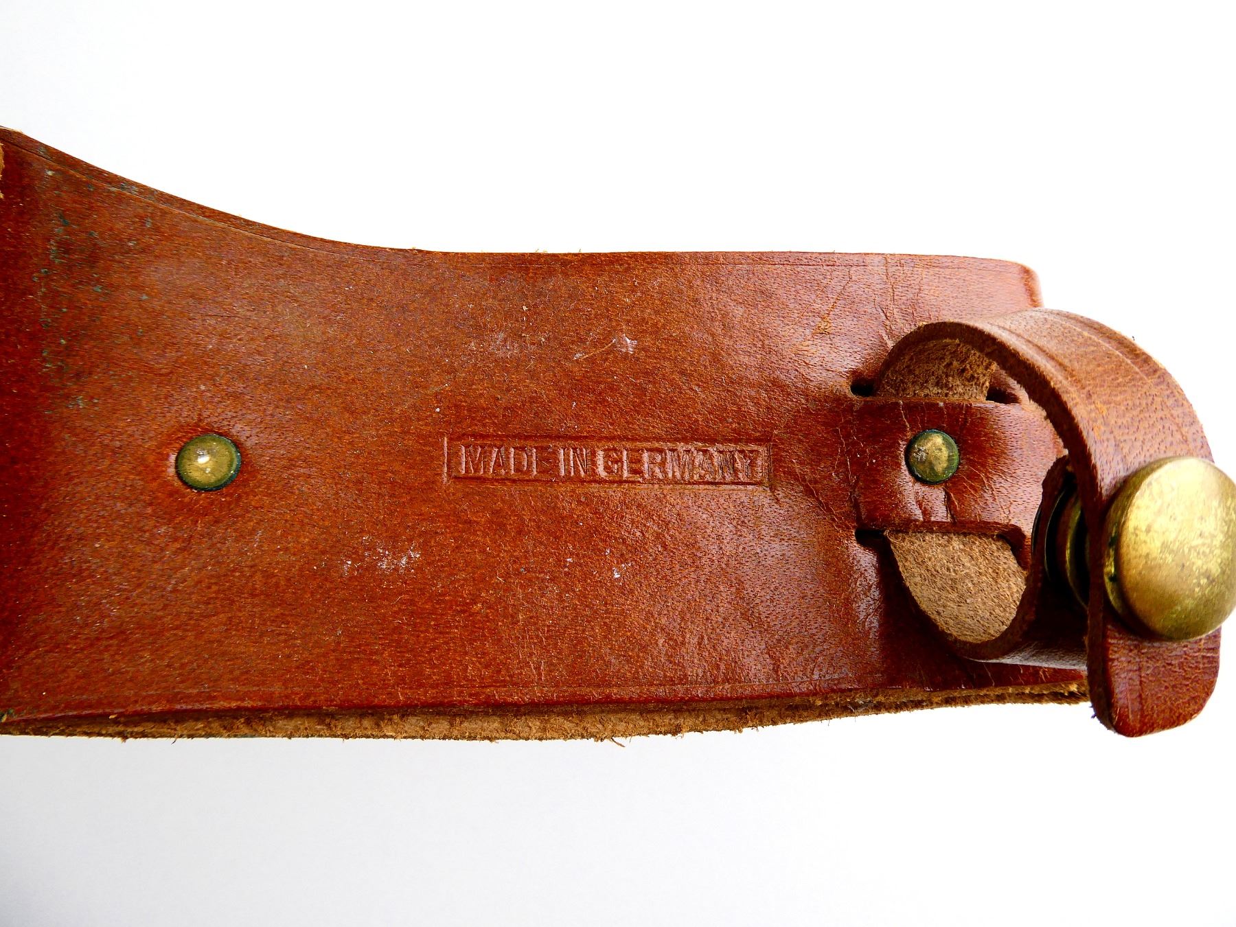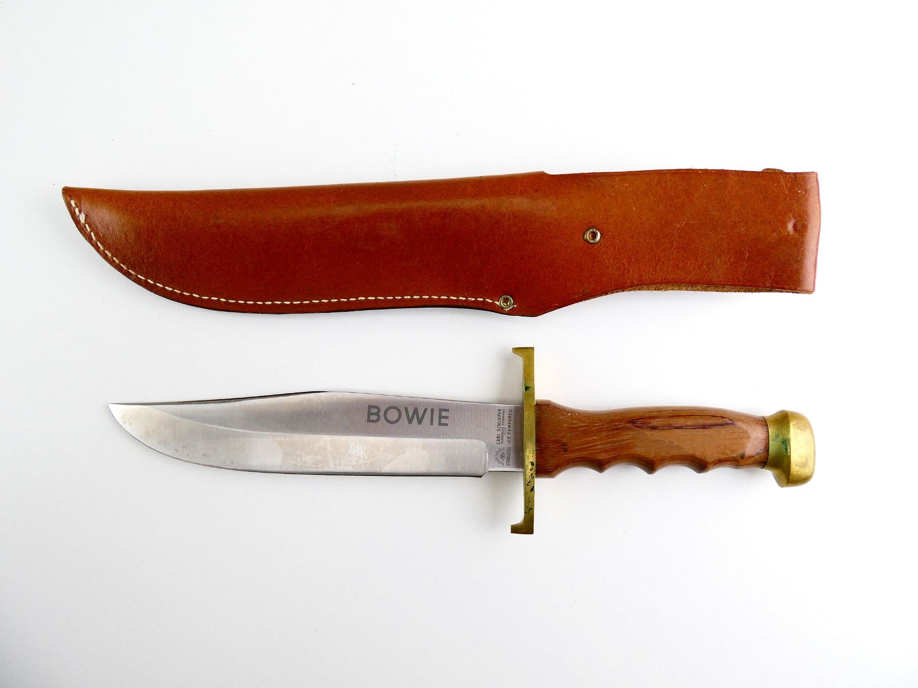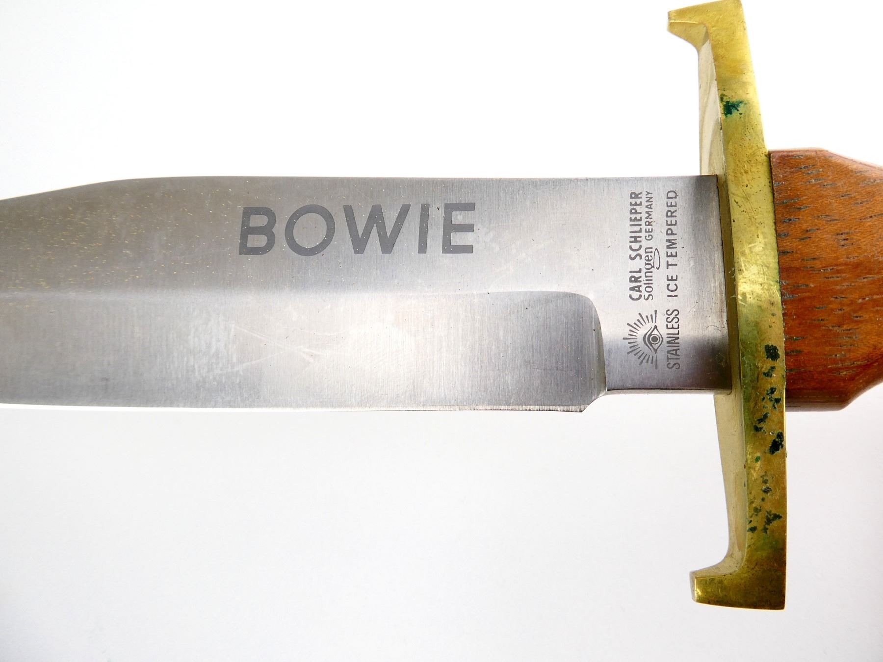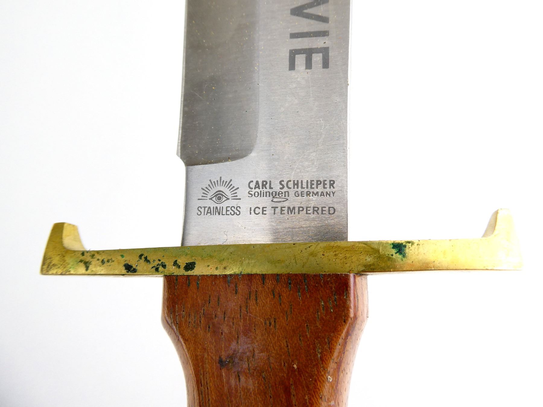 (1) METAL FIXED BLADE MARKED: "BOWIE", "CARL SCHLIEPER, SOLINGEN, GERMANY", ETC., BRASS POMMEL, WOOD GRIP, BROWN LEATHER SHEATH, BLADE APPROX. 7.75" & OAL APPROX. 12.75". SEE PHOTOS.