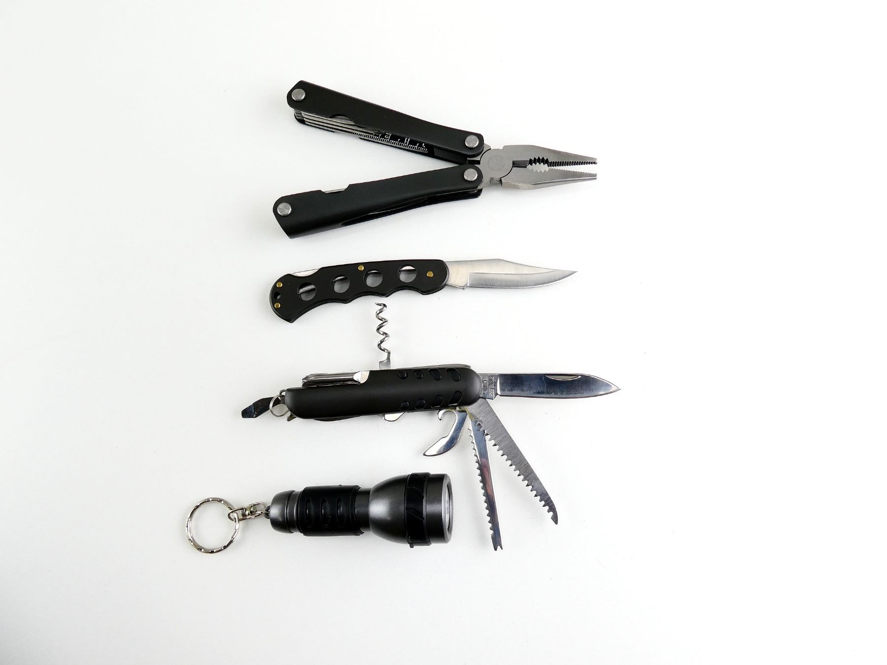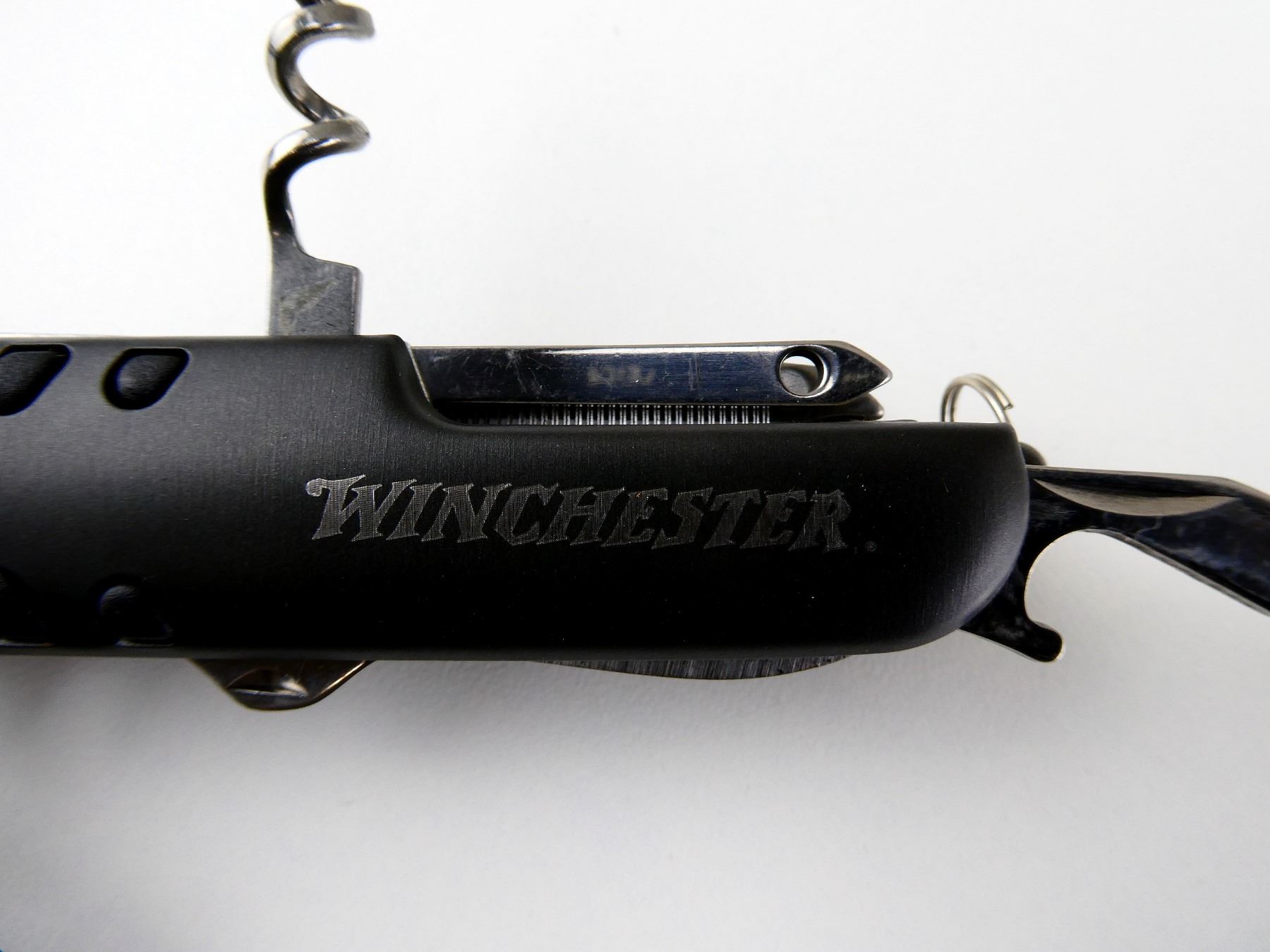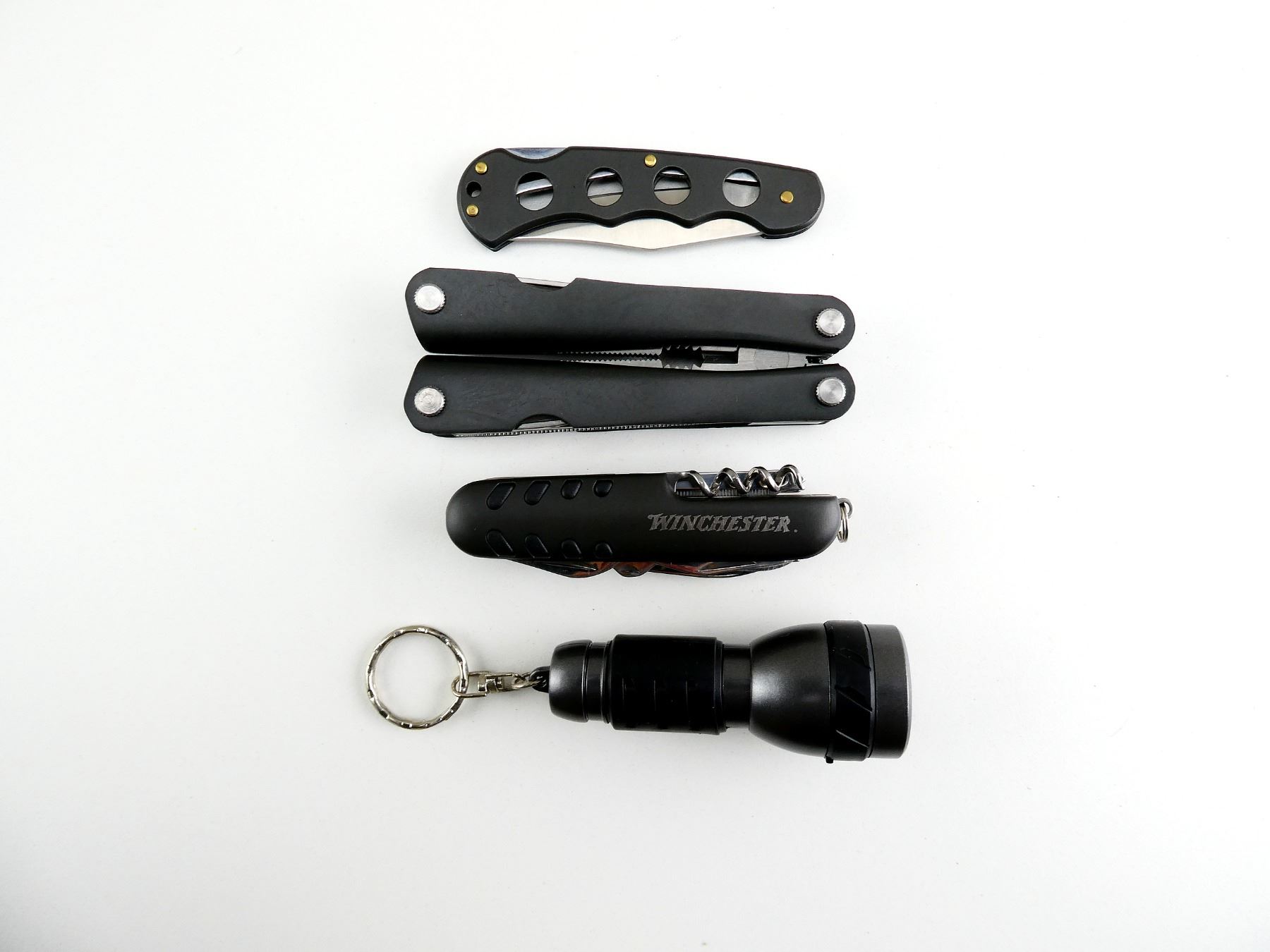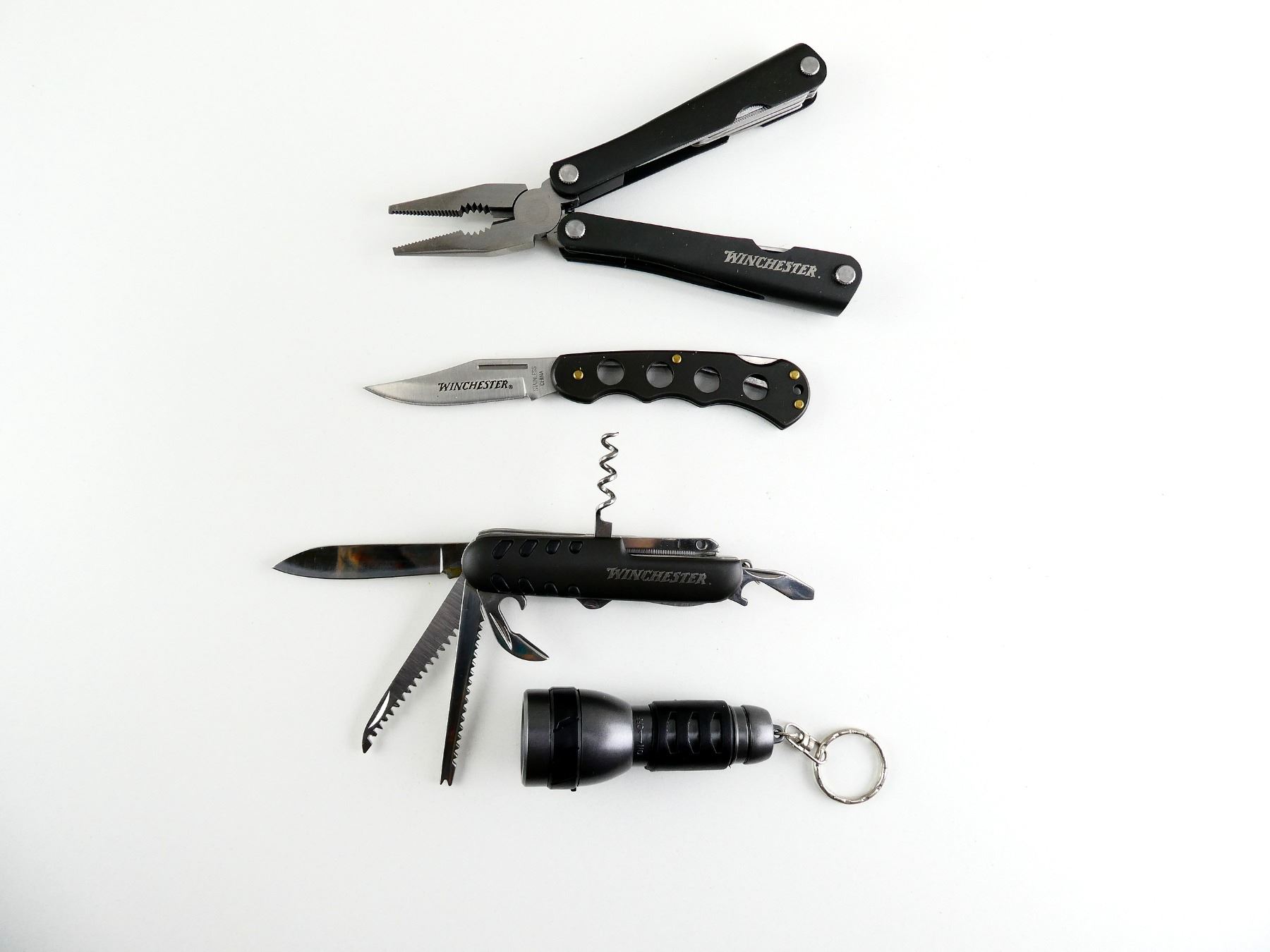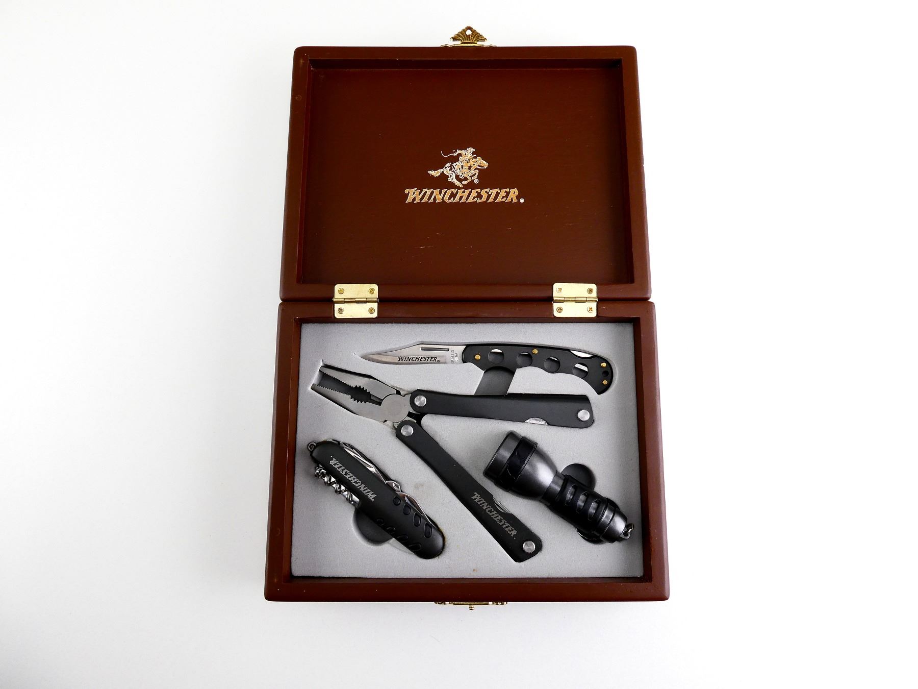 (1) COLLECTIBLE WINCHESTER KNIFE AND ACCESSORIES INCLUDING PLIERS, FLASHLIGHT & SWISS ARMY-STYLE KNIFE. SEE PHOTOS.