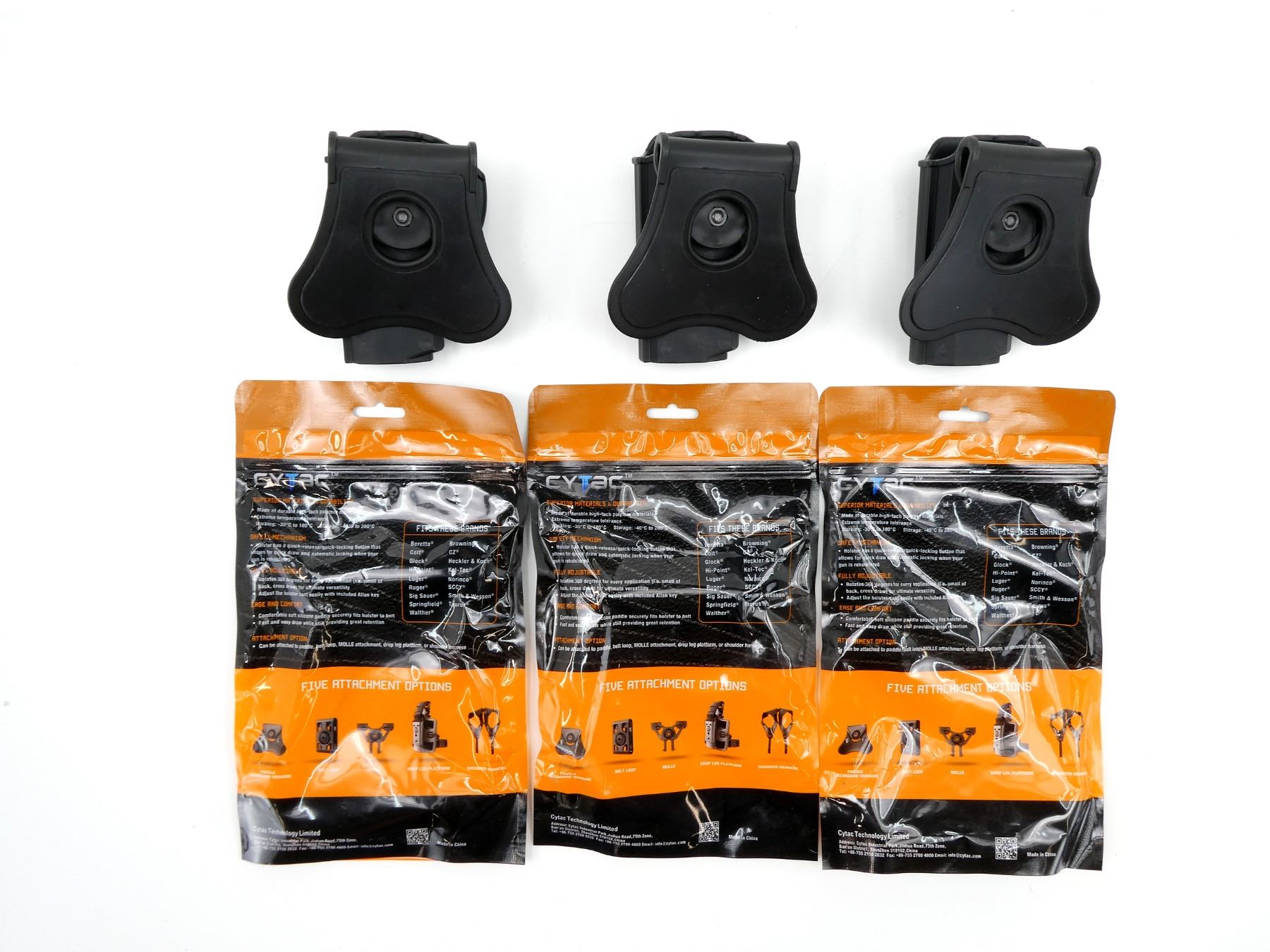 LOT INCLUDES; (3) CYTAC CY-PX4 PISTOL HOLSTER, FITS RIGHT HANDED BERETTA PX4 STORM PISTOLS, BLACK POLYMER CONSTRUCTION, PADDLE STYLE, APPEARS NOS IN ORIGINAL PACKAGING. SEE PHOTOS.