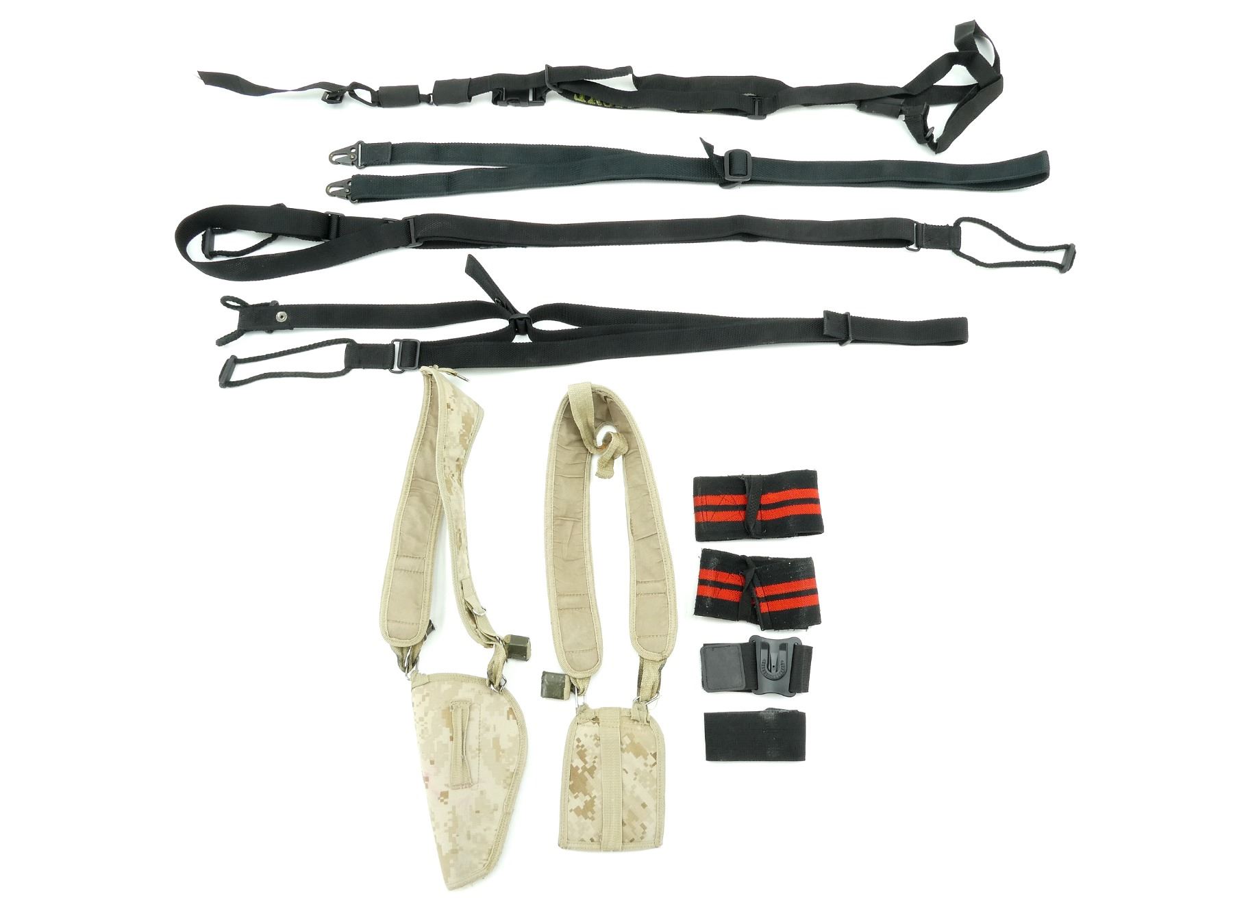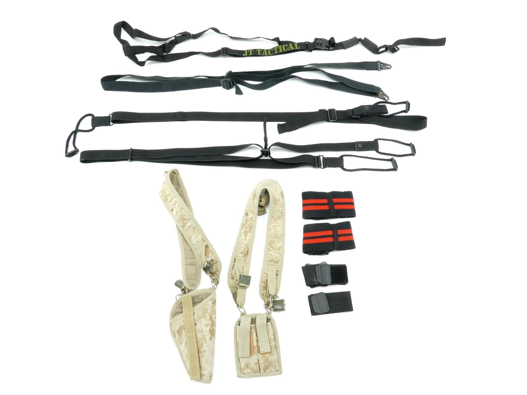 LOT INCLUDES; CAMOUFLAGE SUSPENDERS, BLACK NYLON TACTICAL SLINGS, STRAPS, ETC. SEE PHOTOS.