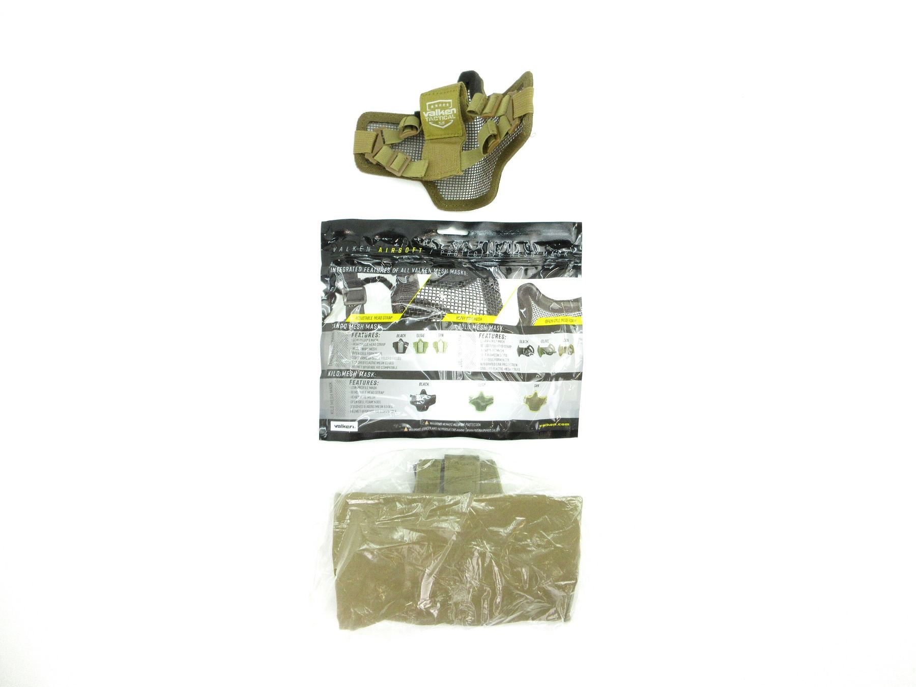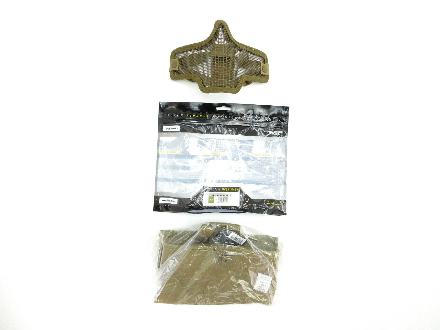 LOT INCLUDES; (1) C-TAC DUMP POUCH, COYOTE BROWN, NYLON CONSTRUCTION, MOLLE COMPATIBLE, WITH BUNGEE CLOSURE, NOS, UNOPENED & (1) VALKEN KILO AIRSOFT MESH MASK, TAN, STEEL & NYLON CONSTRUCTION, ONE SIZE FITS MOST, FULL COVERAGE, PROTECTS LOWER FACE, NOSE & MOUTH, WITH GLUED & STITCHED SEAMS FOR DURABILITY, PADDED NOSE BRIDGE & FULLY BREATHABLE, APPEARS NOS, IN ORIGINAL PACKAGING. SEE PHOTOS.