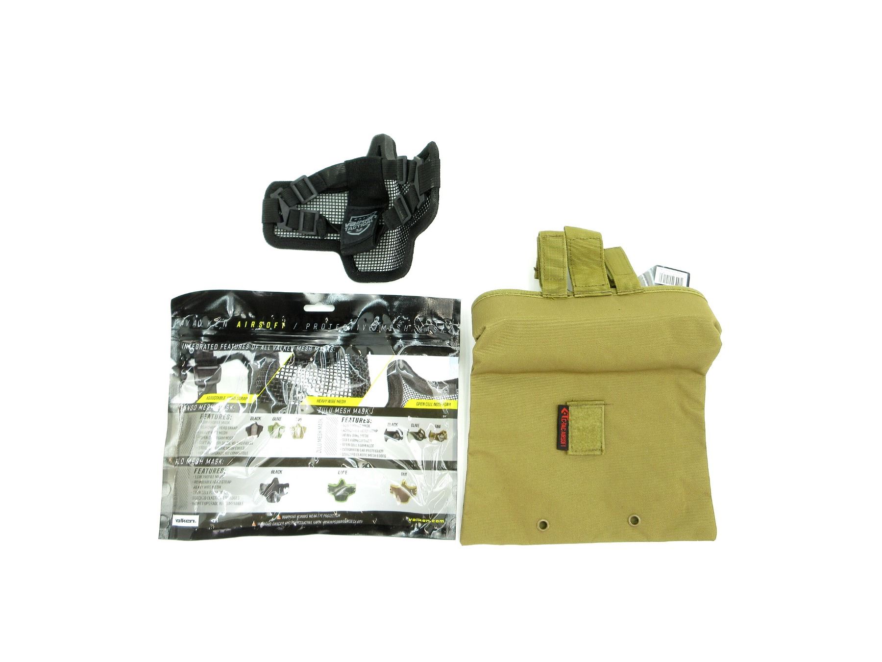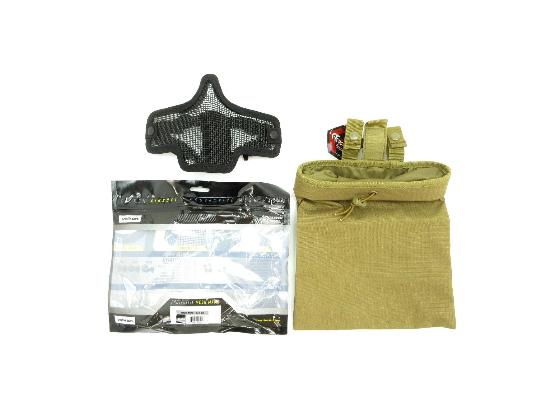 LOT INCLUDES; (1) C-TAC DUMP POUCH, COYOTE BROWN, NYLON CONSTRUCTION, MOLLE COMPATIBLE, WITH BUNGEE CLOSURE & (1) VALKEN KILO AIRSOFT MESH MASK, TAN, STEEL & NYLON CONSTRUCTION, ONE SIZE FITS MOST, FULL COVERAGE, PROTECTS LOWER FACE, NOSE & MOUTH, WITH GLUED & STITCHED SEAMS FOR DURABILITY, PADDED NOSE BRIDGE & FULLY BREATHABLE, APPEARS NOS, IN ORIGINAL PACKAGING. SEE PHOTOS.