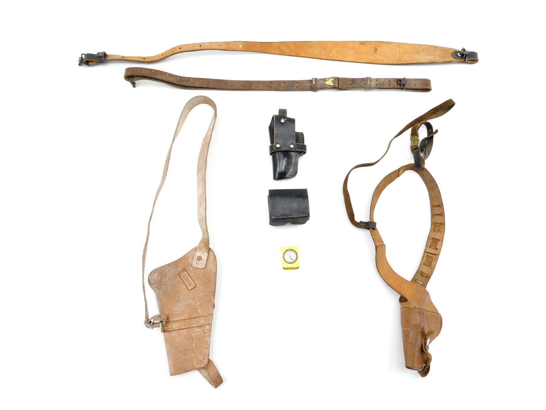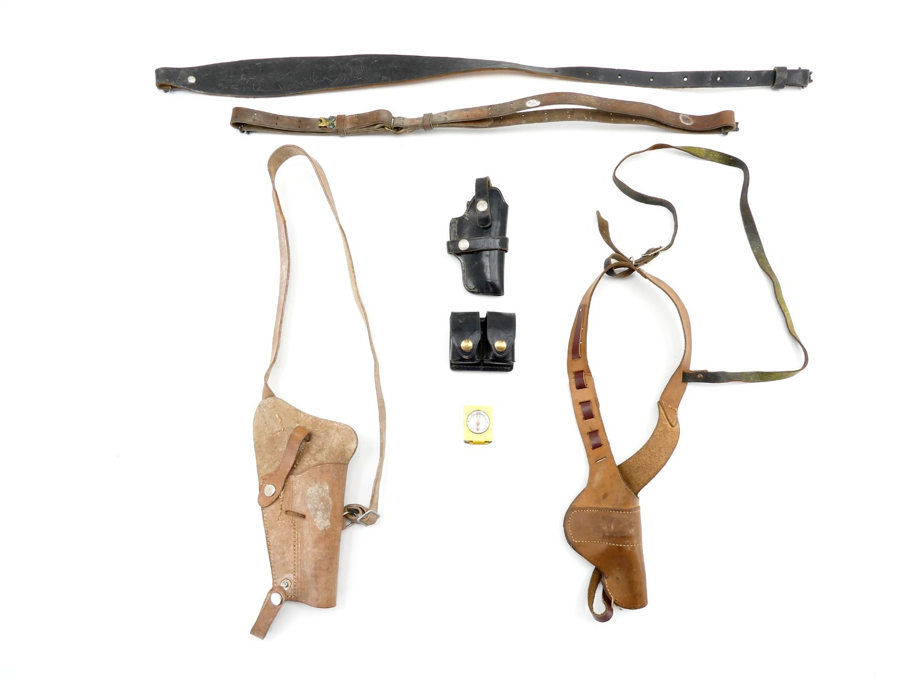 LOT INCLUDES; (1) RIGHT HAND BROWN LEATHER LARGE FRAME SHOULDER HOLSTER, (1) LEFT HAND BROWN LEATHER SMALL FRAME SHOULDER HOLSTER, (1) RIGHT HAND BLACK LEATHER SMALL FRAME HOLSTER, (1) DOUBLE-POCKET SPEED LOADER POUCH, (1) UNKNOWN BROWN LEATHER RIFLE SLING & (1) UNKNOWN BLACK LEATHER RIFLE SLING. SEE PHOTOS.