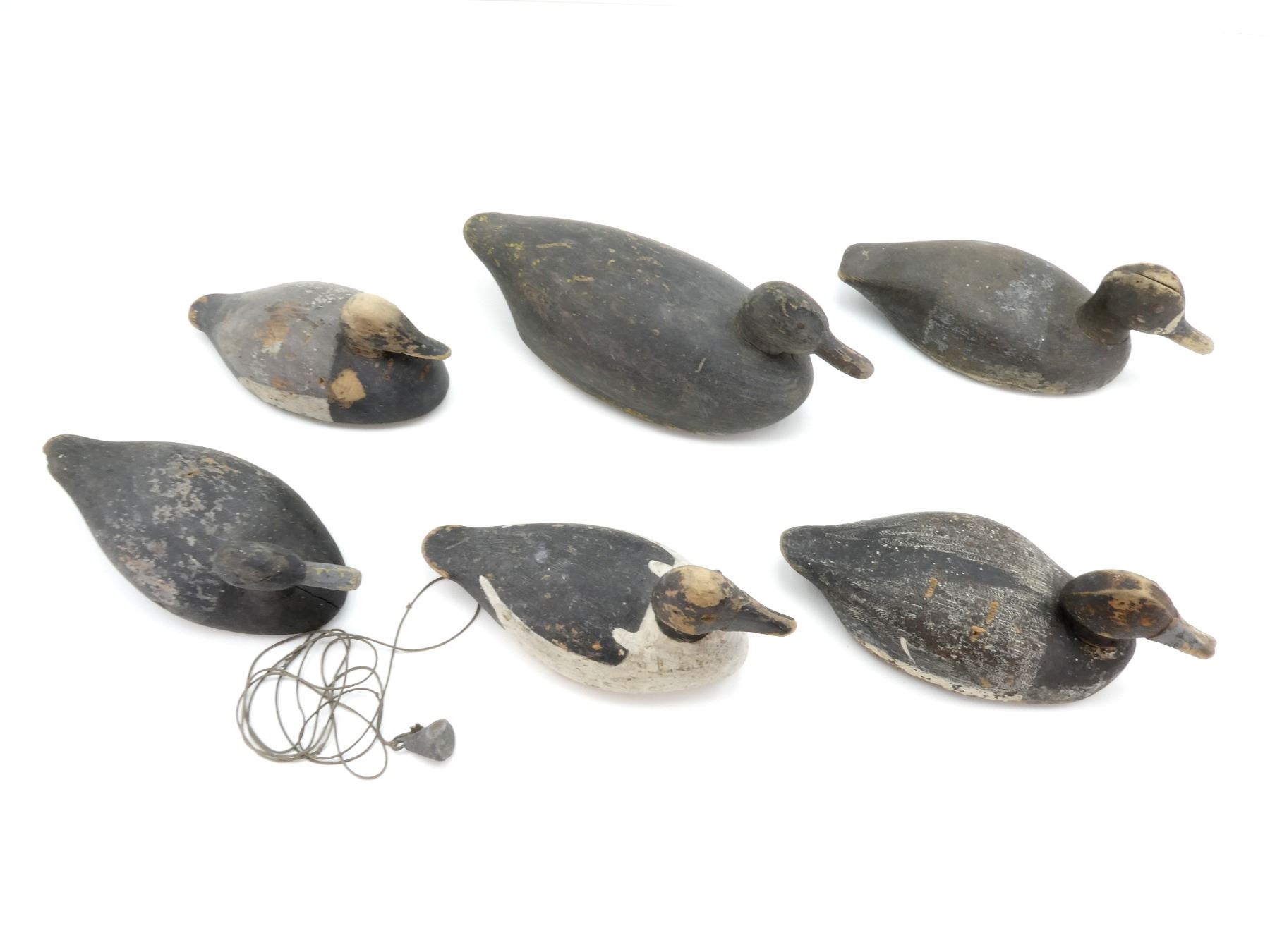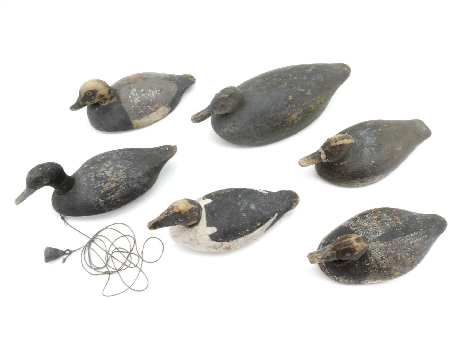 LOT INCLUDES; (6) WOODEN DUCK DECOYS, VARIOUS SIZES, SOME WITH WEIGHTS / SOME WITHOUT, VARIOUS COLOURS / PAINTED, SOME WITH VARIOUS ETCHINGS / MARKINGS, SHOWS WEAR / TEAR. SEE PHOTOS.