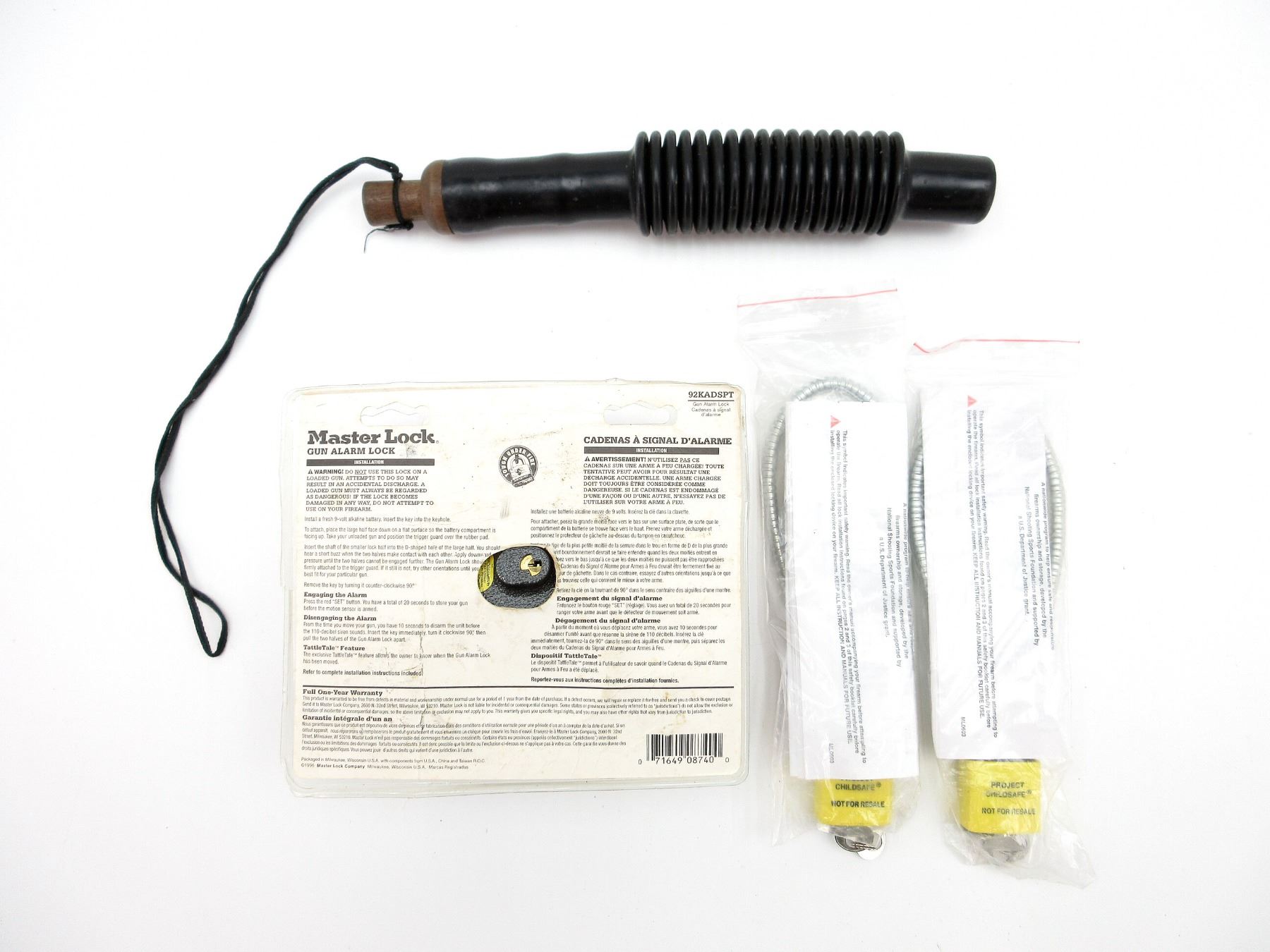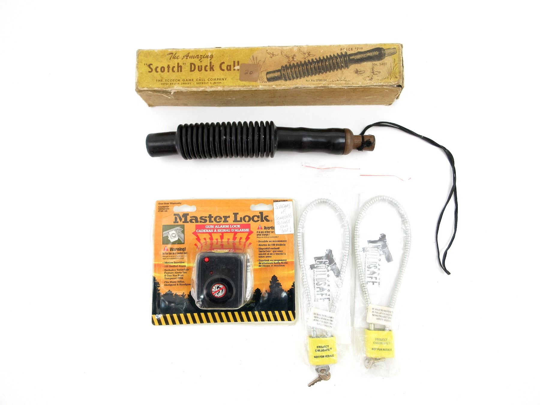 LOT INCLUDES; (2) PROJECT CHILDSAFE CABLE LOCKS, WITH KEYS / INSTRUCTIONS, (1) MASTER LOCK GUN ALARM LOCK, MOTION SENSITIVE, 110 DECIBEL ALARM, ALERTS IF GUN HAS BEEN TAMPERED WITH, FITS VARIOUS RIFLES / SHOTGUNS / HANDGUNS, NOS, UN-OPENED & (1) "SCOTCH" DUCK CALL, NO.1401, WITH ORIGINAL BOX, BLACK RUBBER / WOOD CONSTRUCTION, OAL APPROX. 11.5". SEE PHOTOS.